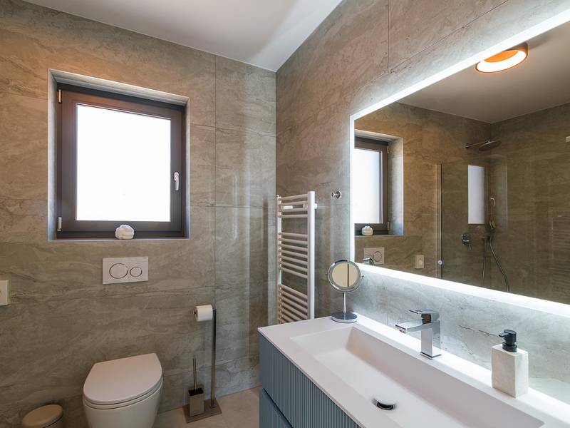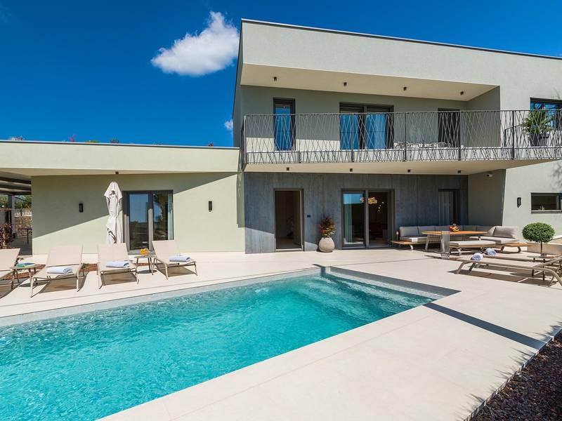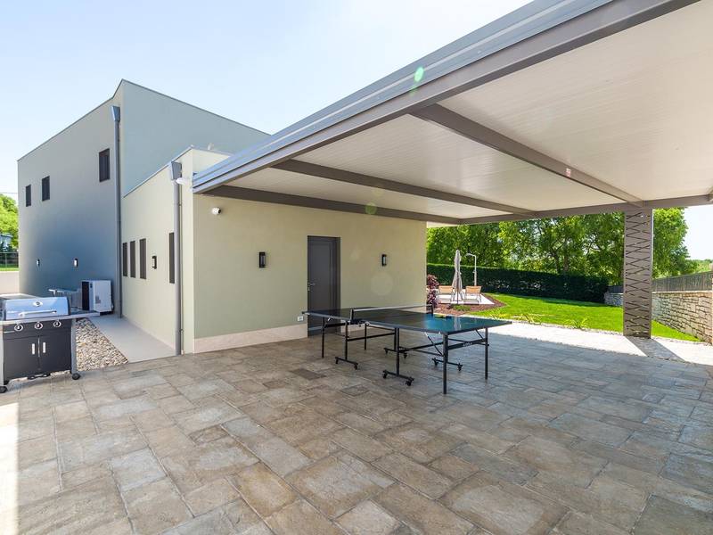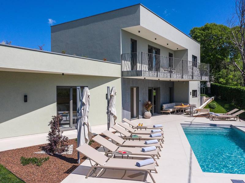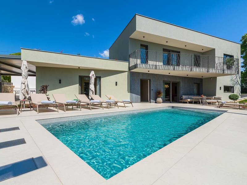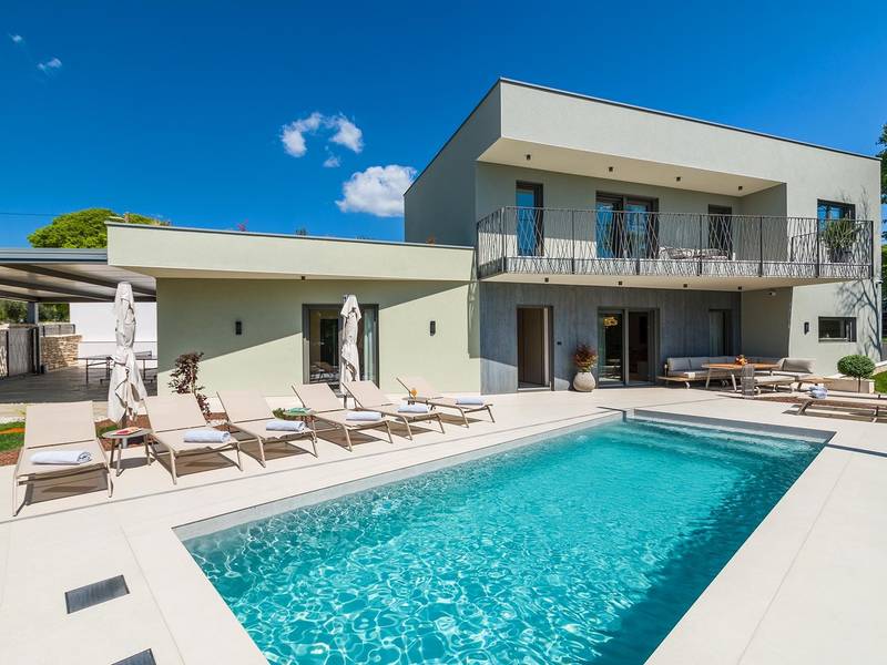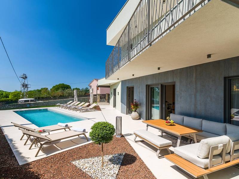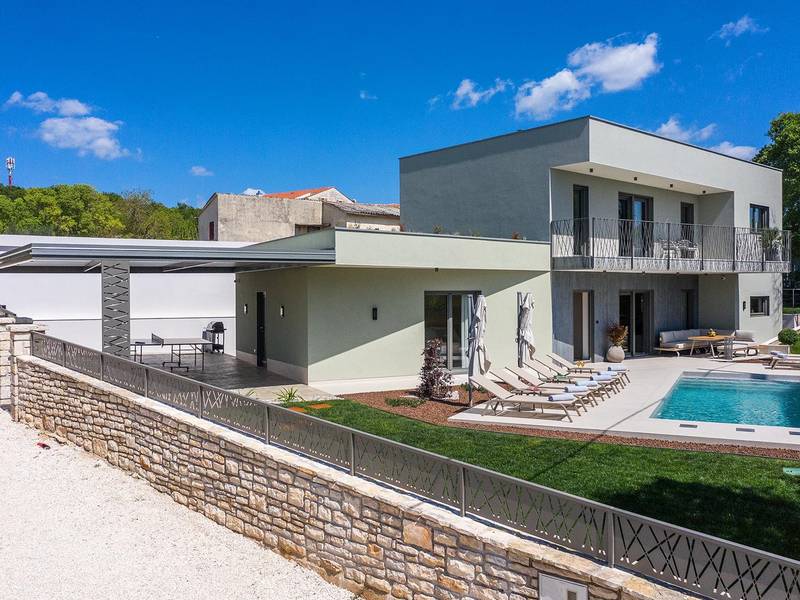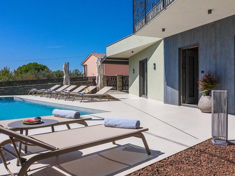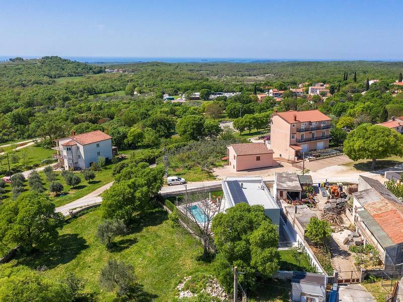 Die Villa Golden Hill ist eine exklusive 5-Sterne-Villa in dem ruhigen istrischen Dorf Golaš, in der Nähe von Bale. Umgeben von Natur und Grün, bietet diese moderne Villa ein hohes Maß an Privatsphäre und diskreten Luxus, ideal für einen erholsamen Aufenthalt in Istrien. Die Villa erstreckt sich über 225 m2 und wurde sorgfältig entworfen, um Funktionalität und Ästhetik zu kombinieren. Im Erdgeschoss befindet sich ein geräumiger, lichtdurchfluteter Wohnbereich, der mit einer modernen, voll ausgestatteten Küche und einem Essbereich verbunden ist. Die offene Raumaufteilung schafft eine einladende Atmosphäre, während der direkte Zugang zur überdachten Terrasse für einen nahtlosen Übergang zwischen Innen- und Außenbereich sorgt. Ein Schlafzimmer befindet sich im Erdgeschoss mit direktem Zugang zum Pool, während sich die beiden anderen elegant gestalteten Schlafzimmer im Obergeschoss befinden. Alle Schlafzimmer sind mit eigenem Bad, Klimaanlage und TV ausgestattet. Große Betten (200x210 cm) sorgen für außergewöhnlichen Komfort, während Zusatzbetten eine flexible Unterbringung für Familien ermöglichen. Der Außenbereich bietet ein komplettes Wohnerlebnis unter freiem Himmel. Der private Swimmingpool (24 m2) ist von Sonnenliegen und einem angelegten Garten umgeben, während die überdachte Terrasse mit Essbereich im Freien zu entspannten Mahlzeiten einlädt. Ein Gasgrill unterstreicht den mediterranen Lebensstil. Das Grundstück ist vollständig eingezäunt und als Grünfläche angelegt, was Privatsphäre und Ruhe garantiert. Die Villa Golden Hill ist mit einer Fußbodenheizung und einer Klimaanlage ausgestattet, die das ganze Jahr über für Komfort sorgen. WiFi, ein Safe, eine Waschmaschine, ein Trockner und alle wichtigen Haushaltsgegenstände stehen für einen sorgenfreien Aufenthalt zur Verfügung. Die Villa befindet sich in einer ruhigen Umgebung und ist dennoch gut angebunden - ein Restaurant ist nur 200 Meter entfernt, während die Geschäfte in Bale nur eine kurze Autofahrt entfernt sind. Das Meer und die Strände sind ca. 12 km entfernt, und der Flughafen Pula ist 25 km entfernt. Die Villa Golden Hill bietet ein perfektes Gleichgewicht zwischen modernem Komfort, Privatsphäre und natürlicher Umgebung - ein idealer Ort für einen wirklich erholsamen Aufenthalt in Istrien. Das Haus ist nicht für Jugendgruppen geeignet. Haustiere sind nicht erlaubt. Rauchen ist im Haus nicht gestattet.