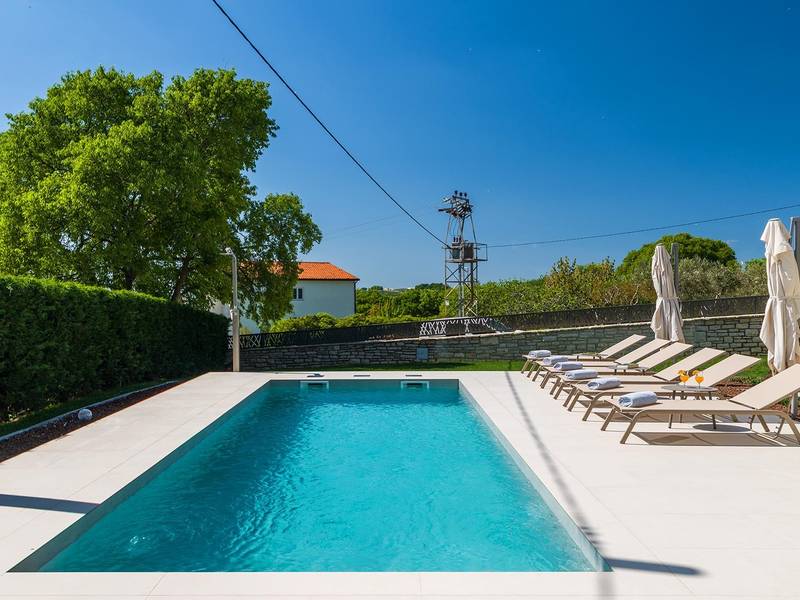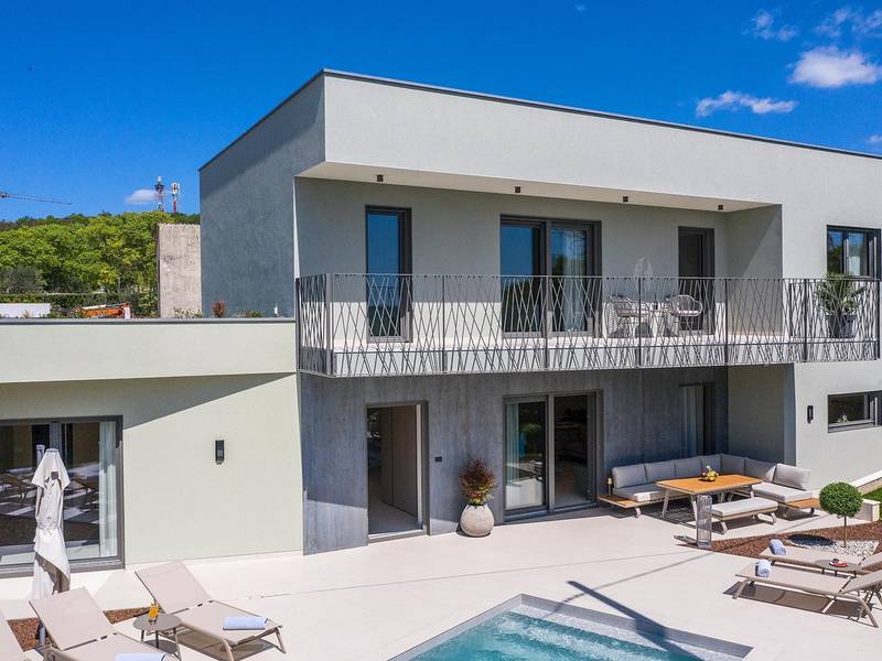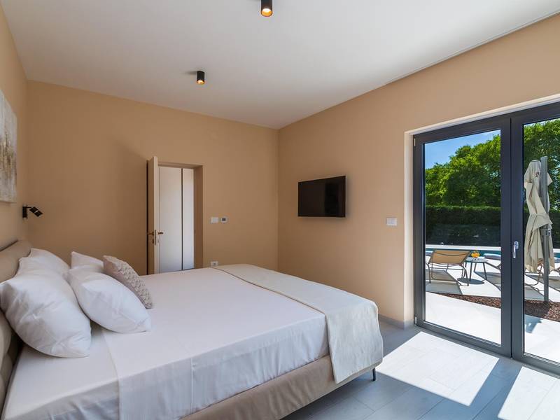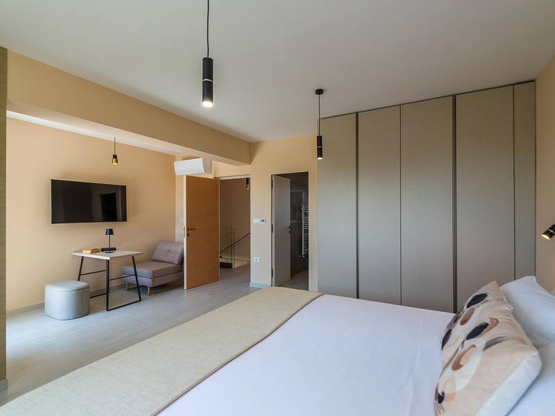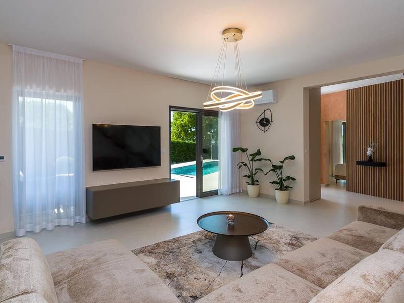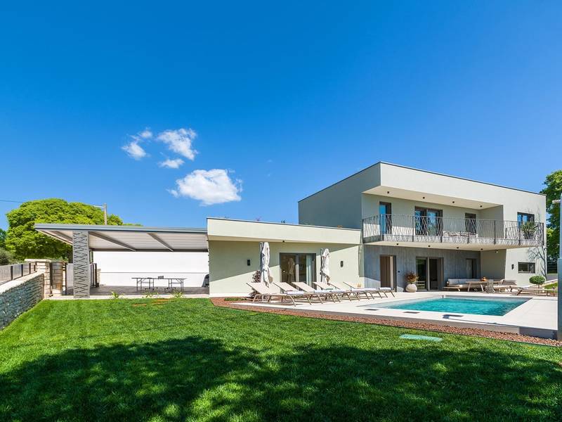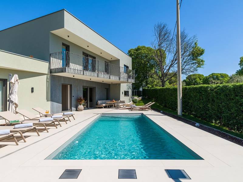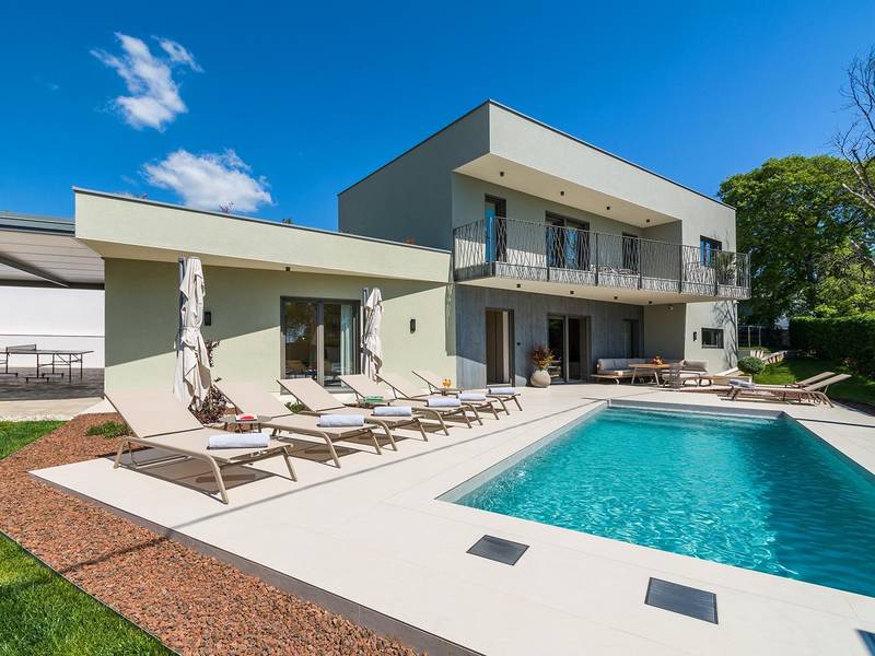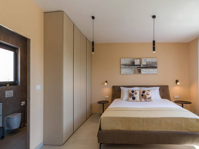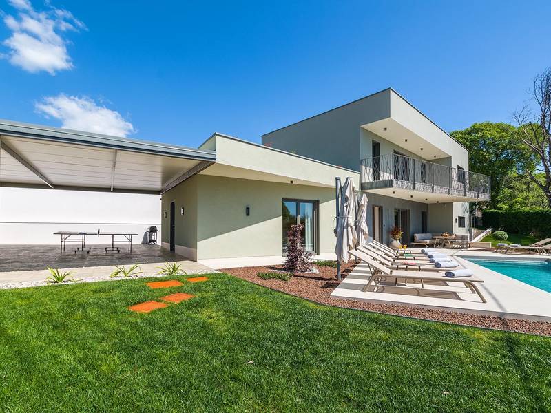 Die Villa Golden Hill ist eine exklusive 5-Sterne-Villa in dem ruhigen istrischen Dorf Golaš, in der Nähe von Bale. Umgeben von Natur und Grün, bietet diese moderne Villa ein hohes Maß an Privatsphäre und diskreten Luxus, ideal für einen erholsamen Aufenthalt in Istrien. Die Villa erstreckt sich über 225 m2 und wurde sorgfältig entworfen, um Funktionalität und Ästhetik zu kombinieren. Im Erdgeschoss befindet sich ein geräumiger, lichtdurchfluteter Wohnbereich, der mit einer modernen, voll ausgestatteten Küche und einem Essbereich verbunden ist. Die offene Raumaufteilung schafft eine einladende Atmosphäre, während der direkte Zugang zur überdachten Terrasse für einen nahtlosen Übergang zwischen Innen- und Außenbereich sorgt. Ein Schlafzimmer befindet sich im Erdgeschoss mit direktem Zugang zum Pool, während sich die beiden anderen elegant gestalteten Schlafzimmer im Obergeschoss befinden. Alle Schlafzimmer sind mit eigenem Bad, Klimaanlage und TV ausgestattet. Große Betten (200x210 cm) sorgen für außergewöhnlichen Komfort, während Zusatzbetten eine flexible Unterbringung für Familien ermöglichen. Der Außenbereich bietet ein komplettes Wohnerlebnis unter freiem Himmel. Der private Swimmingpool (24 m2) ist von Sonnenliegen und einem angelegten Garten umgeben, während die überdachte Terrasse mit Essbereich im Freien zu entspannten Mahlzeiten einlädt. Ein Gasgrill unterstreicht den mediterranen Lebensstil. Das Grundstück ist vollständig eingezäunt und als Grünfläche angelegt, was Privatsphäre und Ruhe garantiert. Die Villa Golden Hill ist mit einer Fußbodenheizung und einer Klimaanlage ausgestattet, die das ganze Jahr über für Komfort sorgen. WiFi, ein Safe, eine Waschmaschine, ein Trockner und alle wichtigen Haushaltsgegenstände stehen für einen sorgenfreien Aufenthalt zur Verfügung. Die Villa befindet sich in einer ruhigen Umgebung und ist dennoch gut angebunden - ein Restaurant ist nur 200 Meter entfernt, während die Geschäfte in Bale nur eine kurze Autofahrt entfernt sind. Das Meer und die Strände sind ca. 12 km entfernt, und der Flughafen Pula ist 25 km entfernt. Die Villa Golden Hill bietet ein perfektes Gleichgewicht zwischen modernem Komfort, Privatsphäre und natürlicher Umgebung - ein idealer Ort für einen wirklich erholsamen Aufenthalt in Istrien. Das Haus ist nicht für Jugendgruppen geeignet. Haustiere sind nicht erlaubt. Rauchen ist im Haus nicht gestattet.