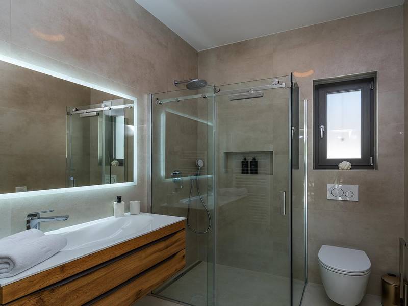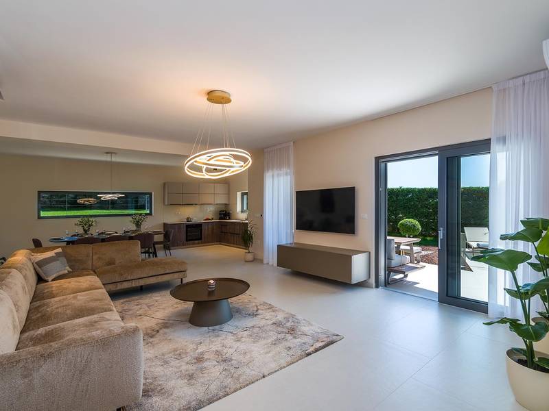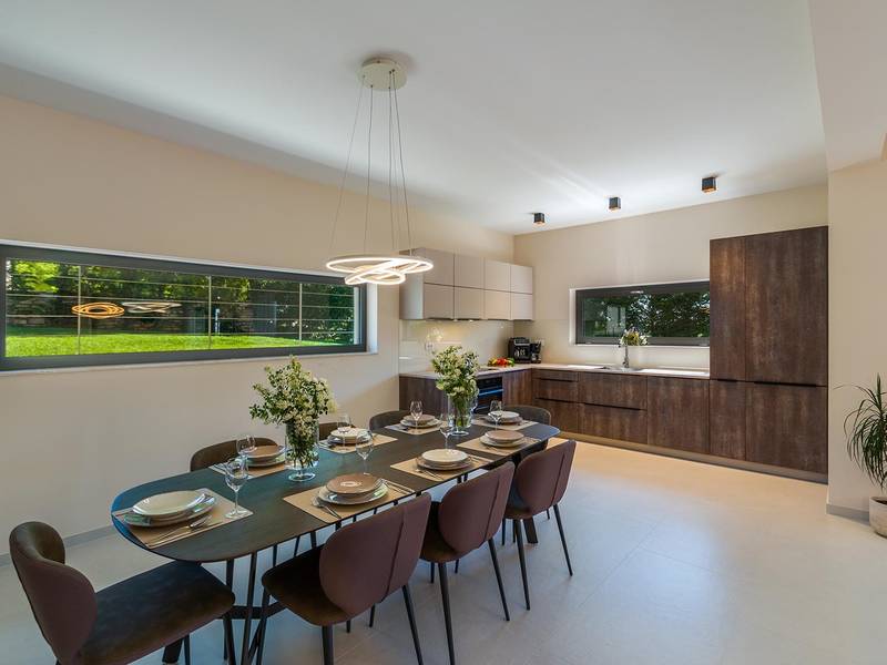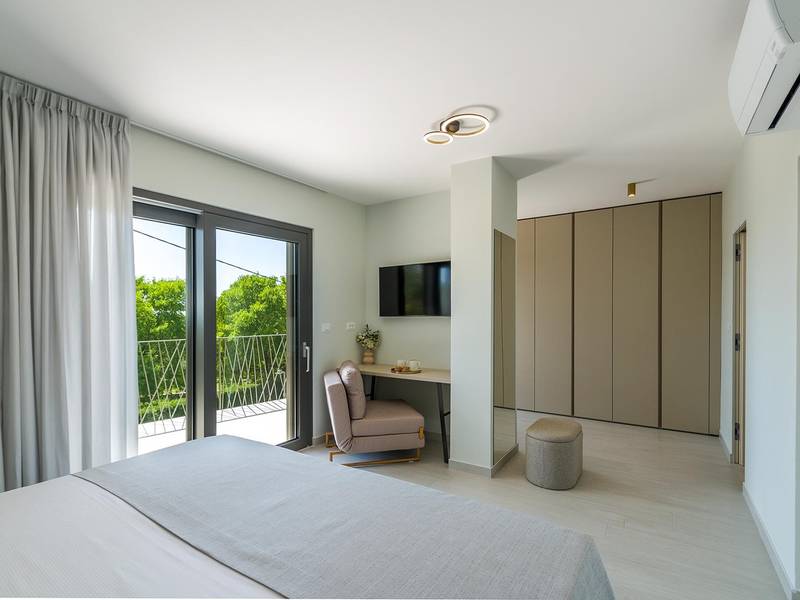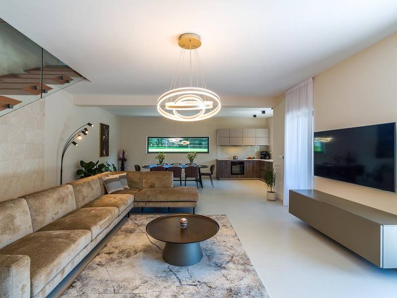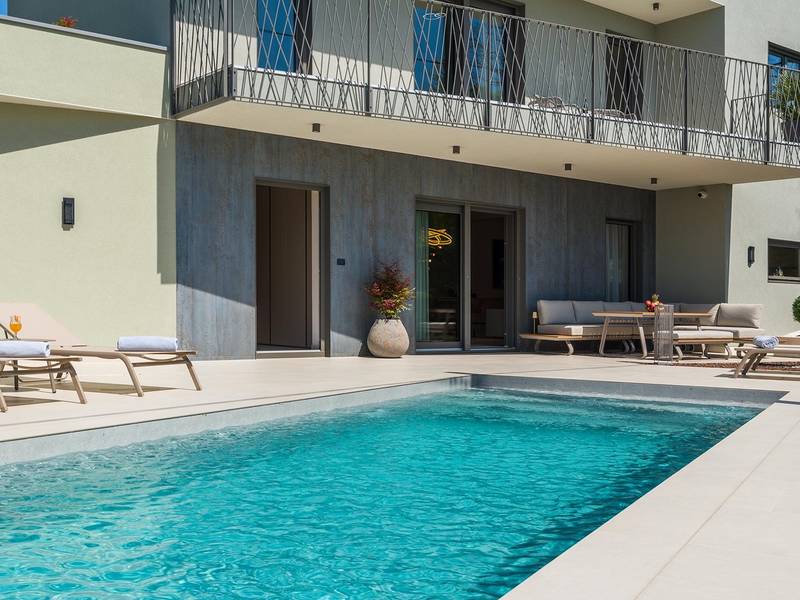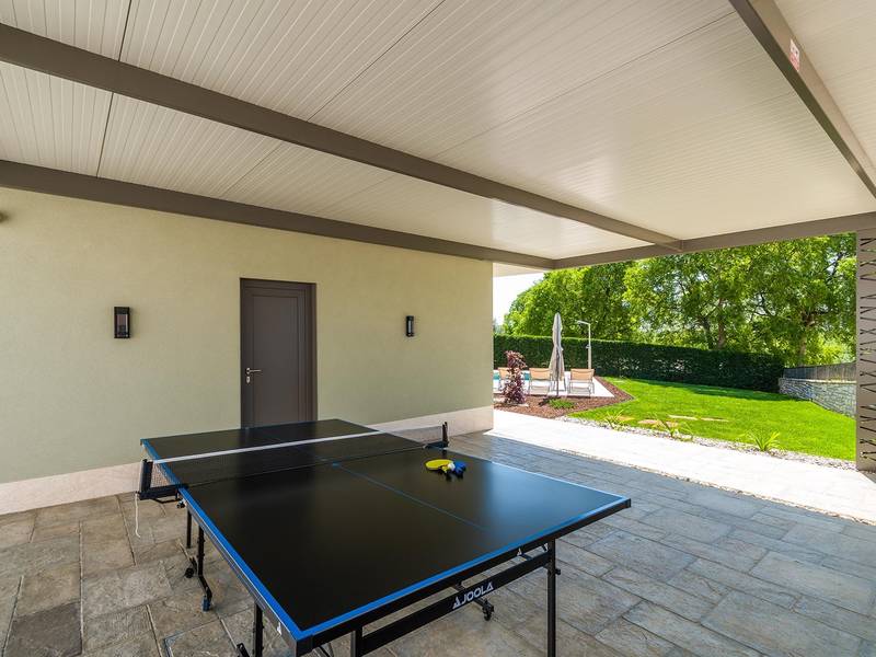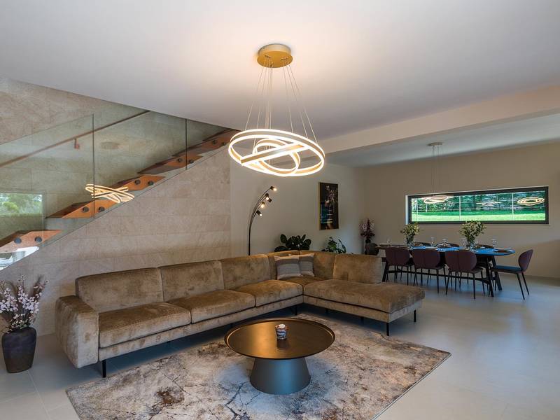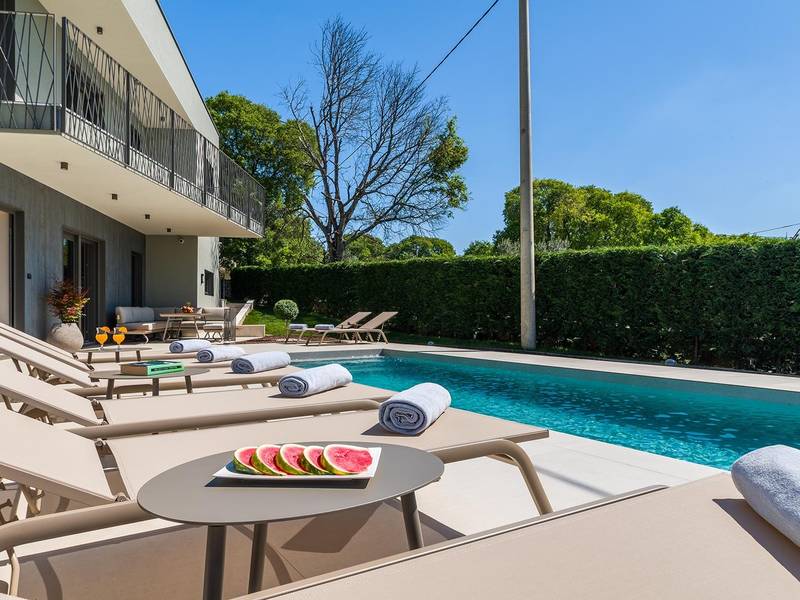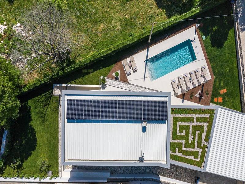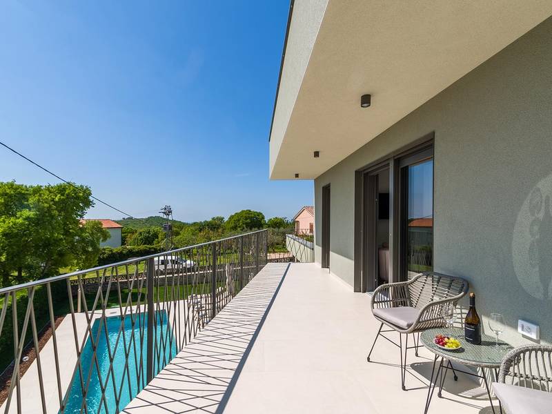 Die Villa Golden Hill ist eine exklusive 5-Sterne-Villa in dem ruhigen istrischen Dorf Golaš, in der Nähe von Bale. Umgeben von Natur und Grün, bietet diese moderne Villa ein hohes Maß an Privatsphäre und diskreten Luxus, ideal für einen erholsamen Aufenthalt in Istrien. Die Villa erstreckt sich über 225 m2 und wurde sorgfältig entworfen, um Funktionalität und Ästhetik zu kombinieren. Im Erdgeschoss befindet sich ein geräumiger, lichtdurchfluteter Wohnbereich, der mit einer modernen, voll ausgestatteten Küche und einem Essbereich verbunden ist. Die offene Raumaufteilung schafft eine einladende Atmosphäre, während der direkte Zugang zur überdachten Terrasse für einen nahtlosen Übergang zwischen Innen- und Außenbereich sorgt. Ein Schlafzimmer befindet sich im Erdgeschoss mit direktem Zugang zum Pool, während sich die beiden anderen elegant gestalteten Schlafzimmer im Obergeschoss befinden. Alle Schlafzimmer sind mit eigenem Bad, Klimaanlage und TV ausgestattet. Große Betten (200x210 cm) sorgen für außergewöhnlichen Komfort, während Zusatzbetten eine flexible Unterbringung für Familien ermöglichen. Der Außenbereich bietet ein komplettes Wohnerlebnis unter freiem Himmel. Der private Swimmingpool (24 m2) ist von Sonnenliegen und einem angelegten Garten umgeben, während die überdachte Terrasse mit Essbereich im Freien zu entspannten Mahlzeiten einlädt. Ein Gasgrill unterstreicht den mediterranen Lebensstil. Das Grundstück ist vollständig eingezäunt und als Grünfläche angelegt, was Privatsphäre und Ruhe garantiert. Die Villa Golden Hill ist mit einer Fußbodenheizung und einer Klimaanlage ausgestattet, die das ganze Jahr über für Komfort sorgen. WiFi, ein Safe, eine Waschmaschine, ein Trockner und alle wichtigen Haushaltsgegenstände stehen für einen sorgenfreien Aufenthalt zur Verfügung. Die Villa befindet sich in einer ruhigen Umgebung und ist dennoch gut angebunden - ein Restaurant ist nur 200 Meter entfernt, während die Geschäfte in Bale nur eine kurze Autofahrt entfernt sind. Das Meer und die Strände sind ca. 12 km entfernt, und der Flughafen Pula ist 25 km entfernt. Die Villa Golden Hill bietet ein perfektes Gleichgewicht zwischen modernem Komfort, Privatsphäre und natürlicher Umgebung - ein idealer Ort für einen wirklich erholsamen Aufenthalt in Istrien. Das Haus ist nicht für Jugendgruppen geeignet. Haustiere sind nicht erlaubt. Rauchen ist im Haus nicht gestattet.