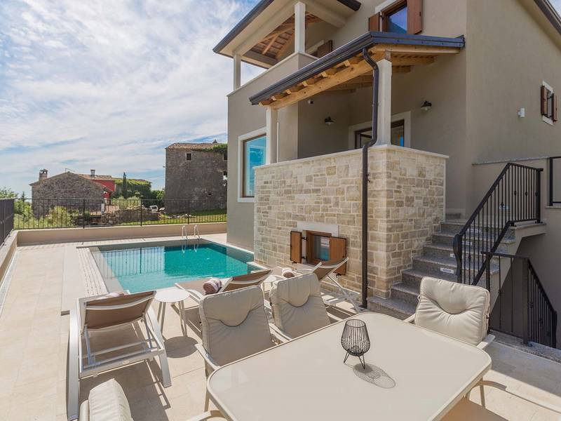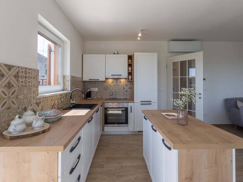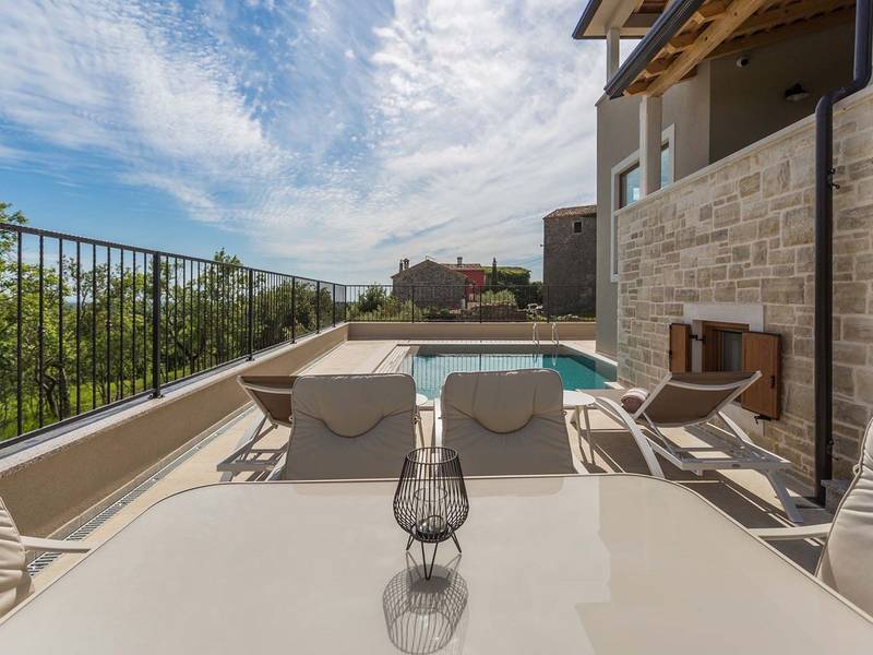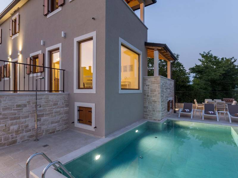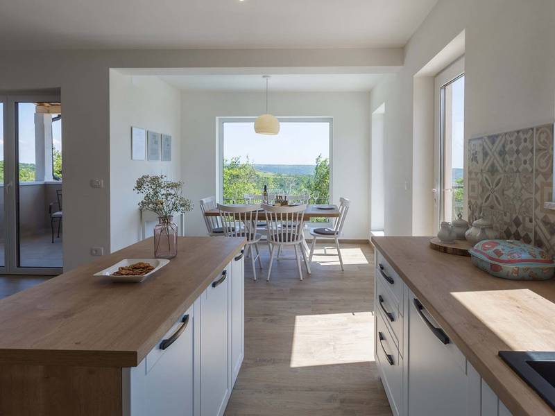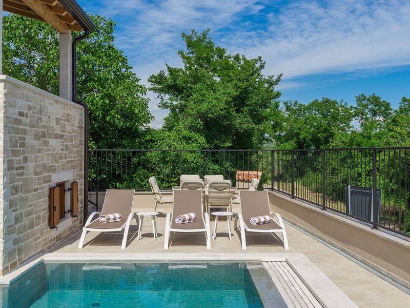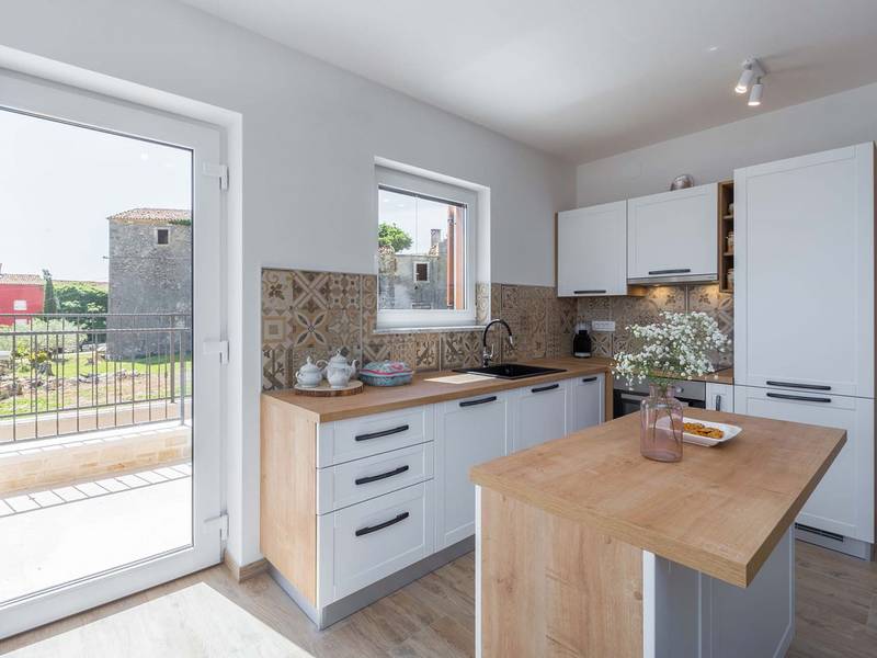Die Villa Skarline befindet sich in einem Ort namens Baredine, in der Nähe der istrischen Stadt Buje, die für den Weinanbau bekannt ist. Das dominierende Merkmal dieses Ferienhauses für 6-8 Personen ist der schöne Blick auf die istrische Landschaft. Die pastellfarbenen Nuancen des hellen Interieurs verleihen diesem Haus eine beruhigende und entspannende Wirkung. Verschiedene Vintage-Elemente (wie Teekanne mit Tassen, Kaffeemühle, antike Küchenfliesen usw.) erinnern an die alten romantischen Zeiten. Die Villa ist umgeben von alten Häusern mit der ursprünglichen istrischen Architektur. Das Haus besteht aus zwei Etagen, die drei Schlafzimmer mit Badezimmern, ein Wohnzimmer und ein Esszimmer mit Küche enthalten. Der Außenbereich bietet einen 27 m2 großen Pool mit Sonnenterrasse, Sommerküche und viel Grün. Einige der Unterkünfte lassen keine Jugendgruppen zu. Wenn Sie als Gruppe junger Menschen eine Unterkunft buchen, setzen Sie sich bitte vor der Reservierung mit unserer Agentur in Verbindung, um zu prüfen, ob das gewünschte Objekt Ihren Aufenthalt erlaubt.