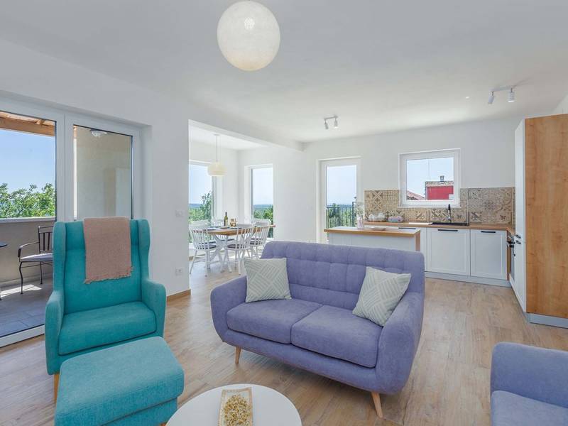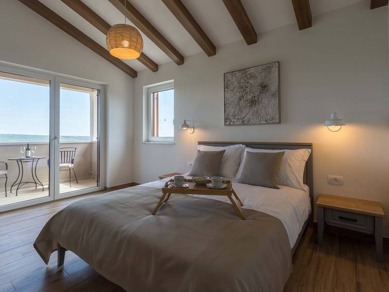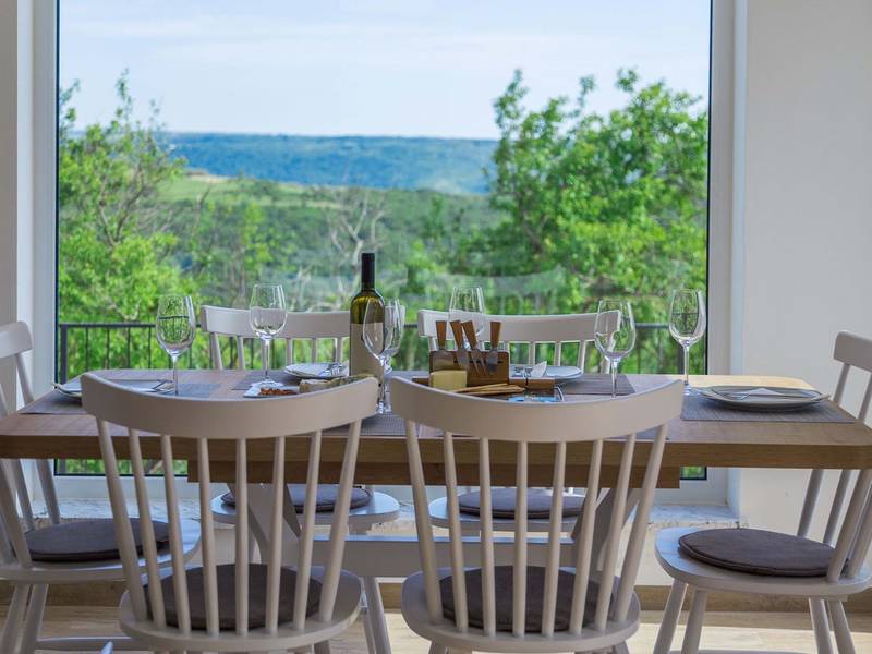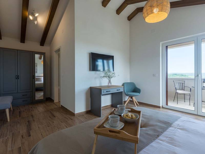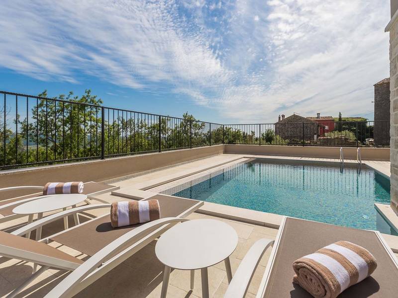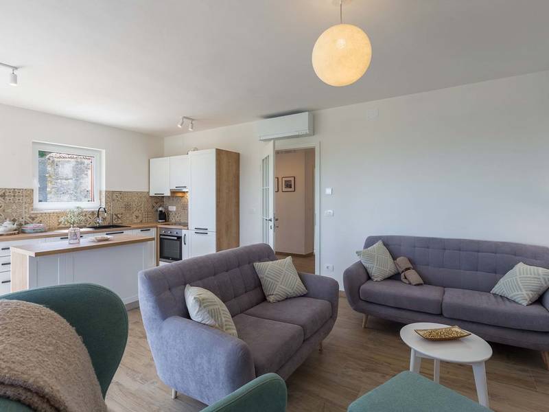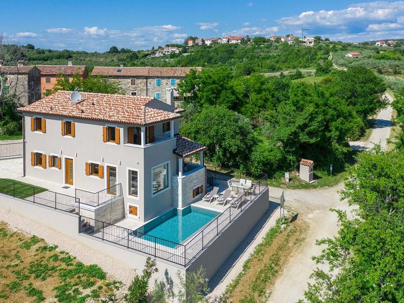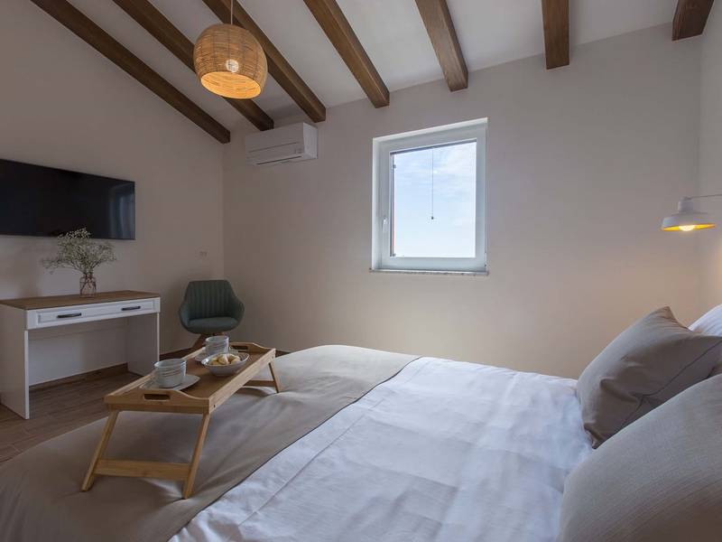 Die Villa Skarline befindet sich in einem Ort namens Baredine, in der Nähe der istrischen Stadt Buje, die für den Weinanbau bekannt ist. Das dominierende Merkmal dieses Ferienhauses für 6-8 Personen ist der schöne Blick auf die istrische Landschaft. Die pastellfarbenen Nuancen des hellen Interieurs verleihen diesem Haus eine beruhigende und entspannende Wirkung. Verschiedene Vintage-Elemente (wie Teekanne mit Tassen, Kaffeemühle, antike Küchenfliesen usw.) erinnern an die alten romantischen Zeiten. Die Villa ist umgeben von alten Häusern mit der ursprünglichen istrischen Architektur. Das Haus besteht aus zwei Etagen, die drei Schlafzimmer mit Badezimmern, ein Wohnzimmer und ein Esszimmer mit Küche enthalten. Der Außenbereich bietet einen 27 m2 großen Pool mit Sonnenterrasse, Sommerküche und viel Grün. Einige der Unterkünfte lassen keine Jugendgruppen zu. Wenn Sie als Gruppe junger Menschen eine Unterkunft buchen, setzen Sie sich bitte vor der Reservierung mit unserer Agentur in Verbindung, um zu prüfen, ob das gewünschte Objekt Ihren Aufenthalt erlaubt.