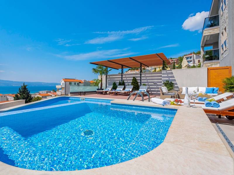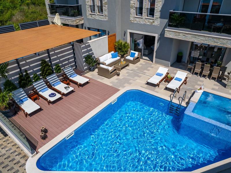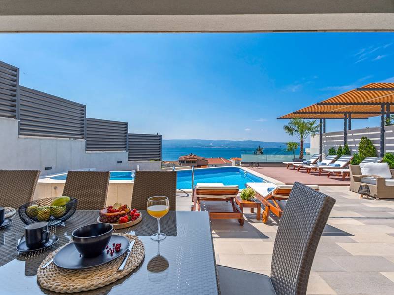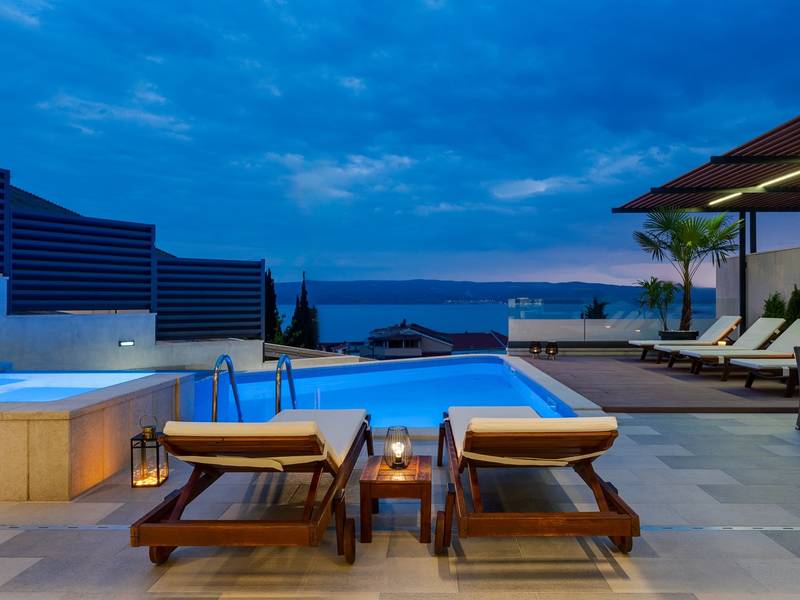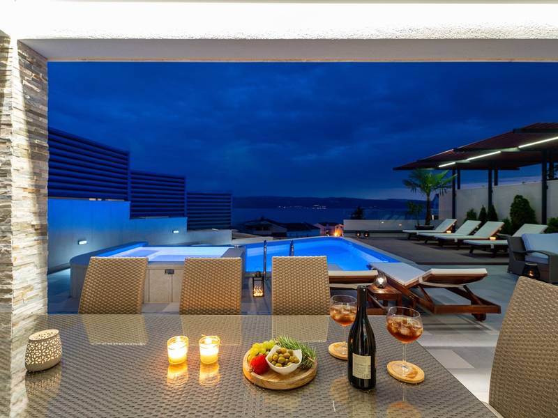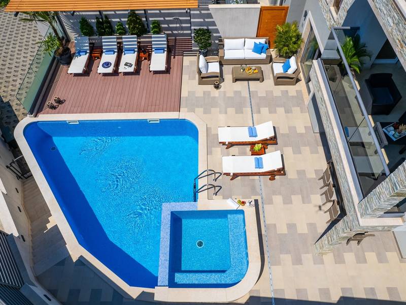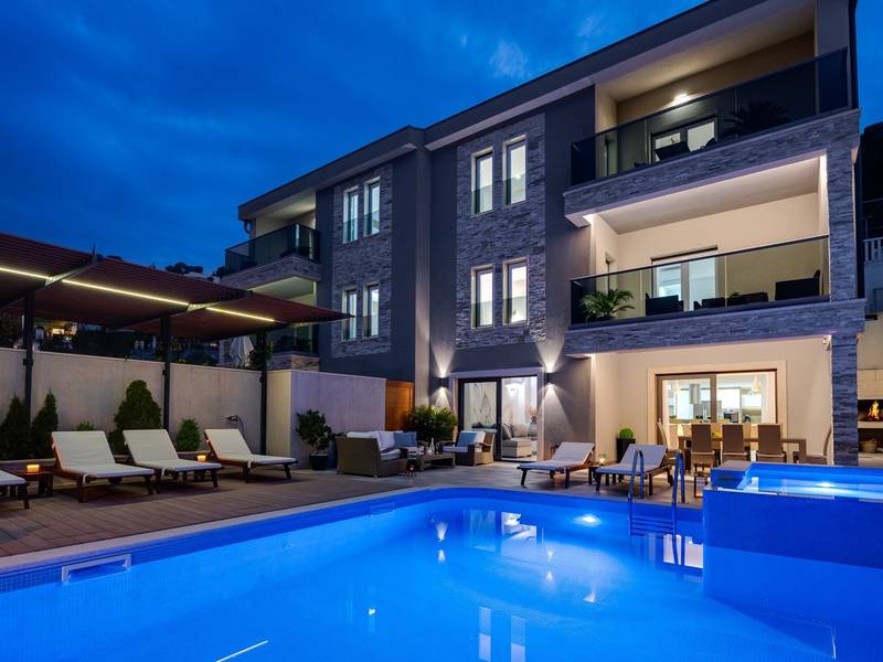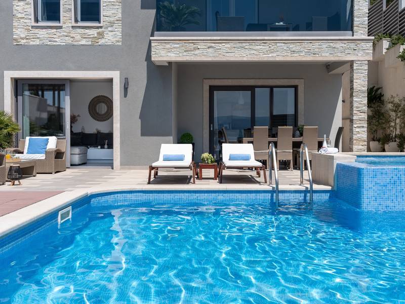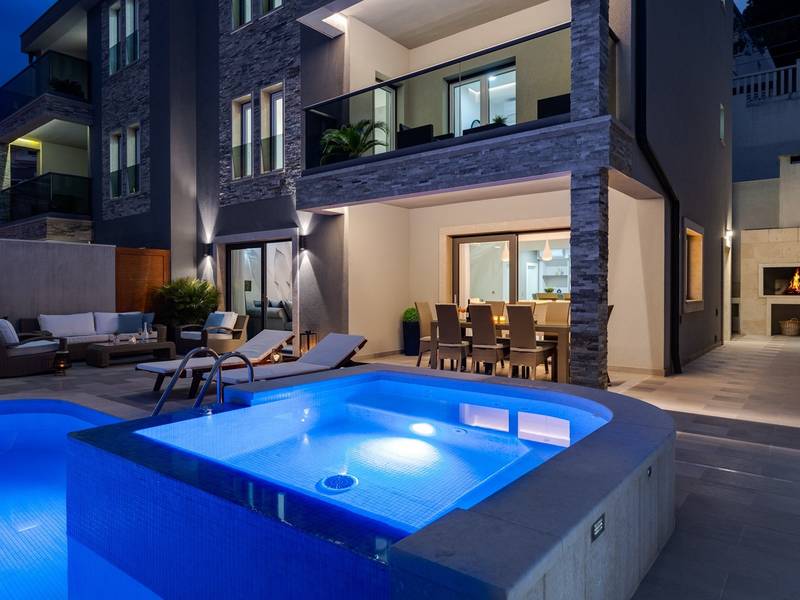 Villa Bane ist eine Doppelhaushälfte; beide Häuser gehören zwei Brüdern, die Einheimische sind. Jede Villa bietet Platz für 10+2 Gäste. Sie brauchen sich keine Sorgen zu machen, Privatsphäre ist gegeben, wie viele unserer Gäste in der Vergangenheit kommentiert. Die Villa verfügt über einen 32m2 großen beheizten trapezförmigen Pool mit einem angeschlossenen Whirlpool mit Hydromassage und einer Sitzbank für 4 Erwachsene, beide mit synchronisierter Wassertemperatur für ultimative Entspannung. Im Außenbereich gibt es einen schönen überdachten Essbereich, eine schön möblierte Sonnenterrasse und einen weichen Sitzbereich, alle mit Blick auf das Meer. Außerdem gibt es einen eingebauten Grill um die Ecke, der die Idee des Lebens im Freien unterstützen könnte. Villa Bane hat zwei Etagen mit fünf Schlafzimmern, einem Spielzimmer und insgesamt 6 Badezimmern + 1 Toilette. Sie verfügt über mehrere Balkone und Terrassen und einen Fitnessraum im Untergeschoss. Die Villa Bane ist komplett eingezäunt und verfügt über 3-4 geschlossene Garagenplätze, und der Poolbereich ist diskret eingezäunt, so dass Sie Ihre Privatsphäre haben. Die Villa Bane ist komplett ausgestattet mit 9 Klimaanlagen und Heizung im gesamten Haus und in allen 5 Schlafzimmern, einem Swimmingpool, einer voll ausgestatteten Küche, einem Außengrill neben dem Eingang, einem Fernseher, kostenlosem schnellem Wi-Fi und allen Annehmlichkeiten, die Sie brauchen, um dies zu Ihrem Zuhause zu machen. -Erdgeschoss: Der Haupteingang führt Sie in den geräumigen Wohn- und Essbereich mit Ausgang zum Poolbereich und Blick auf das Meer. Im Wohnzimmer finden Sie 2 Klimaanlagen, einen Fernseher und einen Ausgang zur Terrasse. Sie und Ihre Lieben können es sich auf den bequemen Sofas gemütlich machen. Der Wohnbereich ist mit der Küche und dem Essbereich verbunden, und alle sind sehr geräumig. Neben der Küche gibt es eine Speisekammer und eine Toilette im Erdgeschoss. Die große und schöne Küche ist komplett ausgestattet mit einem Kühlschrank mit Gefrierfach, einem Elektroherd mit vier Kochfeldern, einer Spülmaschine, Töpfen und Pfannen, Tellern und Besteck, einer Kaffeemaschine, einem Toaster, einem Wasserkocher und einer Mikrowelle. Erster Stock: Schlafzimmer Nr. 1 mit einem Doppelbett 180*200, einem kompletten Badezimmer mit Dusche (en-suite). Schlafzimmer Nr. 2 hat zwei Einzelbetten 90*200, die zu einem Doppelbett verbunden werden können, und ein komplettes Badezimmer mit Dusche (en-suite). Es hat eine Tür, um auf die Außenterrasse mit Meerblick zu gelangen (zusammen mit Schlafzimmer Nr. 1). Geräumiges Spielzimmer mit Fernseher, Spielkonsole und Spielzeug, ein toller Ort für Kinder jeden Alters. Zweiter Stock: Schlafzimmer Nr. 3 mit einem Doppelbett 180*200, es hat ein komplettes Badezimmer mit Dusche (en-suite). Es hat eine Tür, um die Außenterrasse mit Meerblick zu erreichen (zusammen mit Schlafzimmer Nr. 4). Schlafzimmer Nr. 4 hat ein Doppelbett 180*200, es hat ein komplettes Badezimmer mit Dusche (en-suite). Es hat eine Tür, um auf die Außenterrasse mit Meerblick zu gelangen (zusammen mit Schlafzimmer Nr. 3). Schlafzimmer Nr. 5 mit einem Doppelbett 180*200, es hat ein komplettes Badezimmer mit einer Badewanne (en-suite). Im Untergeschoss befindet sich ein Spielzimmer mit einem Billardtisch und einigen Fitnessgeräten sowie ein Badezimmer mit einer Dusche. In der Garage befindet sich ein Tennistisch. - Es besteht auch die Möglichkeit, traditionelle dalmatinische Gerichte für Sie zubereiten zu lassen. Zusätzliche Dienstleistungen (nicht inbegriffen), die von unserer Agentur Feriehome empfohlen werden: - Sie können bequem von Ihrem Sofa aus eine Lebensmittellieferung bestellen, die zum vereinbarten Zeitpunkt in Ihre Villa geliefert wird; - Genießen Sie ein kulinarisches Erlebnis mit einem Privatkoch in der Villa, der alles zubereiten kann, von einem romantischen Abendessen bis hin zu einem familienfreundlichen Dinner.- Sie können eine In-Villa-Massage mit unserer professionellen Masseurin genießen, die ihre therapeutischen Fähigkeiten unter Beweis stellen kann; - ein Gefühl für die Adria und einige Segelerfahrungen mit einem Segelboot (+Skipper) bekommen; - eine Bootstour machen, um die mitteldalmatinische Küste und die Inseln zu erkunden...für weitere Informationen stehen wir Ihnen gerne zur Verfügung. Wir freuen uns auf Ihre Anfrage, Ihr Feriehome-Agenturteam :)