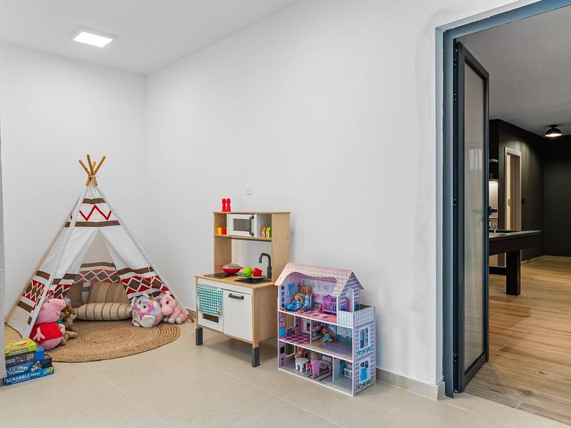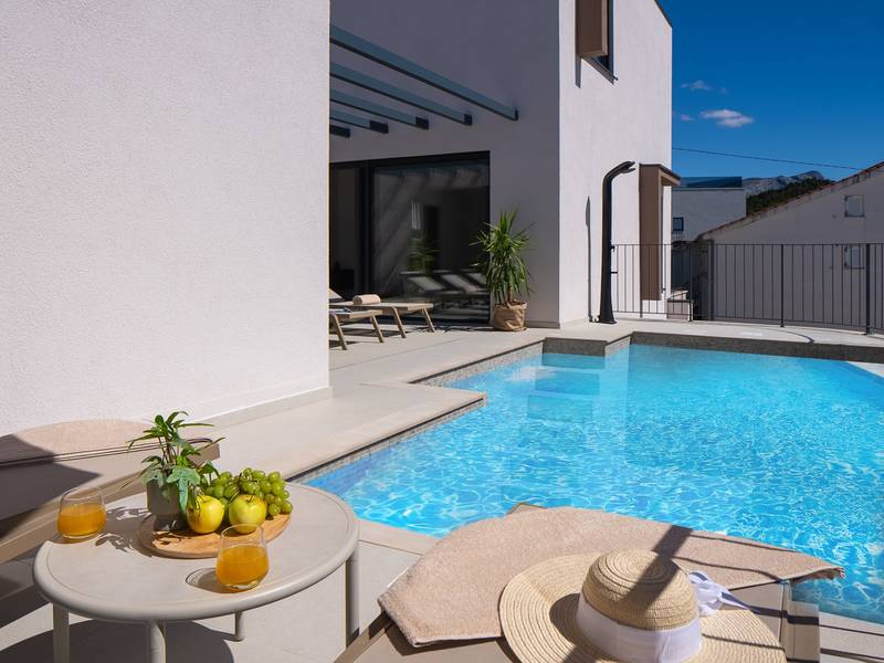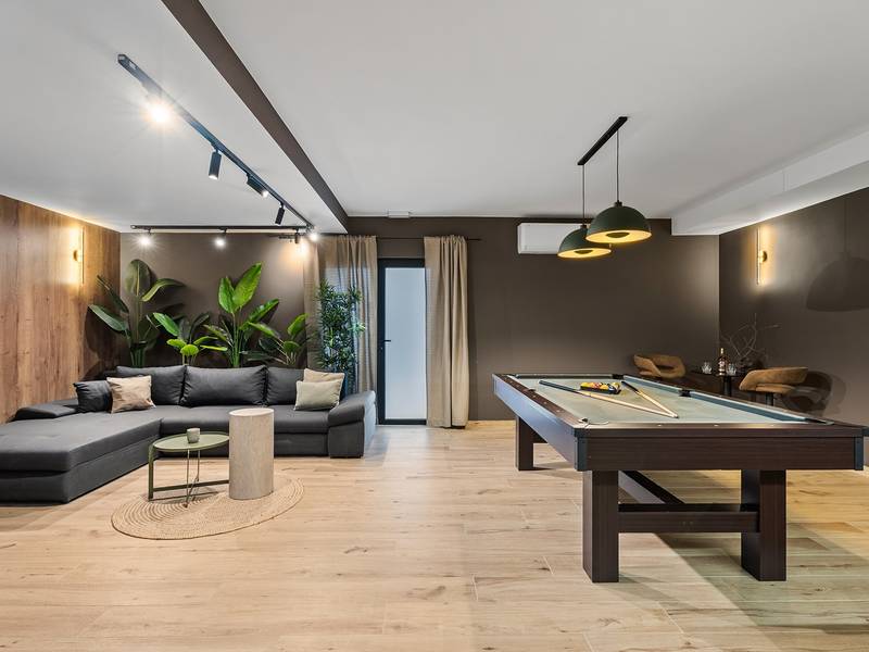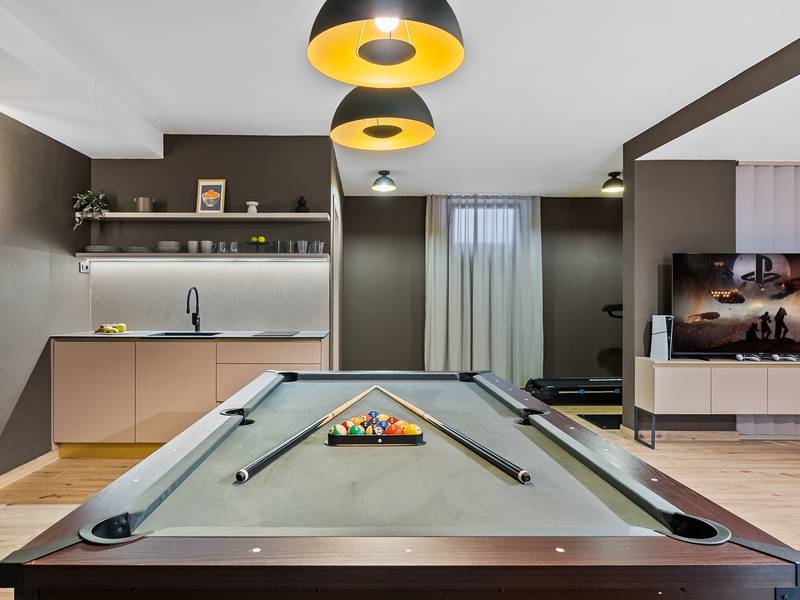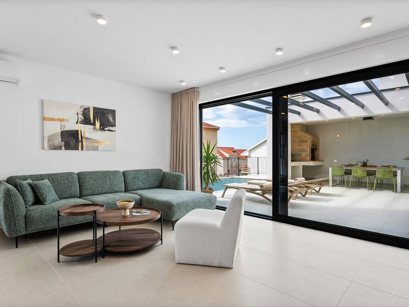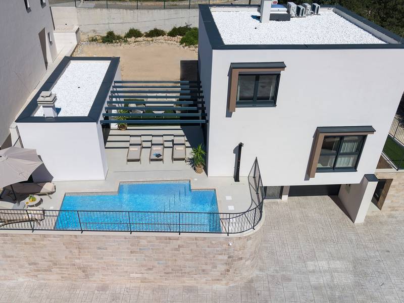Eine stilvolle 3-Schlafzimmer-Villa mit Meerblick, beheiztem Pool, Medienraum und Fun-Zone, Billardtisch, Laufband, PS5, 2 Bäder, nur wenige Schritte von der Küste von Dugi Rat Willkommen in der Villa Logos, eine atemberaubende neu gebaute Villa mit Meerblick, nur 150 Meter von der kristallklaren Adria entfernt. Dieses außergewöhnliche Anwesen befindet sich auf einem 270 m² großen Privatgrundstück und bietet auf drei Ebenen eine großzügige Wohnfläche von 200 m², die Platz für 6 Personen bietet. Die Villa Logos ist so konzipiert, dass sie Ihrer Familie oder Ihren Freunden einen unvergesslichen Urlaub bietet und Ihnen Komfort und Luxus während Ihres gesamten Aufenthalts garantiert. Oase im Freien Der Außenbereich ist ein wahres Highlight der Villa Logos. Sie können einen privaten beheizten Pool von 7 mal 3 Metern genießen, der mit einem sanften Elektrolyse-Filtersystem ausgestattet ist, das Ihre Haut schont. Um den Pool herum befindet sich eine Sonnenterrasse mit fünf bequemen Liegestühlen, auf denen Sie die Sonne genießen können. Zur Villa gehört auch ein überdachter Essbereich im Freien mit einem Grill, der es Ihnen ermöglicht, köstliche Mahlzeiten im Freien einzunehmen. Zur Entspannung gibt es eine gemütliche Lounge-Ecke, in der Sie sich nach einem Tag voller Entdeckungen entspannen können, und eine Außendusche bietet zusätzlichen Komfort für Ihre Zeit am Pool. Der Außenbereich bietet einen direkten Zugang zur Küche und zum Wohnzimmer, so dass ein nahtloser Übergang zwischen Innen- und Außenbereich entsteht. Geräumiger Wohnbereich Der Wohnbereich im Erdgeschoss ist voll klimatisiert und hat eine beeindruckende Größe von 38 Quadratmetern. Dieser Raum ist mit kostenlosem WiFi ausgestattet und verfügt über eine voll ausgestattete Küche sowie einen Esstisch, an dem acht Personen bequem Platz finden. Sie können sich auf dem bequemen Sofa entspannen, während Sie Ihre Lieblingssendungen auf dem Flachbildschirm-Smart-TV genießen. Große Schiebetüren führen direkt zum Poolbereich, der einen einfachen Zugang und eine schöne Aussicht bietet. Außerdem gibt es auf dieser Ebene eine separate Toilette. Unterhaltungs- und Fitnessoptionen Im unteren Erdgeschoss (Parkebene) finden Sie einen 55 Quadratmeter großen Medienraum und eine Fun-Zone mit Billardtisch, die ebenfalls voll klimatisiert ist. Dieses Unterhaltungszentrum verfügt über ein Sofa, das in ein zusätzliches Bett umgewandelt werden kann, eine PlayStation 5 für Spielefans, ein Surround-Sound-System und einen Smart-TV mit Netflix für Ihr Fernsehvergnügen. Wenn Sie lieber aktiv bleiben möchten, finden Sie im Fitnessbereich ein Laufband, eine Yogamatte und Gewichte sowie einen Billardtisch für einen freundschaftlichen Wettkampf. Außerdem gibt es eine 16 Quadratmeter große Kinderecke mit Spielzeug, um Ihre jüngsten Familienmitglieder zu unterhalten. Ein Familienbad mit Dusche befindet sich ebenfalls auf dieser Ebene. Gut organisierte Schlafzimmer Im ersten Stock finden Sie drei schön eingerichtete Schlafzimmer und ein Familienbad mit Dusche. Das erste Schlafzimmer ist 15,6 Quadratmeter groß und verfügt über ein Kingsize-Bett (180 cm x 200 cm), einen herrlichen Meerblick, einen Fernseher und eine Klimaanlage. Das zweite Schlafzimmer mit 11 Quadratmetern bietet ein Queen-Size-Bett (160 cm x 200 cm), einen Fernseher und eine Klimaanlage für zusätzlichen Komfort. Das dritte Schlafzimmer ist 8,5 Quadratmeter groß und verfügt über ein Einzelbett (90 cm x 200 cm) sowie ein ausziehbares Einzelbett, ebenfalls mit Klimaanlage. Im Flur finden Sie einen gut organisierten Bereich mit Waschmaschine, Trockner und Bügelzubehör. Experience Villa Logos Der Gastgeber wird bei Ihrer Ankunft vor Ort sein und Ihnen gerne alle notwendigen Informationen und Empfehlungen für die Umgebung geben.Zusätzliche Dienstleistungen (nicht inbegriffen) werden von unserer Agentur Feriehome empfohlen, also fragen Sie ruhig nach: - Sie können bequem vom Sofa aus eine Lebensmittellieferung bestellen, die zum vereinbarten Zeitpunkt in die Villa geliefert wird; - Genießen Sie ein kulinarisches Erlebnis mit einem Privatkoch in der Villa, der alles zubereiten kann, von einem romantischen Abendessen bis zu einem familienfreundlichen Dinner.- Sie können eine Massage in der Villa mit unserer professionellen Masseurin genießen, die ihre therapeutischen Fähigkeiten unter Beweis stellen kann; - ein Gefühl für die Adria bekommen und ein wenig Segelerfahrung mit einem Segelboot (+Skipper) sammeln; - eine Bootstour machen, um die mitteldalmatinische Küste und die Inseln zu erkunden... für weitere Informationen stehen wir Ihnen gerne zur Verfügung. Kommen Sie und genießen Sie einen erholsamen und unvergesslichen Urlaub in der Villa Logos, wo Komfort auf Luxus in einer malerischen Umgebung trifft. Buchen Sie noch heute Ihren Aufenthalt und schaffen Sie bleibende Erinnerungen in diesem wunderschönen kroatischen Refugium!