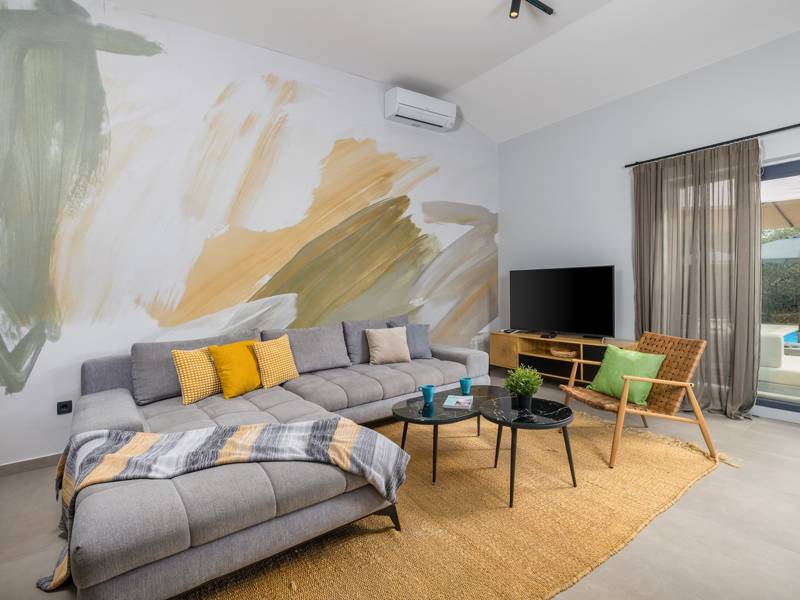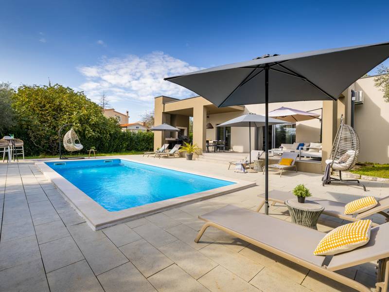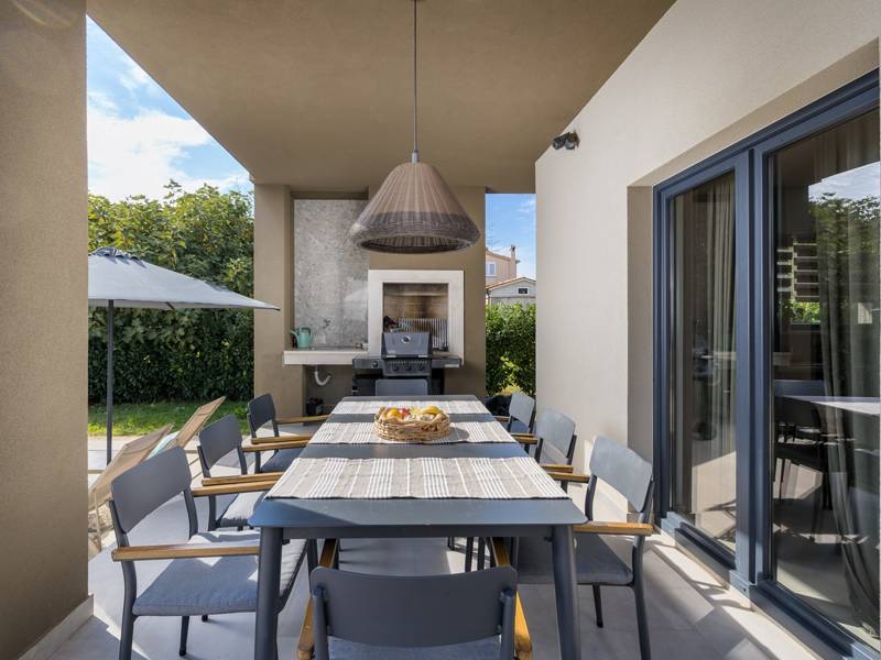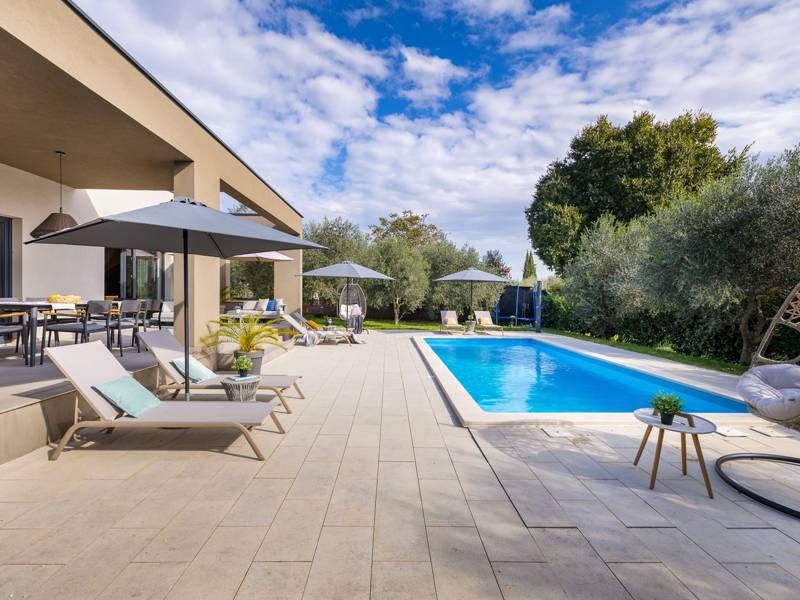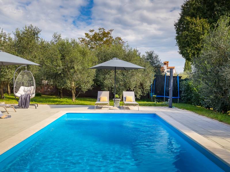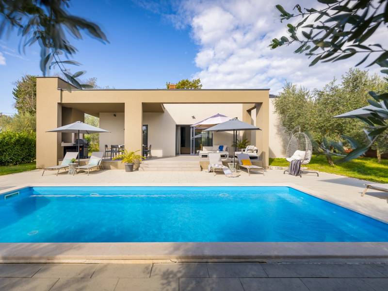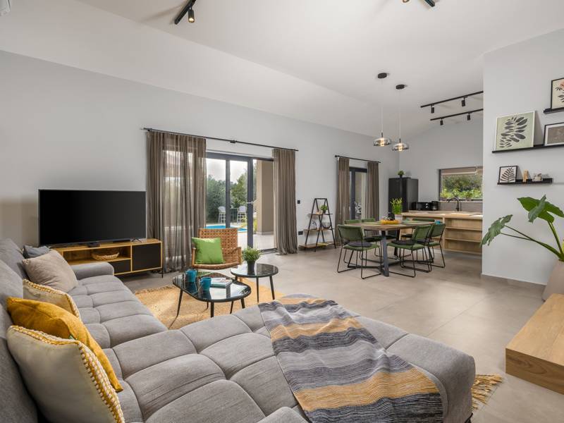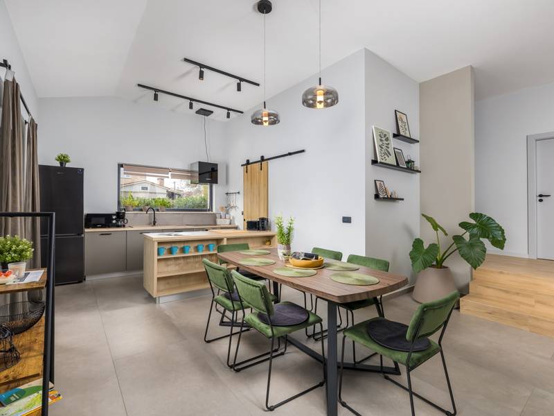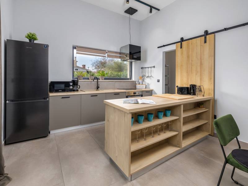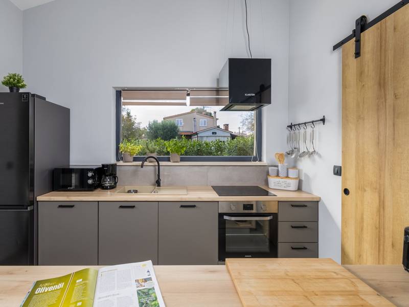 Willkommen in der Villa Tonina, einem modernen Rückzugsort in der friedlichen Landschaft von Filipana, ideal für einen entspannten Familienurlaub. Die neu gebaute und stilvoll gestaltete Villa bietet eine perfekte Mischung aus Komfort und modernem Wohnen, umgeben von Natur und nur eine kurze Autofahrt von lokalen Cafés, Restaurants und Geschäften entfernt. Dieses schöne Ferienhaus liegt auf einem vollständig umzäunten 1.000 m2 großen Privatgrundstück und bietet 140 m2 Wohnfläche auf einer Ebene. Es bietet bequem Platz für sechs Personen, mit der Möglichkeit, zwei weitere Personen auf einem Schlafsofa unterzubringen, was es zu einer ausgezeichneten Wahl für Familien oder eine Gruppe von Freunden macht. Wenn Sie das Haus betreten, finden Sie einen hellen und offenen Wohnbereich, der mit natürlichem Licht gefüllt ist. Der Raum verfügt über ein großes Sofa, das in ein Bett umgewandelt werden kann, einen Flachbildfernseher und einen direkten Zugang zur Poolterrasse. Die voll ausgestattete Küche verfügt über moderne Geräte und alle notwendigen Utensilien für die Zubereitung hausgemachter Mahlzeiten, während der angrenzende Essbereich perfekt für ein entspanntes Frühstück oder ein Abendessen bei Kerzenschein ist. Es gibt drei geschmackvoll eingerichtete Schlafzimmer. Zwei sind mit großen Doppelbetten und eigenem Bad ausgestattet, das dritte mit zwei Einzelbetten, ideal für Kinder oder Freunde. Alle Zimmer sind auf Komfort und erholsame Nächte ausgelegt. Draußen verwandelt sich die Villa Tonina in Ihre eigene private Oase. Ein Swimmingpool lädt an warmen Sommertagen zur Abkühlung ein, während die Sonnenterrasse mit sechs Liegestühlen und vier Sonnenschirmen ein perfekter Ort zum Entspannen ist. Ein überdachter Essbereich im Freien mit einem großen Tisch und einem Grill ist ideal, um Mahlzeiten an der frischen Luft zu genießen, und die gemütliche Lounge-Ecke ist ideal für Drinks bei Sonnenuntergang oder um in Ruhe ein Buch zu lesen. Die Villa Tonina ist mehr als nur eine Unterkunft - sie ist ein ruhiger, stilvoller Rückzugsort, an dem Sie entschleunigen, neue Kontakte knüpfen und das Beste von Istrien erleben können.