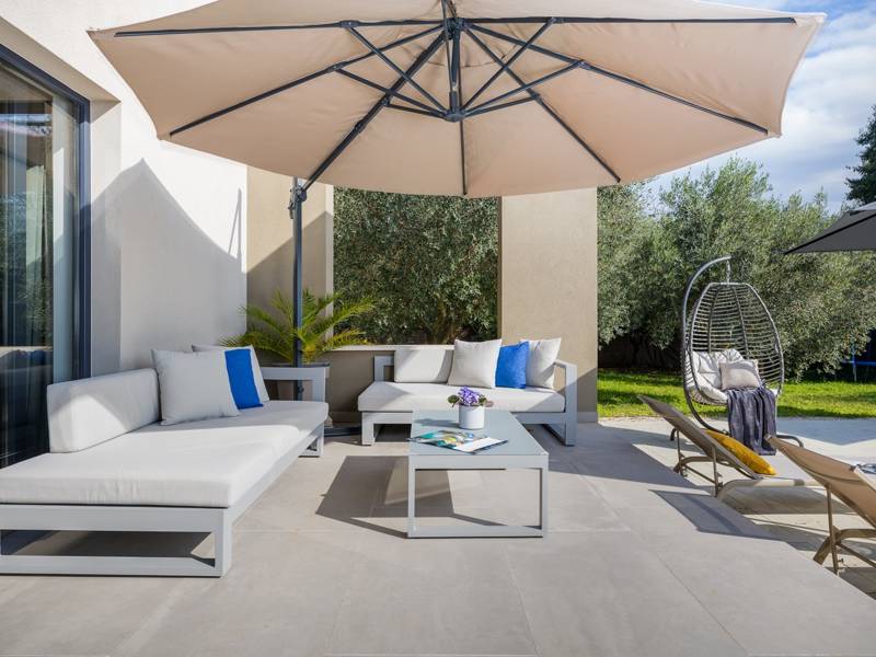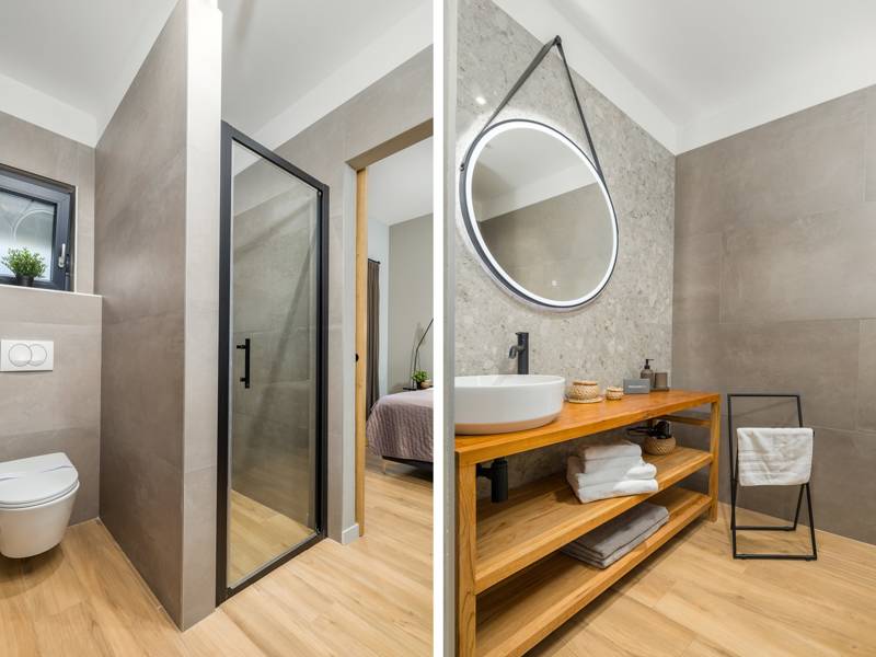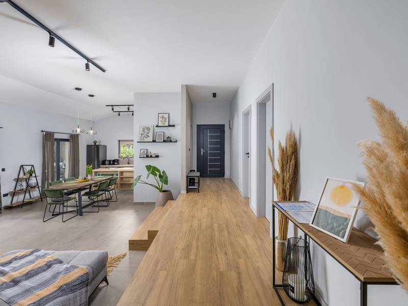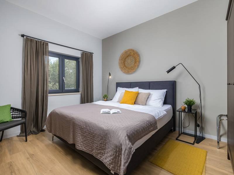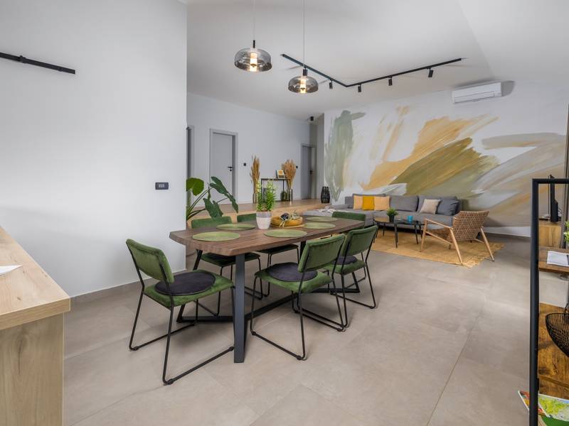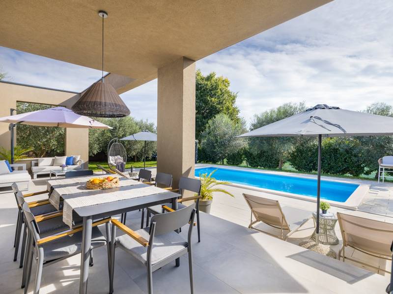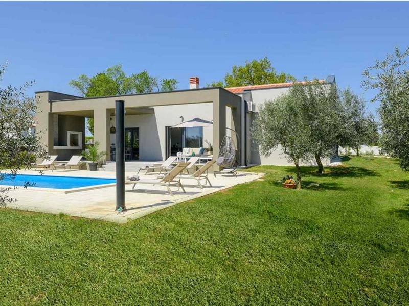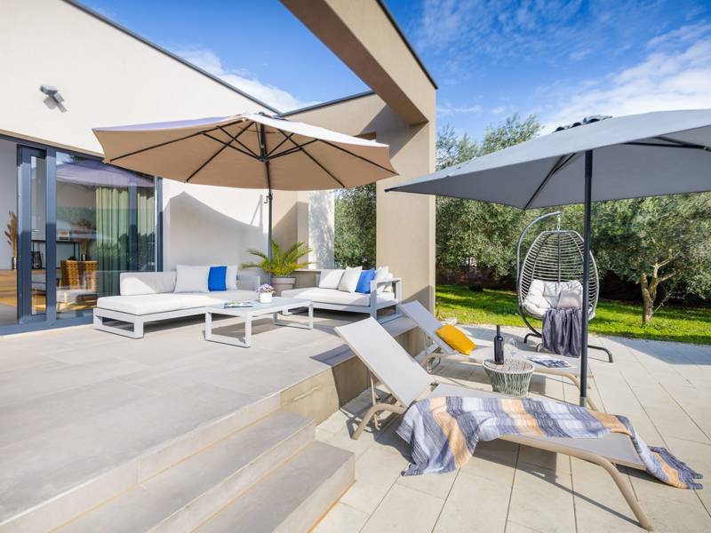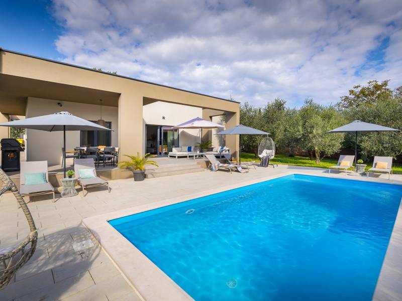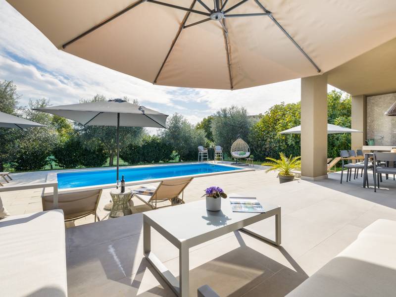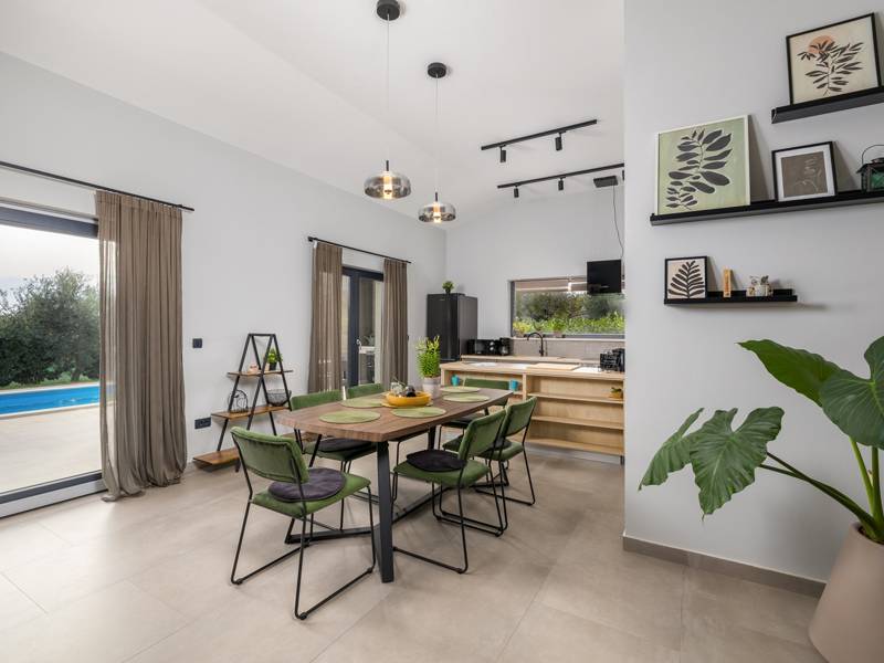 Willkommen in der Villa Tonina, einem modernen Rückzugsort in der friedlichen Landschaft von Filipana, ideal für einen entspannten Familienurlaub. Die neu gebaute und stilvoll gestaltete Villa bietet eine perfekte Mischung aus Komfort und modernem Wohnen, umgeben von Natur und nur eine kurze Autofahrt von lokalen Cafés, Restaurants und Geschäften entfernt. Dieses schöne Ferienhaus liegt auf einem vollständig umzäunten 1.000 m2 großen Privatgrundstück und bietet 140 m2 Wohnfläche auf einer Ebene. Es bietet bequem Platz für sechs Personen, mit der Möglichkeit, zwei weitere Personen auf einem Schlafsofa unterzubringen, was es zu einer ausgezeichneten Wahl für Familien oder eine Gruppe von Freunden macht. Wenn Sie das Haus betreten, finden Sie einen hellen und offenen Wohnbereich, der mit natürlichem Licht gefüllt ist. Der Raum verfügt über ein großes Sofa, das in ein Bett umgewandelt werden kann, einen Flachbildfernseher und einen direkten Zugang zur Poolterrasse. Die voll ausgestattete Küche verfügt über moderne Geräte und alle notwendigen Utensilien für die Zubereitung hausgemachter Mahlzeiten, während der angrenzende Essbereich perfekt für ein entspanntes Frühstück oder ein Abendessen bei Kerzenschein ist. Es gibt drei geschmackvoll eingerichtete Schlafzimmer. Zwei sind mit großen Doppelbetten und eigenem Bad ausgestattet, das dritte mit zwei Einzelbetten, ideal für Kinder oder Freunde. Alle Zimmer sind auf Komfort und erholsame Nächte ausgelegt. Draußen verwandelt sich die Villa Tonina in Ihre eigene private Oase. Ein Swimmingpool lädt an warmen Sommertagen zur Abkühlung ein, während die Sonnenterrasse mit sechs Liegestühlen und vier Sonnenschirmen ein perfekter Ort zum Entspannen ist. Ein überdachter Essbereich im Freien mit einem großen Tisch und einem Grill ist ideal, um Mahlzeiten an der frischen Luft zu genießen, und die gemütliche Lounge-Ecke ist ideal für Drinks bei Sonnenuntergang oder um in Ruhe ein Buch zu lesen. Die Villa Tonina ist mehr als nur eine Unterkunft - sie ist ein ruhiger, stilvoller Rückzugsort, an dem Sie entschleunigen, neue Kontakte knüpfen und das Beste von Istrien erleben können.