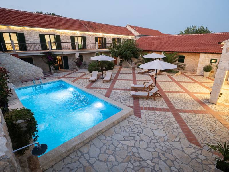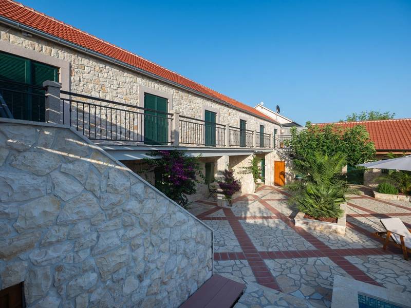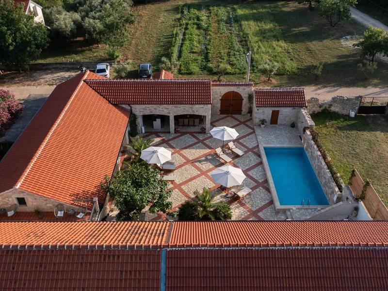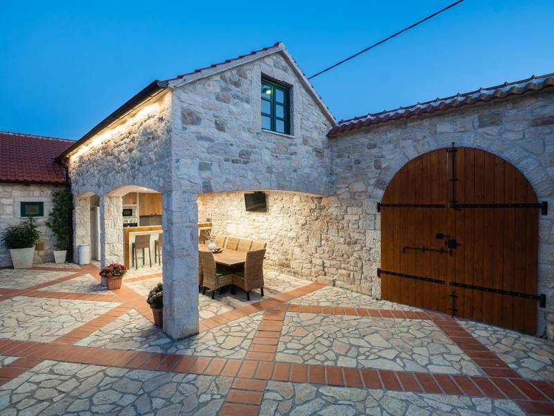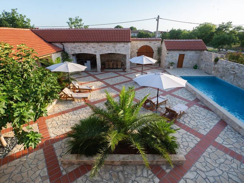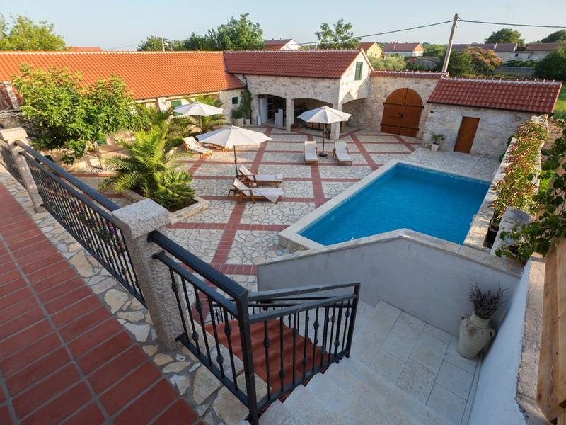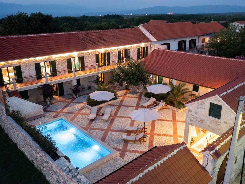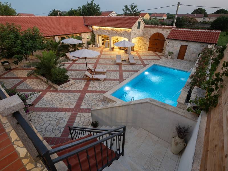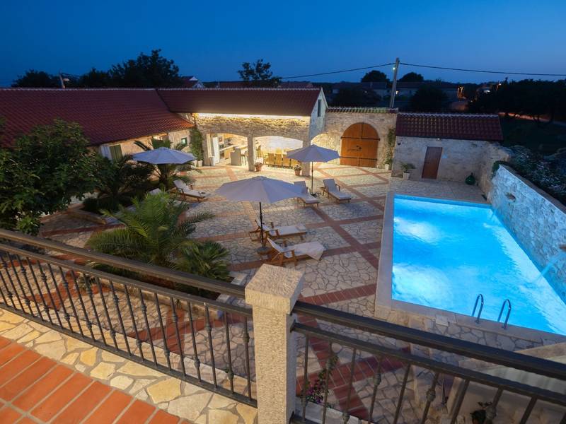 Die Villa Dvori Jokić ist ein wunderschöner und luxuriöser Rückzugsort mit einem privaten, geschlossenen Innenhof und einem beheizten 32 m2 großen Swimmingpool. Im friedlichen Dorf Islam Grčki in Norddalmatien gelegen, ist die Villa eine ideale Wahl für Familien, die Privatsphäre, Entspannung und Ruhe suchen, während sie gleichzeitig in der Nähe der dalmatinischen Strände und der wichtigsten Sehenswürdigkeiten bleiben. Die Villa bietet fünf romantisch gestaltete Schlafzimmer und wurde mit viel Liebe zum Detail entworfen. Die elegante Einrichtung erstreckt sich über zwei Etagen und verbindet Komfort, Stil und Funktionalität: Im Erdgeschoss befinden sich ein geräumiges Wohnzimmer, eine voll ausgestattete Küche und ein Essbereich. Auf dieser Ebene befinden sich auch zwei Schlafzimmer, die jeweils mit einem Queen-Size-Bett (160 × 200 cm) und einem Doppelschlafsofa (140 × 200 cm) ausgestattet sind, das für zwei weitere Gäste geeignet ist. Beide Schlafzimmer verfügen über ein eigenes Bad mit Dusche, Klimaanlage, TV und direkten Zugang zur Terrasse. Im Obergeschoss befinden sich drei weitere Schlafzimmer, die jeweils mit einem Queen-Size-Bett (160 × 200 cm), eigenem Bad, Klimaanlage, TV und direktem Zugang zu einem Balkon mit Blick auf den Innenhof ausgestattet sind. Der Außenbereich ist so gestaltet, dass man ihn in vollen Zügen genießen kann. Eine überdachte Terrasse mit einem Esstisch, einem Holzkohle- und einem Gasgrill bietet den perfekten Rahmen für Mahlzeiten im Freien. Das Highlight des Hauses ist der 32 m2 große private Swimmingpool, der gegen eine zusätzliche Gebühr beheizt werden kann. Sechs bequeme Sonnenliegen und eine geräumige Sonnenterrasse bieten eine private Oase der Entspannung. Zur Unterhaltung stehen den Gästen Tischtennis, Tischfußball, eine PlayStation und ein Kinderspielplatz zur Verfügung, die Spaß für alle Altersgruppen garantieren. Die Villa ist voll klimatisiert, bietet kostenloses WLAN und auf dem komplett umzäunten Grundstück gibt es einen geräumigen Privatparkplatz. Mit ihrer ruhigen Lage, den modernen Annehmlichkeiten und den ausgezeichneten Freizeiteinrichtungen verspricht die Villa Dvori Jokić ein unvergessliches Urlaubserlebnis. Die historische Stadt Zadar ist nur 20 km entfernt. Das nächste Lebensmittelgeschäft ist 1 km, das nächste Restaurant 6 km und der nächste Strand nur 3 km von der Villa entfernt. HINWEIS: - Ein Babybett und ein Hochstuhl sind auf Anfrage erhältlich. Bitte informieren Sie uns im Voraus, damit der Eigentümer alles für Ihre Ankunft vorbereiten kann. - Haustiere sind gegen eine zusätzliche Gebühr erlaubt. - Jugendgruppen werden nur nach vorheriger Absprache akzeptiert. Eine Jugendgruppe ist definiert als eine Gruppe von Personen unter 26 Jahren. Wenn Sie eine Jugendgruppe sind, setzen Sie sich bitte mit uns in Verbindung, bevor Sie eine Reservierung vornehmen, da Buchungen nach der Bestätigung, auch bei der Ankunft oder während des Aufenthalts, abgelehnt werden können und eine Rückerstattung nicht möglich ist.