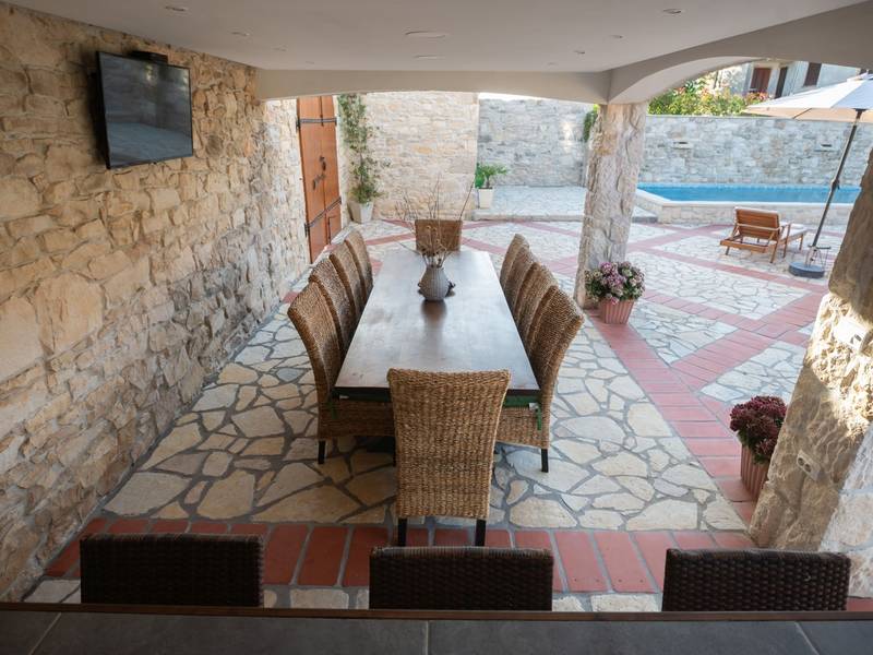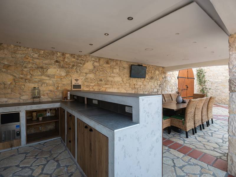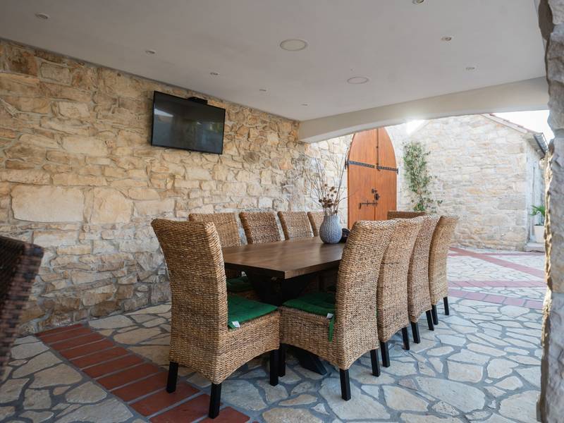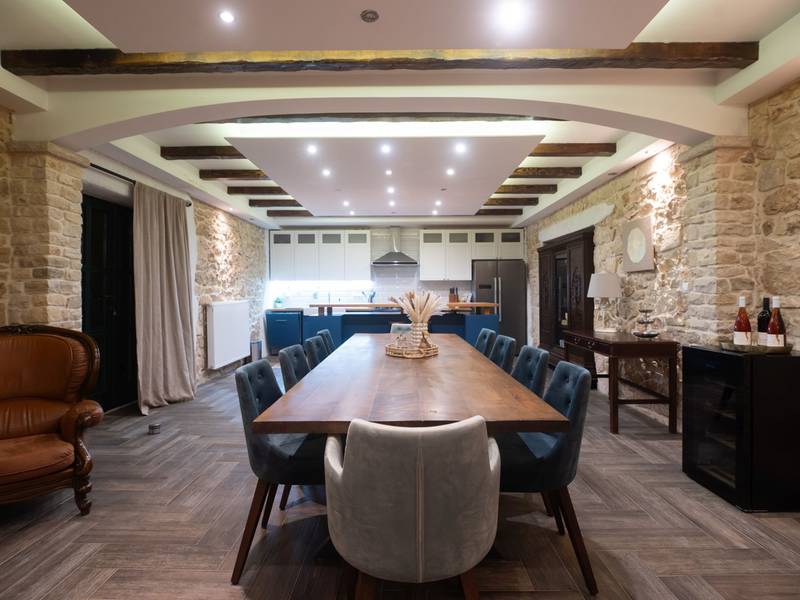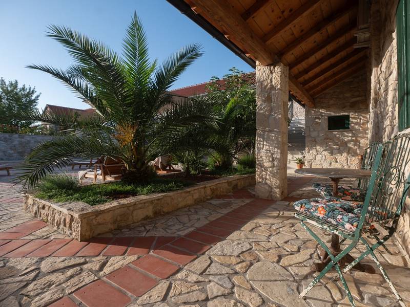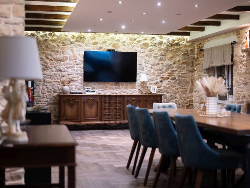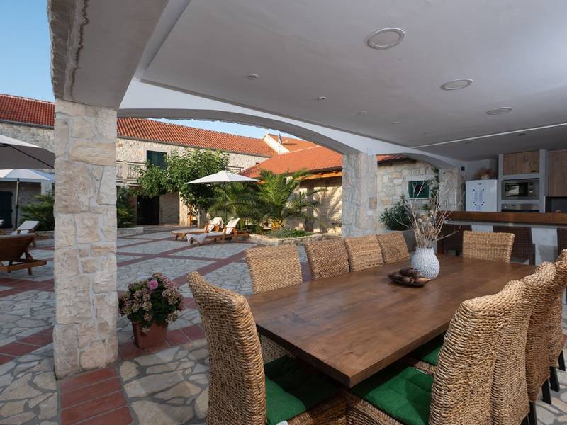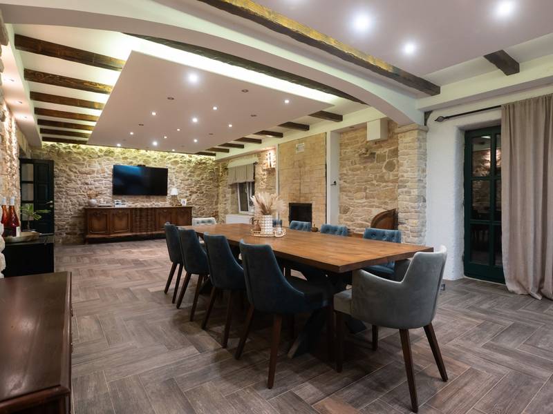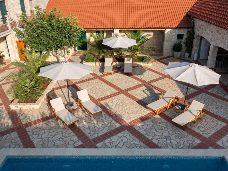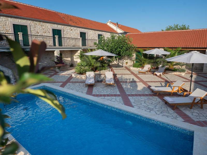 Die Villa Dvori Jokić ist ein wunderschöner und luxuriöser Rückzugsort mit einem privaten, geschlossenen Innenhof und einem beheizten 32 m2 großen Swimmingpool. Im friedlichen Dorf Islam Grčki in Norddalmatien gelegen, ist die Villa eine ideale Wahl für Familien, die Privatsphäre, Entspannung und Ruhe suchen, während sie gleichzeitig in der Nähe der dalmatinischen Strände und der wichtigsten Sehenswürdigkeiten bleiben. Die Villa bietet fünf romantisch gestaltete Schlafzimmer und wurde mit viel Liebe zum Detail entworfen. Die elegante Einrichtung erstreckt sich über zwei Etagen und verbindet Komfort, Stil und Funktionalität: Im Erdgeschoss befinden sich ein geräumiges Wohnzimmer, eine voll ausgestattete Küche und ein Essbereich. Auf dieser Ebene befinden sich auch zwei Schlafzimmer, die jeweils mit einem Queen-Size-Bett (160 × 200 cm) und einem Doppelschlafsofa (140 × 200 cm) ausgestattet sind, das für zwei weitere Gäste geeignet ist. Beide Schlafzimmer verfügen über ein eigenes Bad mit Dusche, Klimaanlage, TV und direkten Zugang zur Terrasse. Im Obergeschoss befinden sich drei weitere Schlafzimmer, die jeweils mit einem Queen-Size-Bett (160 × 200 cm), eigenem Bad, Klimaanlage, TV und direktem Zugang zu einem Balkon mit Blick auf den Innenhof ausgestattet sind. Der Außenbereich ist so gestaltet, dass man ihn in vollen Zügen genießen kann. Eine überdachte Terrasse mit einem Esstisch, einem Holzkohle- und einem Gasgrill bietet den perfekten Rahmen für Mahlzeiten im Freien. Das Highlight des Hauses ist der 32 m2 große private Swimmingpool, der gegen eine zusätzliche Gebühr beheizt werden kann. Sechs bequeme Sonnenliegen und eine geräumige Sonnenterrasse bieten eine private Oase der Entspannung. Zur Unterhaltung stehen den Gästen Tischtennis, Tischfußball, eine PlayStation und ein Kinderspielplatz zur Verfügung, die Spaß für alle Altersgruppen garantieren. Die Villa ist voll klimatisiert, bietet kostenloses WLAN und auf dem komplett umzäunten Grundstück gibt es einen geräumigen Privatparkplatz. Mit ihrer ruhigen Lage, den modernen Annehmlichkeiten und den ausgezeichneten Freizeiteinrichtungen verspricht die Villa Dvori Jokić ein unvergessliches Urlaubserlebnis. Die historische Stadt Zadar ist nur 20 km entfernt. Das nächste Lebensmittelgeschäft ist 1 km, das nächste Restaurant 6 km und der nächste Strand nur 3 km von der Villa entfernt. HINWEIS: - Ein Babybett und ein Hochstuhl sind auf Anfrage erhältlich. Bitte informieren Sie uns im Voraus, damit der Eigentümer alles für Ihre Ankunft vorbereiten kann. - Haustiere sind gegen eine zusätzliche Gebühr erlaubt. - Jugendgruppen werden nur nach vorheriger Absprache akzeptiert. Eine Jugendgruppe ist definiert als eine Gruppe von Personen unter 26 Jahren. Wenn Sie eine Jugendgruppe sind, setzen Sie sich bitte mit uns in Verbindung, bevor Sie eine Reservierung vornehmen, da Buchungen nach der Bestätigung, auch bei der Ankunft oder während des Aufenthalts, abgelehnt werden können und eine Rückerstattung nicht möglich ist.