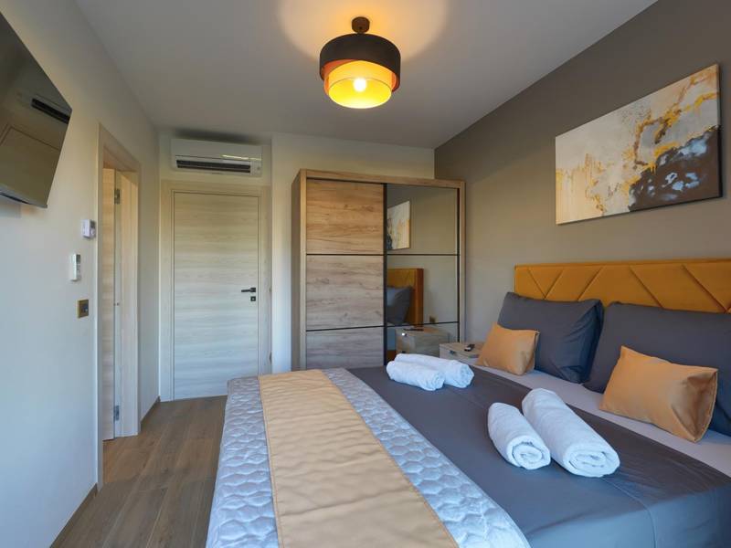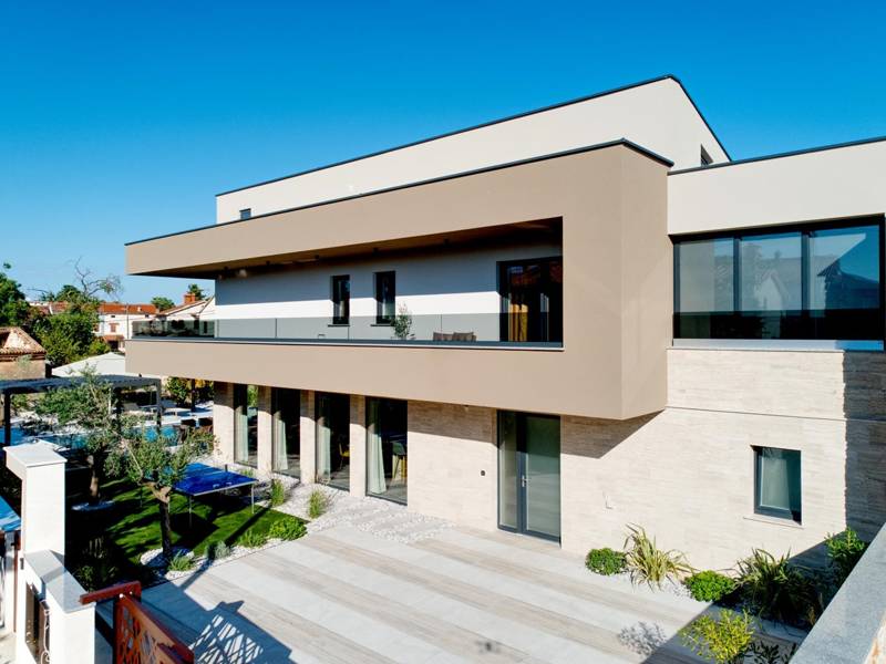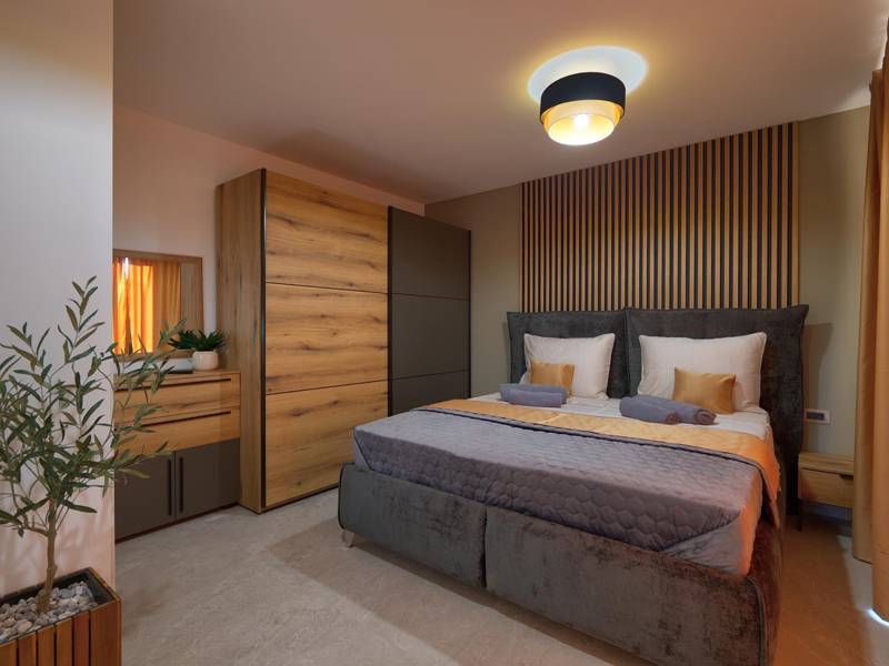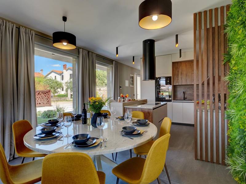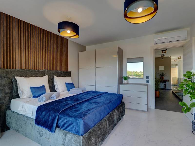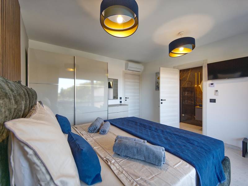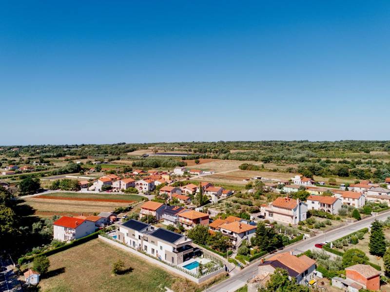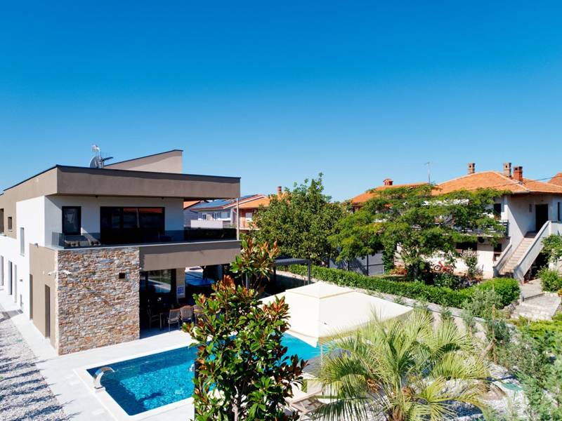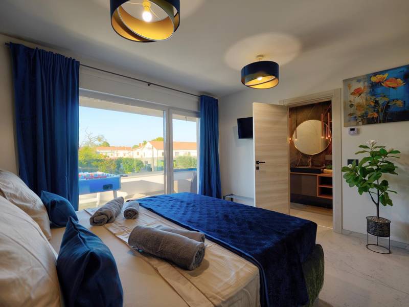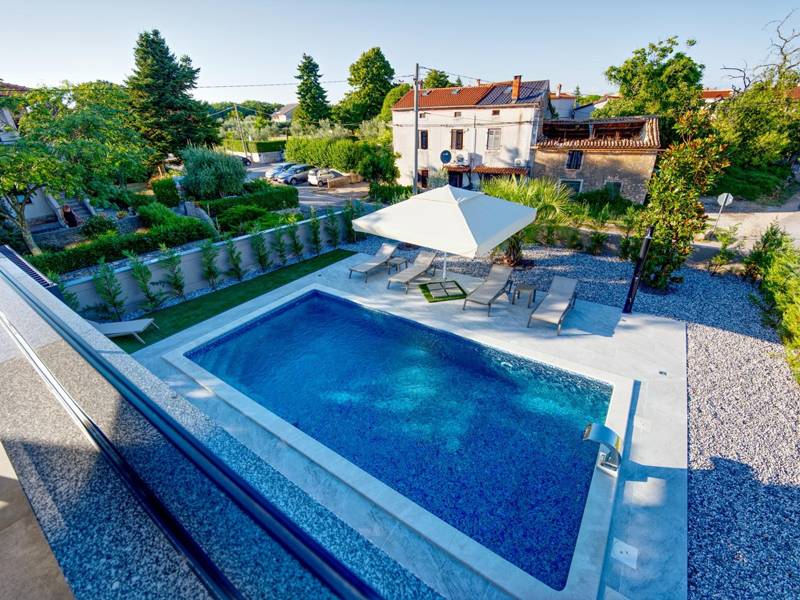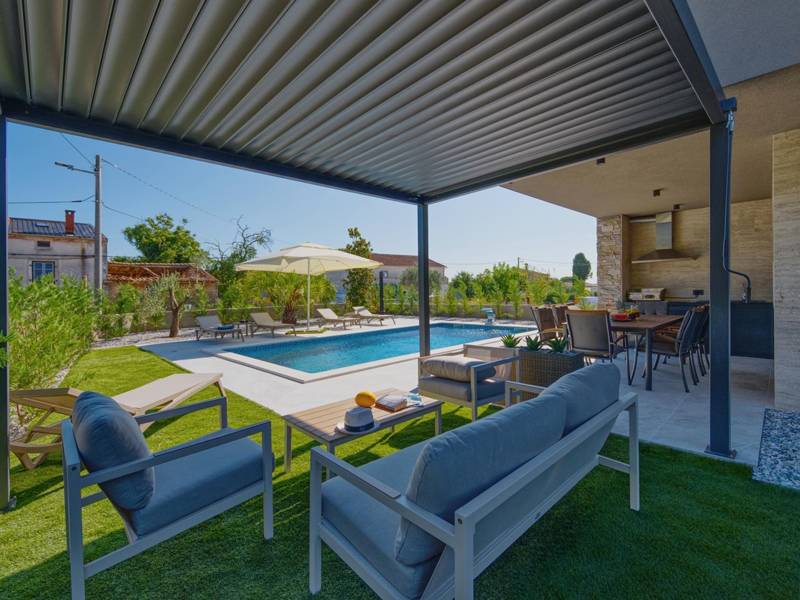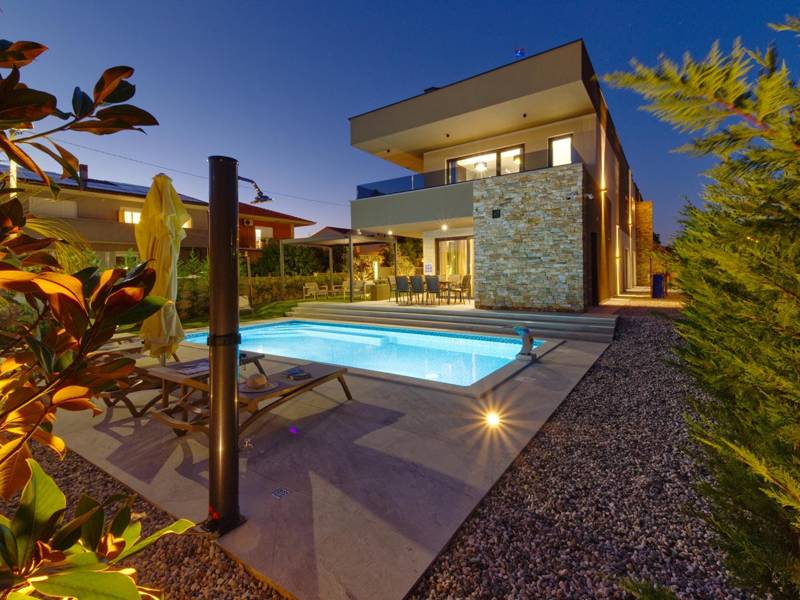 Diese beiden modernen Villen, Villa Bavigo und Villa Pieron, in der Nähe von Pula, sind ideal für einen privaten und komfortablen Urlaub. Sie sind nur durch die Rückwand verbunden und können einzeln oder zusammen gemietet werden, was sie ideal für größere Familien oder Gruppen von Freunden macht. Beide Villen bieten eine luxuriöse Unterkunft mit vier Schlafzimmern, vier Bädern, einem geräumigen Wohnzimmer und einer voll ausgestatteten Küche. Im Außenbereich gibt es einen privaten Pool mit Wasserfall, einen gemütlichen Essbereich, einen Grill und eine Sommerküche. In der ersten Etage jeder Villa befinden sich ein Wohnzimmer mit Zugang zur Terrasse, ein Schlafzimmer mit Doppelbett und ein Badezimmer, während sich in der zweiten Etage drei weitere Schlafzimmer befinden, jeweils mit eigenem Badezimmer und Zugang zur Terrasse. Auf dieser Etage befindet sich auch der Wellnessbereich mit Whirlpool und Sauna, in dem Sie sich während Ihres Aufenthalts vollkommen entspannen können. Jede Villa ist klimatisiert und für bis zu acht Personen geeignet, während beide Villen zusammen bis zu 16 Gäste beherbergen können. Im Garten befinden sich ein privater Pool, Liegestühle, Sonnenschirme und eine überdachte Terrasse, die sich hervorragend für abendliche Zusammenkünfte und Grillabende eignet. Der eingezäunte Hof garantiert absolute Privatsphäre, und pro Villa stehen zwei Privatparkplätze zur Verfügung. Buchen Sie eine oder beide Villen und sichern Sie sich einen unvergesslichen Urlaub im schönen Istrien. Hinweis: Haustiere und Jugendgruppen sind nur auf Anfrage erlaubt.