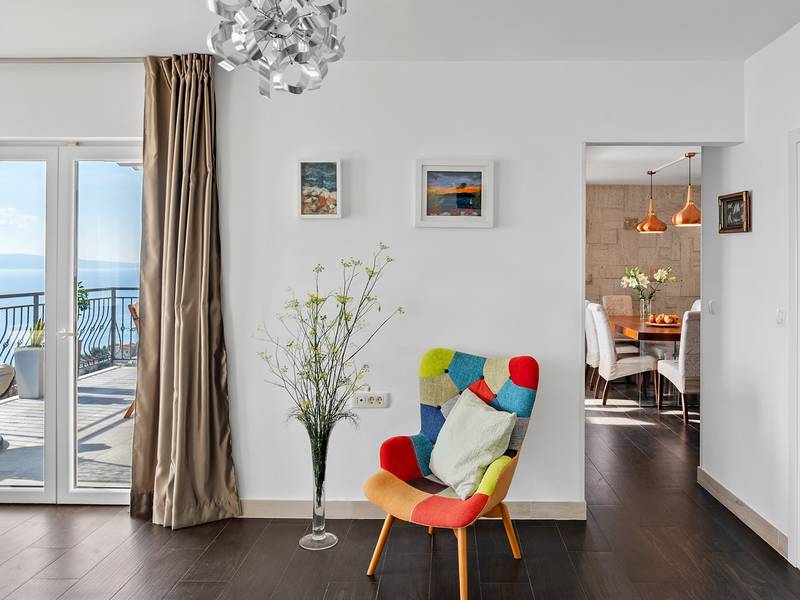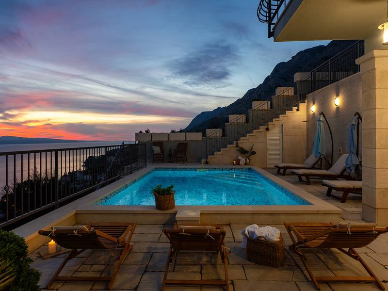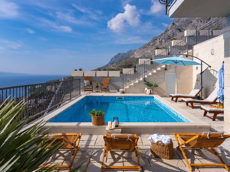 **Villa S&A** - ein komfortabler Rückzugsort mit beheiztem Privatpool Entdecken Sie die Villa S&A, eine ideale Unterkunft für bis zu 6 Personen, mit einem beheizten Privatpool und einem atemberaubenden Panoramablick auf das kristallklare türkisfarbene Wasser der Adria und die Insel Brač. Diese Villa garantiert Ihre Privatsphäre und befindet sich in einer friedlichen und ruhigen Gegend, die einen erholsamen Aufenthalt garantiert. Das Grundstück ist an einem Hang gelegen und besteht aus mehreren Ebenen mit einer Gesamtfläche von 500 m², wobei die Villa selbst 200 m² groß ist. Ein Auto wird empfohlen, und zwei Parkplätze sind für Ihre Bequemlichkeit reserviert. Die Villa ist voll klimatisiert und bietet kostenloses Wi-Fi. **Villa Layout:** *Erste Ebene:* - Der Haupteingang führt zu den Schlafzimmern, die umfassen: - **Schlafzimmer 1**: Hauptschlafzimmer mit einem Kingsize-Bett (180cm x 200cm), einem Balkon mit freiem Meerblick, einem eigenen Bad mit Dusche, Klimaanlage und einem Fernseher. - **Schlafzimmer 2**: Queen-Size-Bett (160cm x 200cm), Balkon mit offenem Meerblick, Klimaanlage und TV. - **Schlafzimmer 3**: Zwei Einzelbetten (90cm x 200cm), Balkon mit offenem Meerblick, Klimaanlage und TV. - Für die Zimmer 2 und 3 steht ein Familienbad mit Dusche zur Verfügung. Jedes Badezimmer ist mit Toilettenartikeln wie Shampoo, Conditioner, Duschgel, Bademänteln, Hausschuhen und Haartrocknern ausgestattet. *Untere Ebene:* - Eine Innentreppe führt in den geräumigen, offenen Wohnbereich, der einen atemberaubenden Meerblick bietet und mit dem Essbereich im Freien verbunden ist. Das Wohnzimmer verfügt über bequeme Sofas, einen Fernseher, eine Klimaanlage und eine voll ausgestattete Küche mit einem Essbereich für 8 Personen sowie einen gemütlichen Kamin. Die Küche ist mit modernen Geräten ausgestattet, darunter eine DeLonghi Espressomaschine, ein Mixer, eine Mikrowelle und ein Wasserkocher. Außerdem gibt es ein Familienbadezimmer mit einer Dusche und einer Waschmaschine. *Außenbereich:* - Der Essbereich im Freien ist bequem mit der Küche und dem Wohnzimmer verbunden und verfügt über einen überdachten Bereich mit einem Gasgrill und einem atemberaubenden Blick auf das Meer und die Insel, den Sie zu jeder Tages- und Nachtzeit genießen können. Angrenzend befindet sich ein Spielplatz für Kinder mit einem Trampolin, einem Holzspielhaus mit Rutsche und einer Schaukel. Zum Grundstück gehören auch 3 Mountainbikes, die Sie benutzen können. *Poolbereich:* - Über eine Außentreppe gelangen Sie in den Poolbereich, der einen privaten, beheizten 25 m² großen Pool mit Gegenstromanlage bietet, der absolute Privatsphäre gewährleistet. Hier finden Sie 6 Liegestühle und eine Lounge-Ecke, die zum Entspannen mit einem Glas Wein und einem guten Buch einladen, während Sie die spektakuläre Aussicht genießen. Die Villa S&A ist ein einzigartiger und geräumiger Rückzugsort, der für Ihren Komfort gut ausgestattet ist und von freundlichen Eigentümern verwaltet wird, die Ihnen gerne Informationen über lokale Sehenswürdigkeiten und Aktivitäten geben. Diese Villa ist wirklich ein perfekter Ort für Ihren idealen Urlaub. Willkommen in der Villa S&A in Mimice!