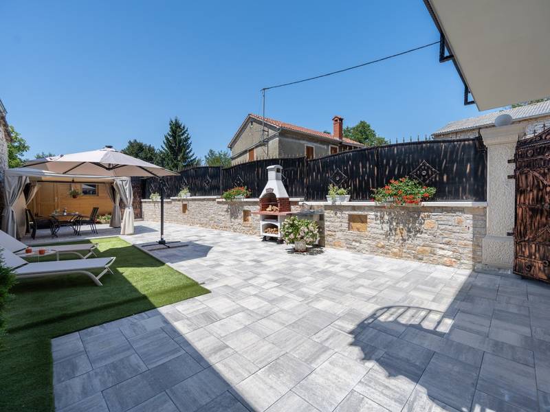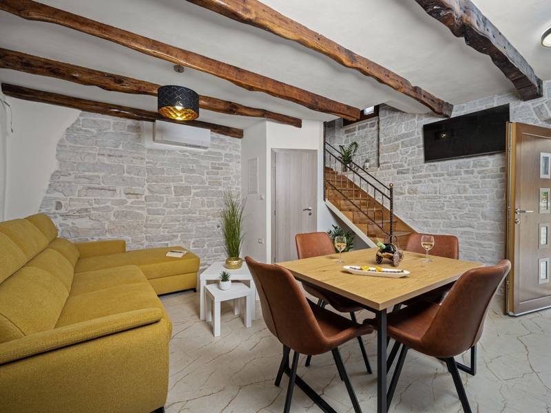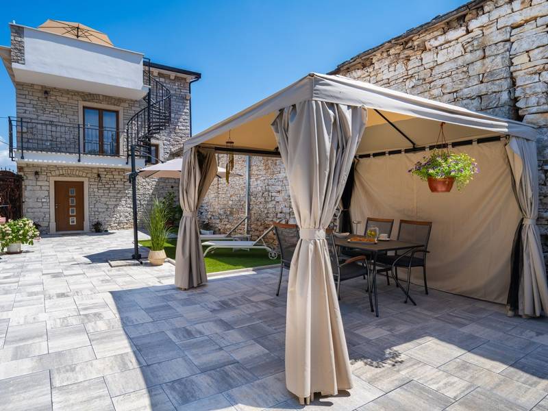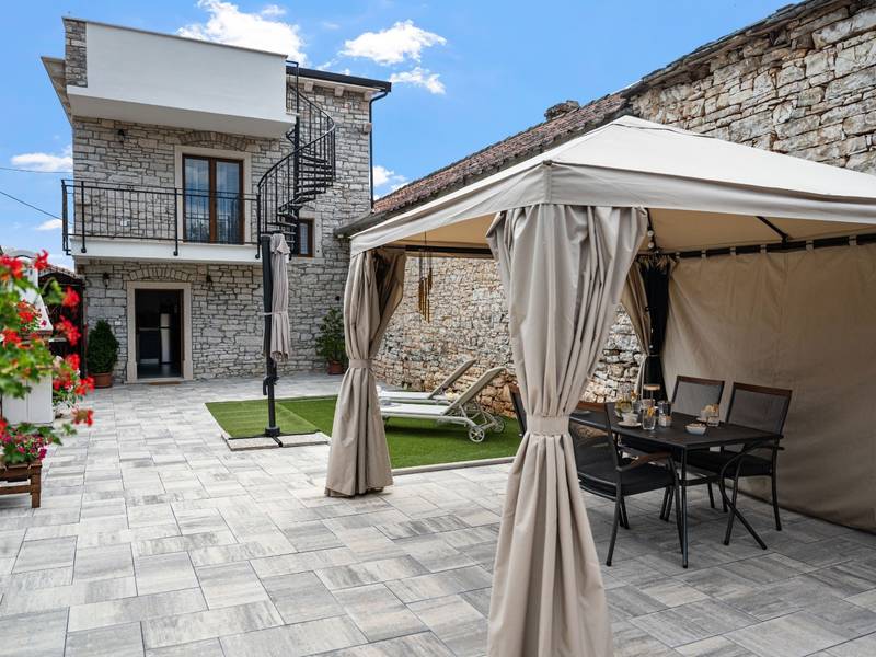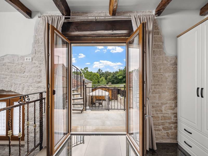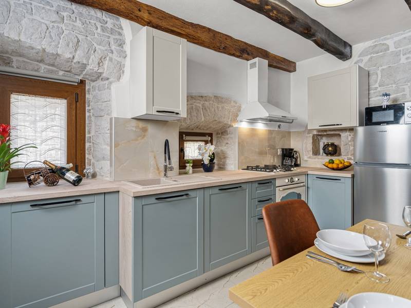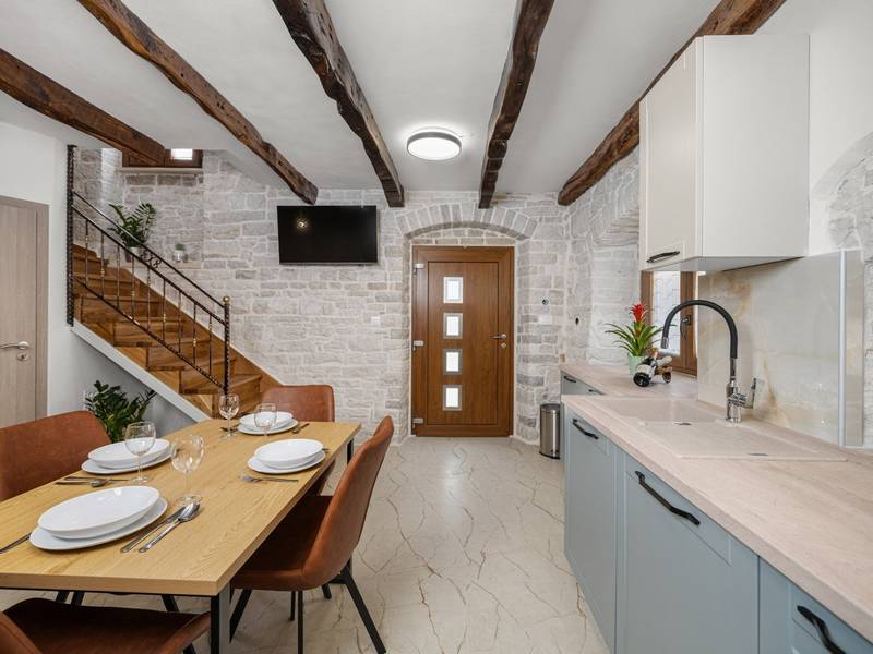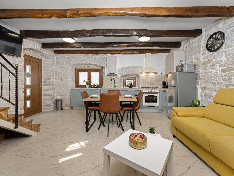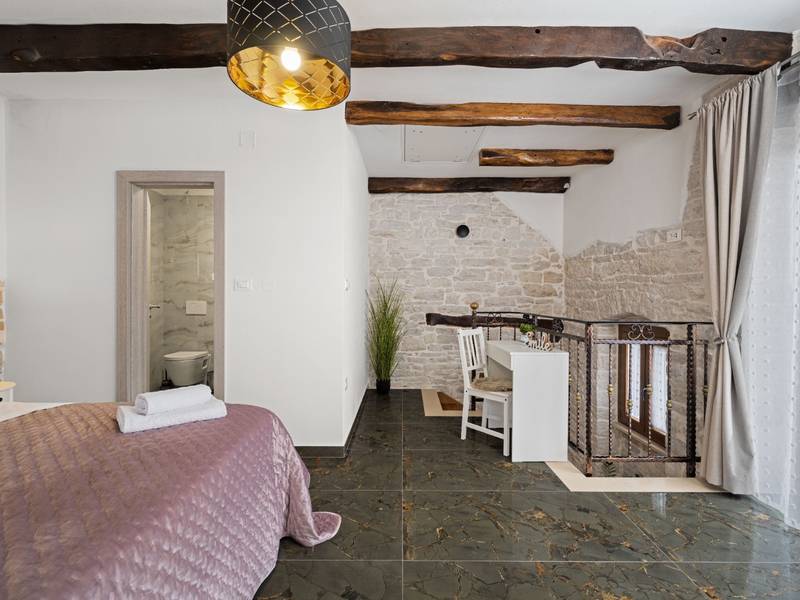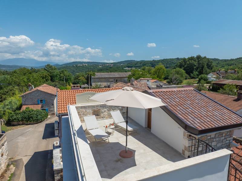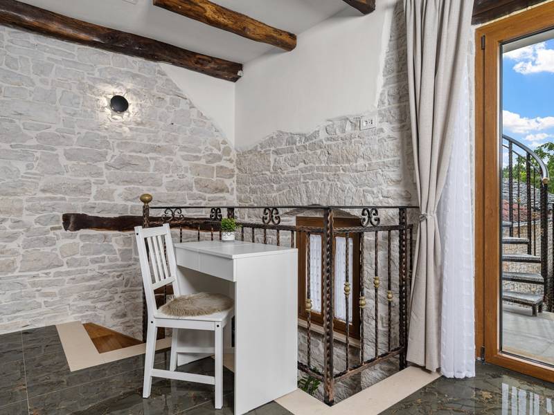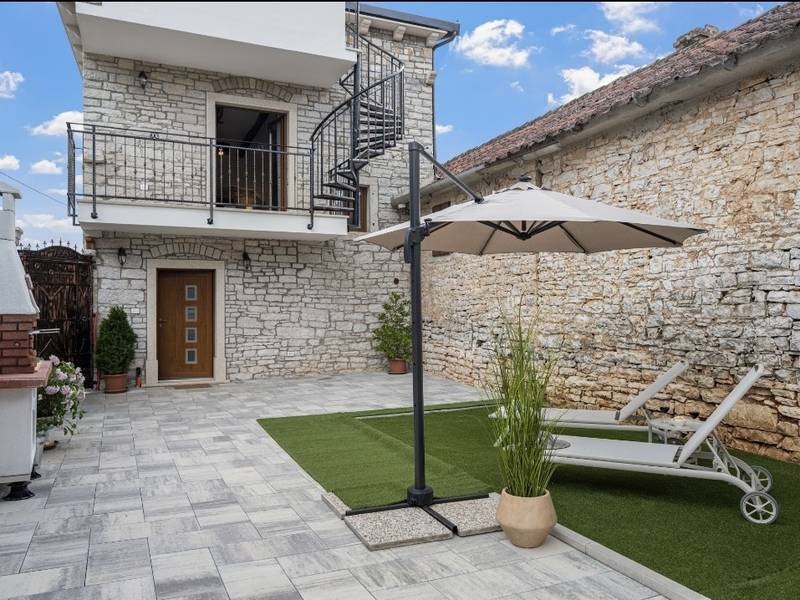 Die Villa Istria Mar erstreckt sich über zwei Etagen und bietet ca. 70 m2 komfortabel gestaltete Wohnfläche, ideal für zwei Gäste, die Ruhe, Privatsphäre und einen entspannten Aufenthalt in Istrien suchen. Im Erdgeschoss befindet sich ein heller Wohnbereich mit einer voll ausgestatteten modernen Küche und einem Essbereich sowie einem separaten Gäste-WC. Das Wohnzimmer öffnet sich direkt auf einen privaten Innenhof - ein perfekter Ort für den Morgenkaffee oder entspannte Abende an der frischen Luft. Dank Highspeed-Wi-Fi ist das Haus auch für Gäste geeignet, die Urlaub und Fernarbeit miteinander verbinden möchten. Im Obergeschoss befindet sich ein elegantes Schlafzimmer mit einem großen Doppelbett und einem eigenen Bad. Der Balkon bietet einen freien Blick auf die umliegende Natur - grüne Hügel, Wälder und weite Felder, die diese friedliche istrische Umgebung prägen. Vom Balkon führt eine Treppe zu einer Dachterrasse mit Liegestühlen, ideal zum Sonnenbaden, Lesen oder für romantische Abende unter dem Sternenhimmel. Ein privater Parkplatz direkt am Haus sorgt für einen sorgenfreien Aufenthalt. Obwohl die Villa in einer ruhigen Gegend liegt, ist sie nur 25 Autominuten von beliebten Zielen wie Poreč, Pula und Rovinj entfernt, wo Sie Strände, Restaurants und kulturelle Sehenswürdigkeiten genießen können. Dieses Anwesen ist nicht für Junggesellen-, Junggesellinnen- oder ähnliche Partys geeignet, um eine ruhige Umgebung für alle Gäste zu gewährleisten. Haustiere sind willkommen - ein Haustier ist erlaubt.