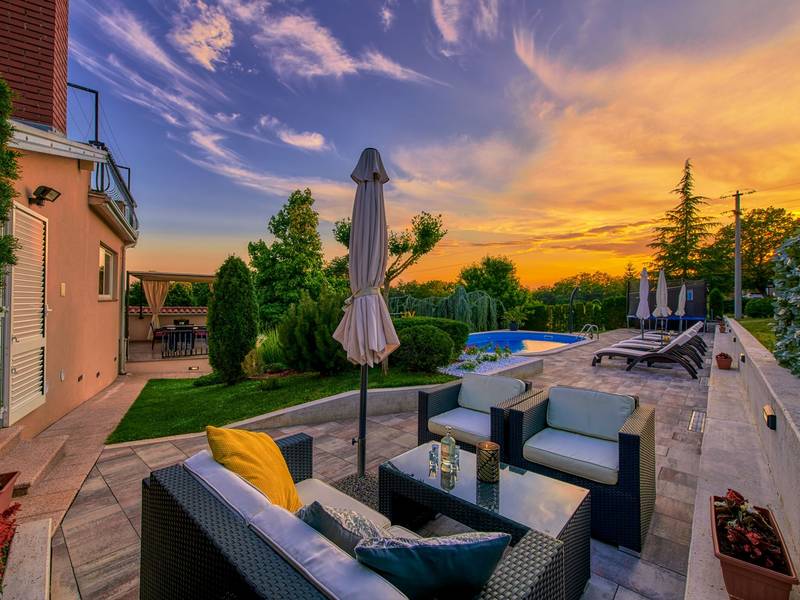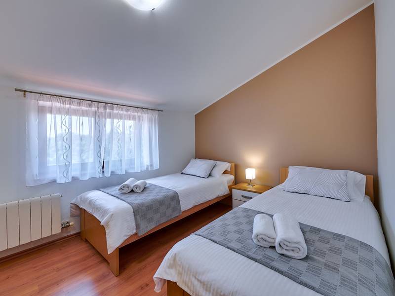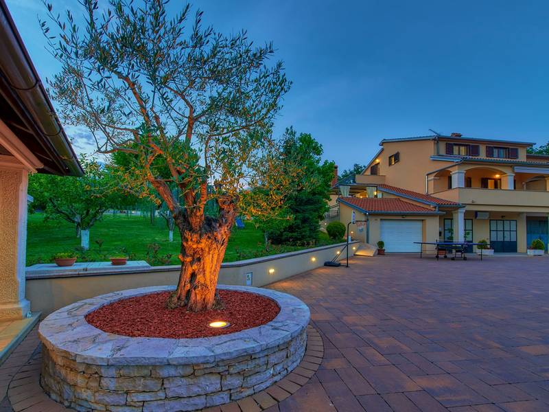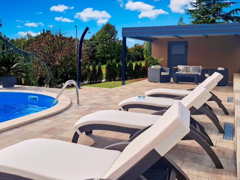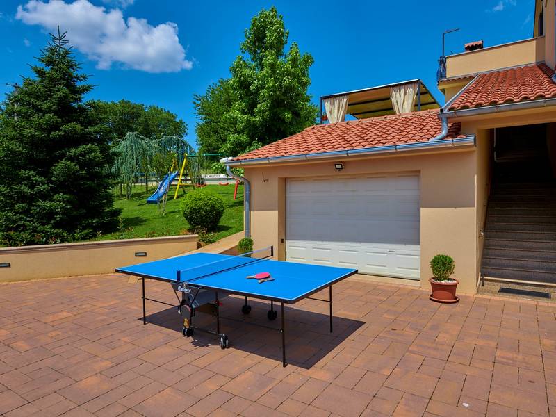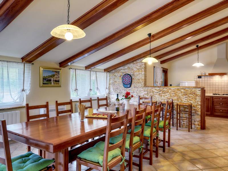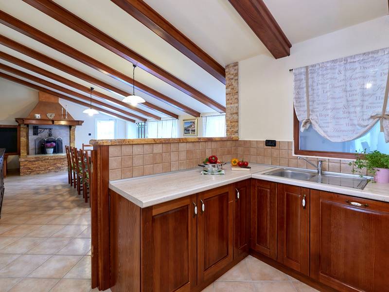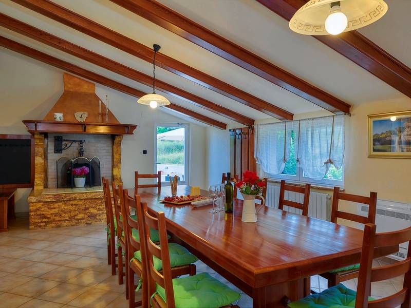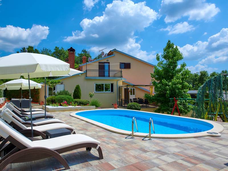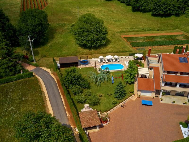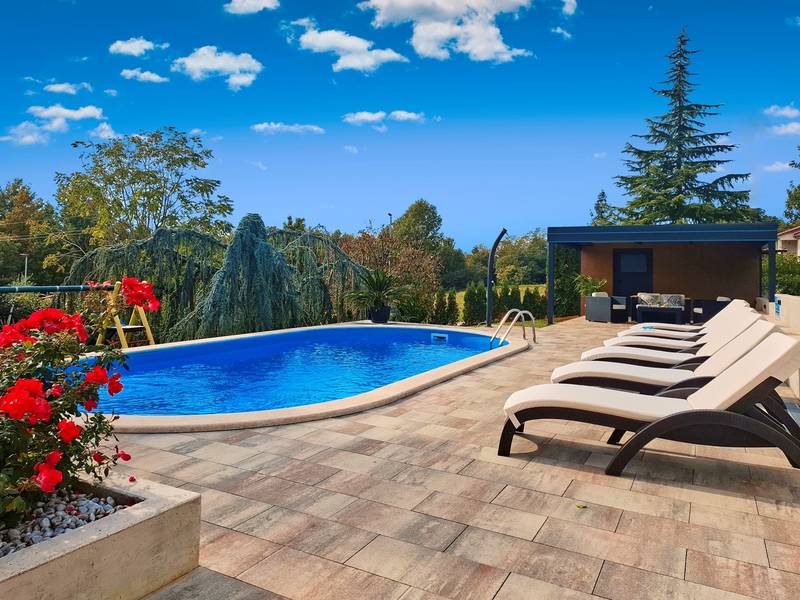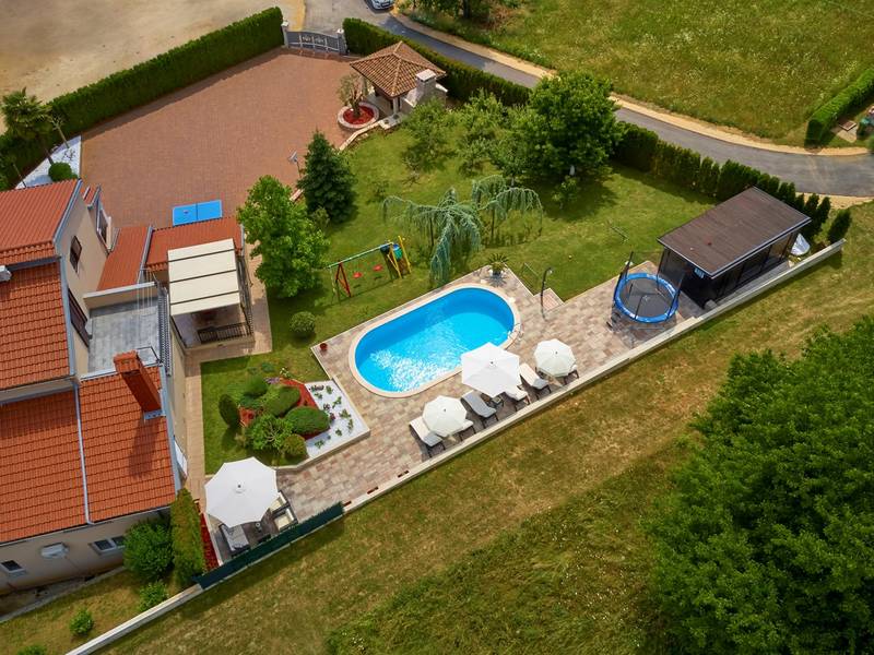 Das Ferienhaus Mikela liegt im Zentrum Istriens, im ruhigen Dorf Žbrlini in der Nähe von Pazin, und bietet Privatsphäre, Komfort und ausgezeichnete Annehmlichkeiten für Familien und Aktivreisende. Der vollständig umzäunte, 1.100 m2 große Garten bietet Sicherheit und Abgeschiedenheit und verfügt über einen privaten 32 m2 großen Außenpool mit Liegestühlen, Sonnenschirmen und hochwertigen Gartenmöbeln. Eine überdachte Terrasse mit einem Außenkamin bietet den perfekten Rahmen für Grillabende und entspannte Abende. Auf dem Grundstück befinden sich zahlreiche Freizeiteinrichtungen wie eine Schaukel, eine Rutsche, ein Basketballkorb, Tischtennis, Tischfußball und Darts. Das Haus erstreckt sich über zwei Etagen. Im Erdgeschoss befinden sich ein Wohnzimmer, eine Küche, ein Badezimmer, eine überdachte Terrasse und eine zusätzliche Küche mit einem großzügigen Aufenthaltsbereich mit direktem Zugang zum Pool. Im Obergeschoss befinden sich drei Schlafzimmer (zwei Doppel- und ein Zweibettzimmer), ein Badezimmer und eine Terrasse mit Blick auf den Pool und die Grünanlagen. Es bietet Platz für bis zu 8 Gäste (6+2). Alle Zimmer sind klimatisiert und mit Moskitonetzen ausgestattet. Im Erdgeschoss befindet sich eine kleine Familiendruckerei, die morgens geöffnet ist, und der überwachte Parkplatz wird während dieser Zeit mitbenutzt. In der Nähe befinden sich Rad- und Wanderwege, Weingüter, landwirtschaftliche Betriebe, Reitmöglichkeiten und die nur 6 km entfernte Erlebnishöhle Pazin.