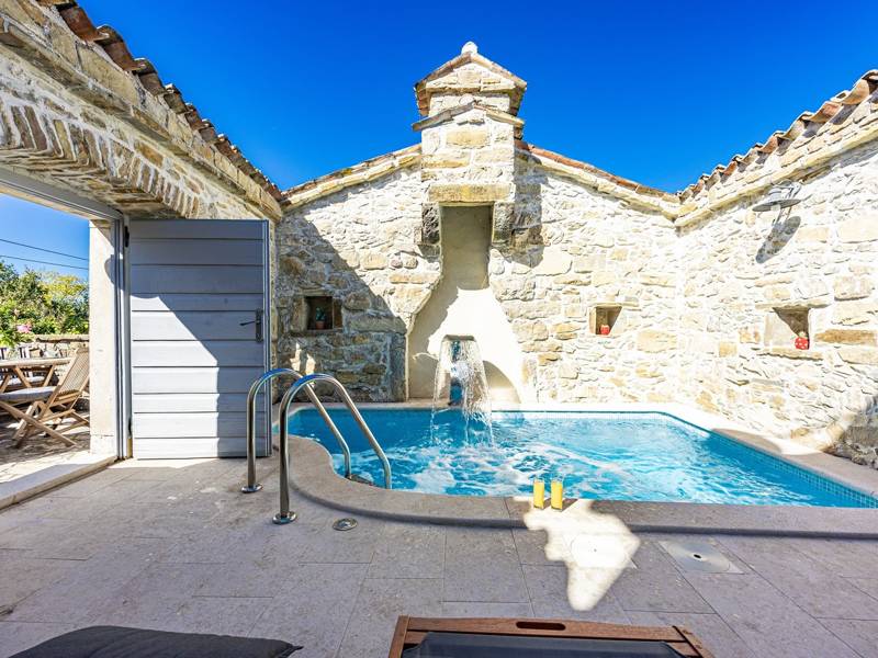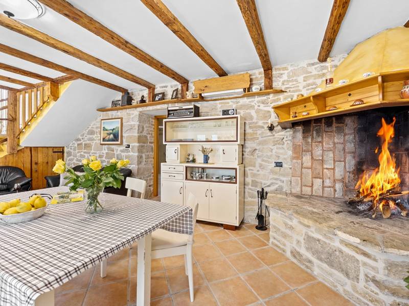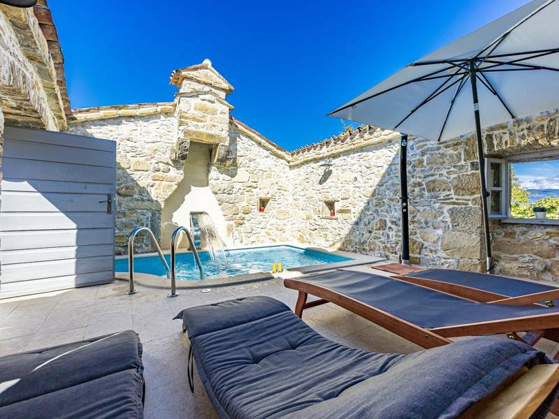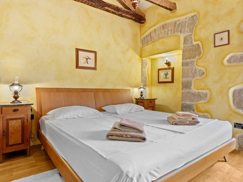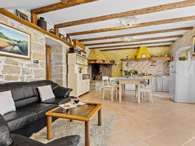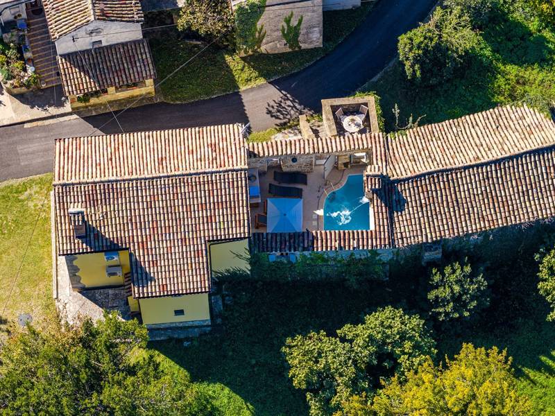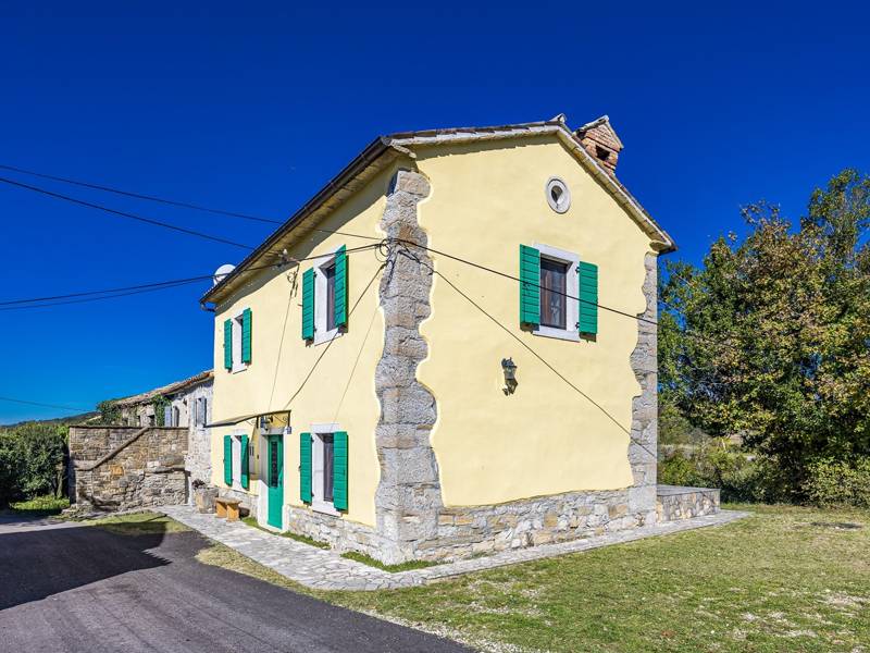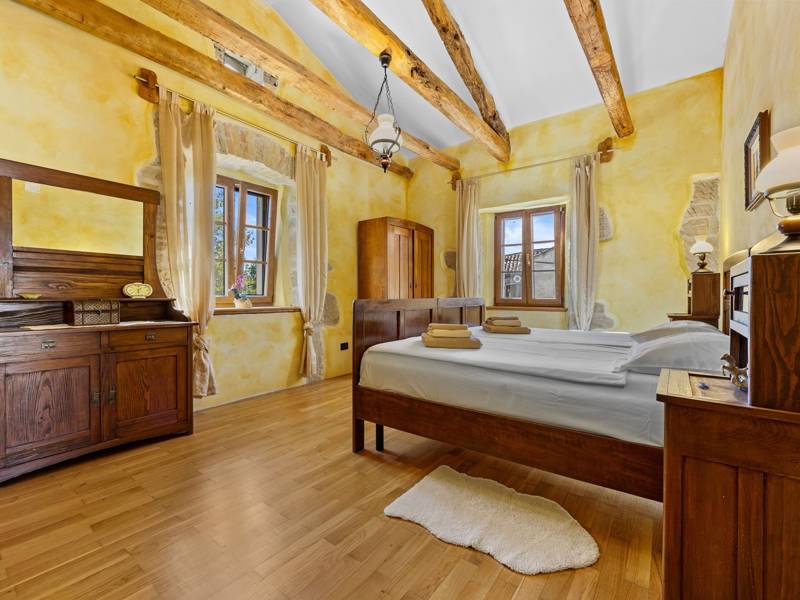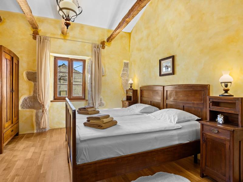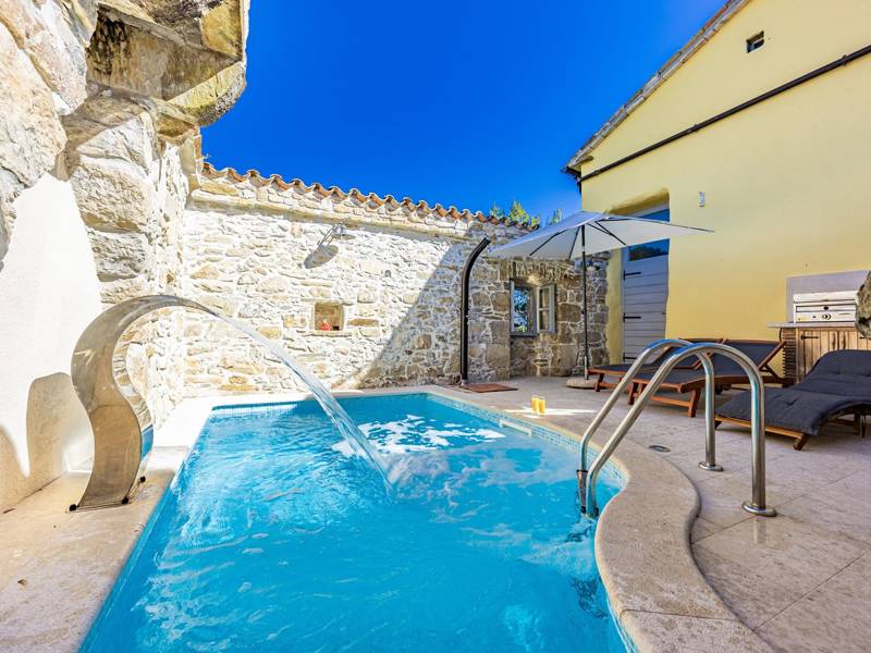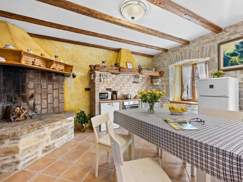 Die charmante Villa Franz Krbune befindet sich im Herzen der istrischen Landschaft und ist nur 15 Autominuten vom nächsten Strand in Luka Plomin entfernt. Sie bietet einen malerischen Ort für ein Familien- oder Freundestreffen oder einen besonderen Anlass und ist mit allen modernen Annehmlichkeiten ausgestattet, die Sie für einen erholsamen Urlaub benötigen. Das renovierte Steinhaus ist eine perfekte Mischung aus istrischem Altstein und Moderne. Die Innenräume der Villa Franz sind einfach, aber gemütlich, mit Holzdecken und Fenstern mit Blick auf den Berg Učka. Freigelegte Holzbalken, moderne Annehmlichkeiten, rustikale Möbelstücke und elegante Leuchten ergänzen die stilvollen Details und die Steinmauern verleihen dem Innenraum eine warme und einladende Ausstrahlung. Die klimatisierte und gut ausgestattete Küche und das moderne Wohnzimmer mit Holzkamin vereinen die alte und die neue Welt. Der Hauptbereich öffnet sich zu einem herrlichen Außenbereich mit einem Pool, der mit Massagedüsen ausgestattet ist. Die beiden Schlafzimmer der Villa Franz Krbune sind mit hellen Farben und lebhaften Mustern eingerichtet. Entspannen Sie sich in den Sitzecken im Freien, bereiten Sie das Abendessen am Kamin zu und genießen Sie es im Freien mit Blick auf die nahen Hügel und Berge.