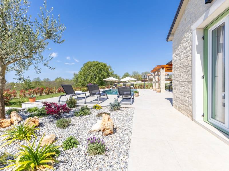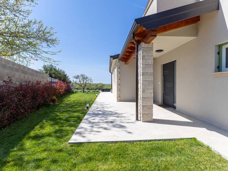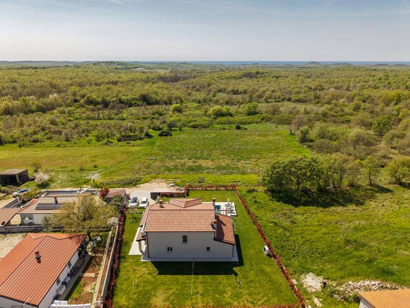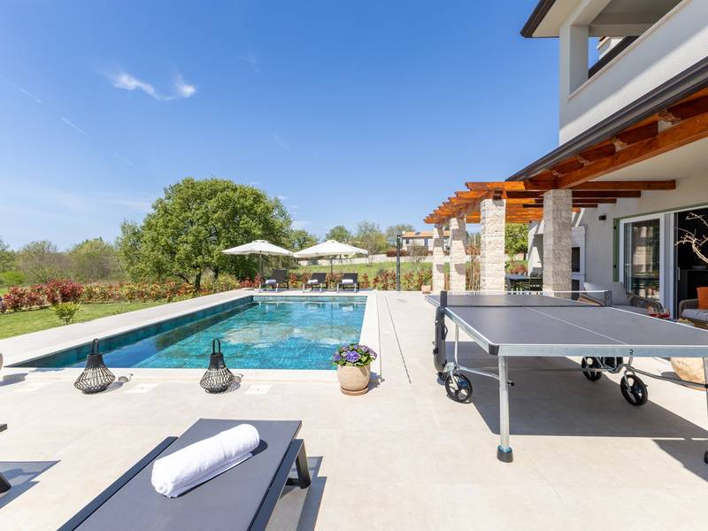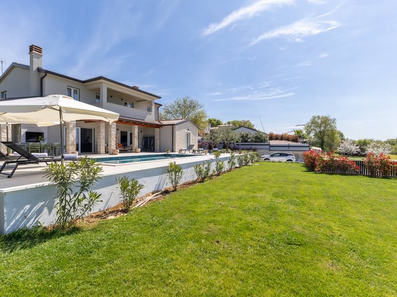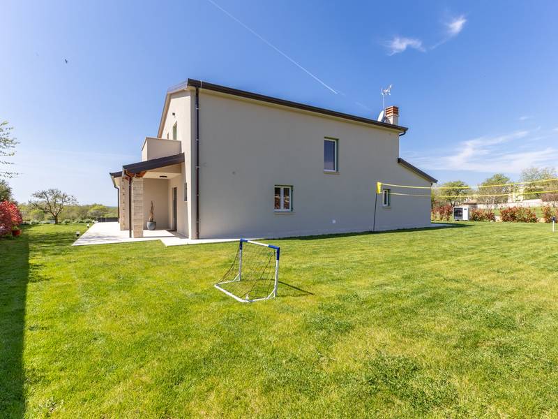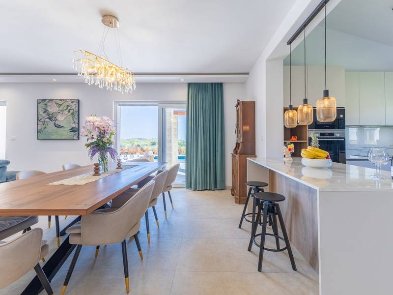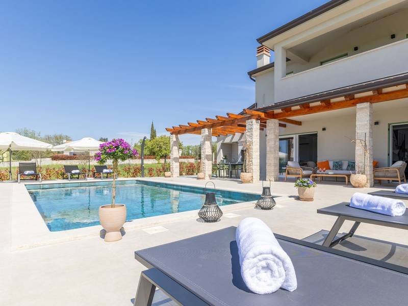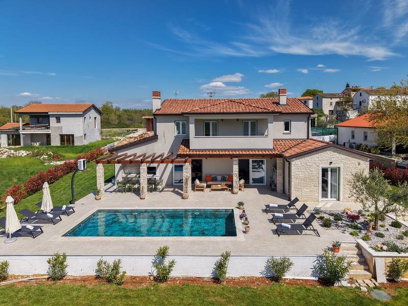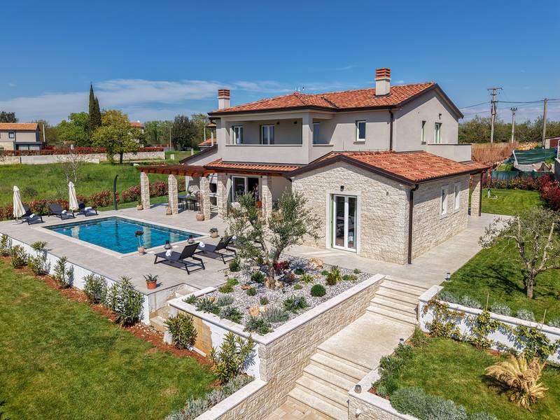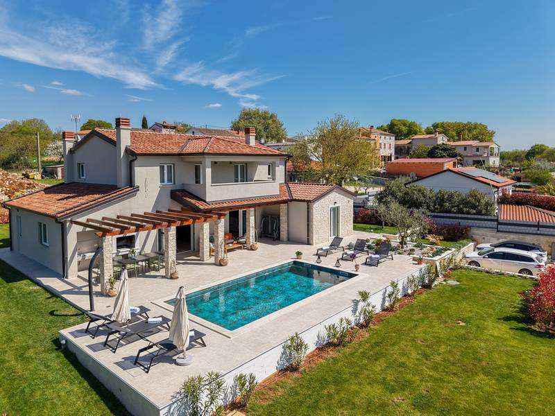 Im ruhigen Dorf Kirmenjak, in unmittelbarer Nähe von Poreč, gelegen, ist dieses moderne und elegante Ferienhaus die perfekte Wahl für einen entspannten Aufenthalt in Istrien. Umgeben von Grün und Natur, bietet es absolute Ruhe, Privatsphäre und bezaubernde Ausblicke, vor allem bei unvergesslichen Sonnenuntergängen. Das Haus wurde mit dem Schwerpunkt auf Komfort und Funktionalität entworfen und bietet Platz für bis zu acht Personen. Es verfügt über vier geräumige Schlafzimmer, jedes mit eigenem Bad, so dass ein Maximum an Privatsphäre für alle Gäste gewährleistet ist. Das Innere ist modern eingerichtet und komplett ausgestattet, und das geräumige Wohnzimmer, das mit dem Esszimmer und der modernen Küche verbunden ist, ist ein zentraler Treffpunkt. Das Haus ist besonders wertvoll wegen seines Kinderspielzimmers, das ideal für Familien mit Kindern ist, sowie wegen des Außenbereichs, der sorgfältig für das Vergnügen im Freien eingerichtet wurde. Vor dem Haus befindet sich ein großer privater Swimmingpool (32 m2), der von Liegestühlen und einer Liegewiese umgeben ist und an warmen Sommertagen zur Erfrischung einlädt. Ein privater Parkplatz steht den Gästen ebenfalls zur Verfügung und das gesamte Anwesen strahlt die Harmonie von modernem Design und natürlicher Umgebung aus. Dieses Ferienhaus ist die ideale Wahl für alle, die eine Kombination aus Luxus, Komfort und authentischem istrischem Ambiente suchen, nur wenige Autominuten vom Meer und dem malerischen Zentrum von Poreč entfernt.