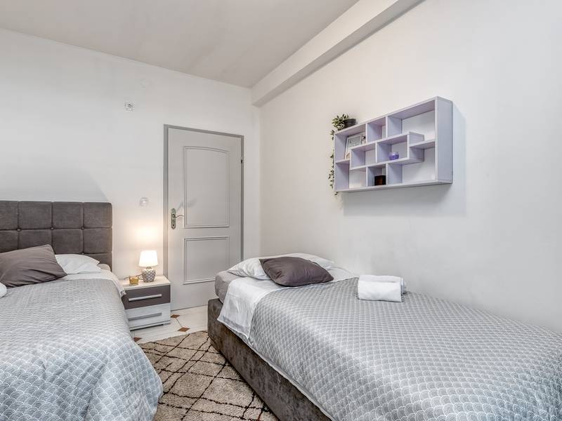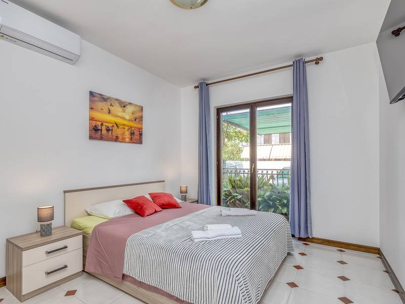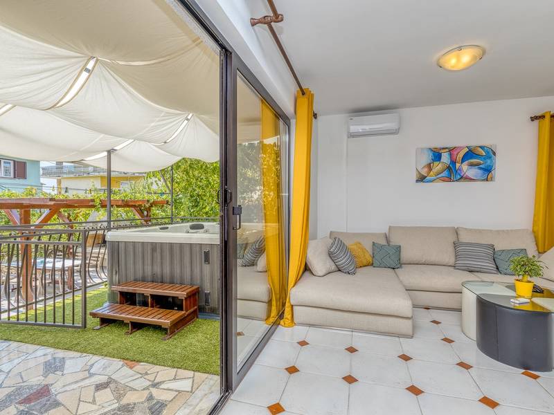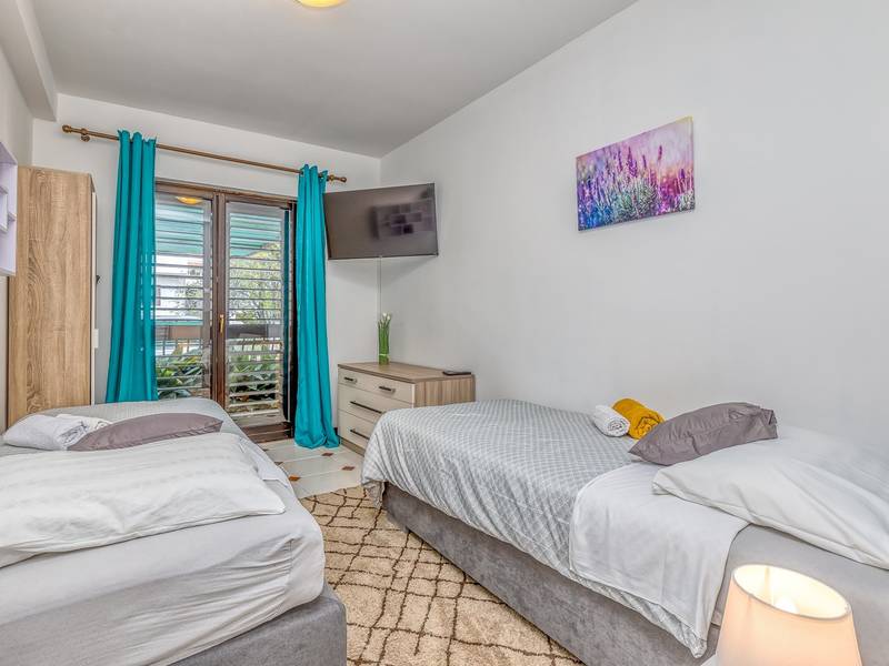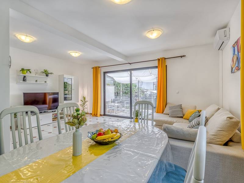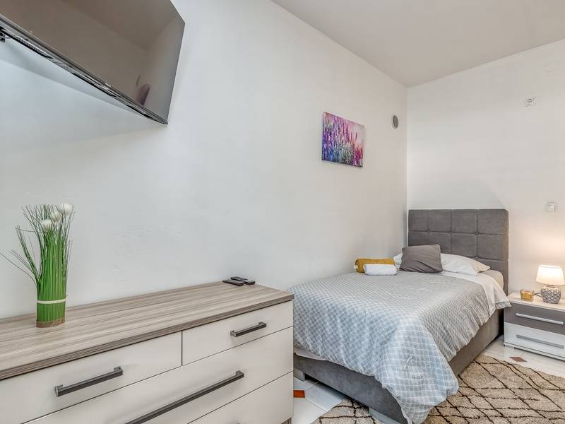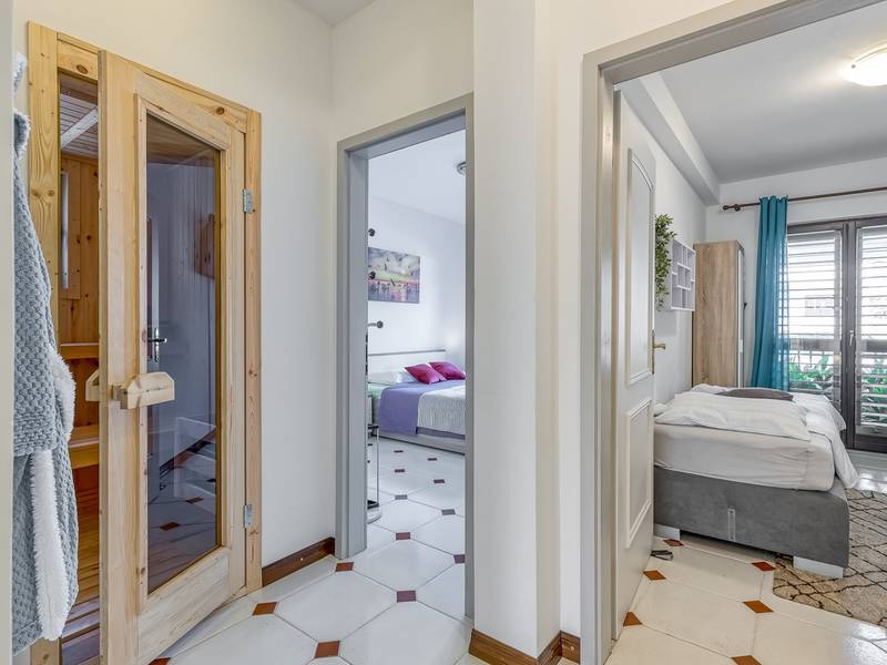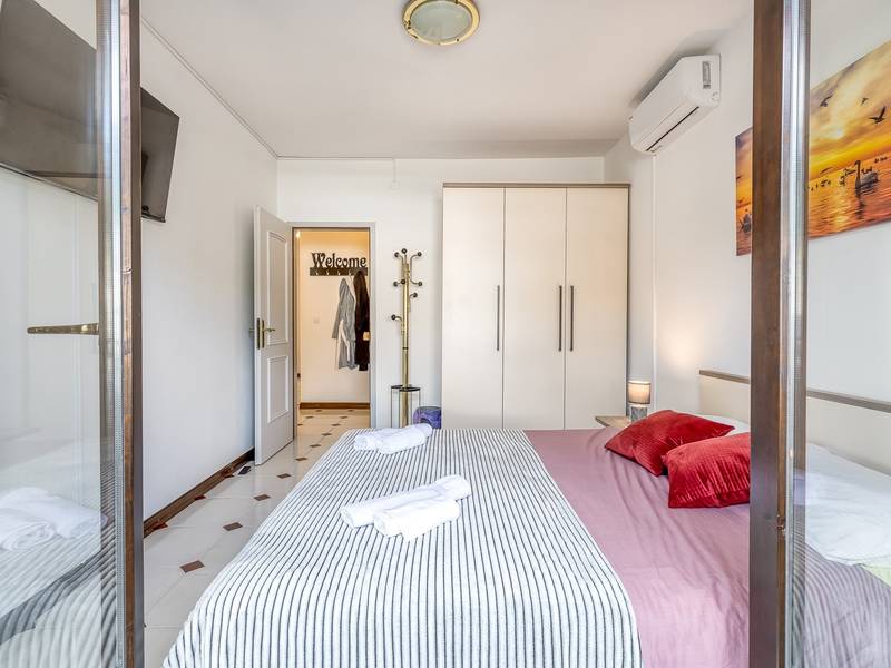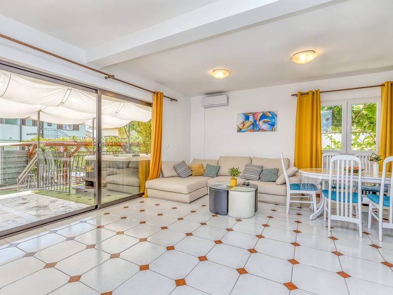 Diese schön eingerichtete klimatisierte Wohnung von 80m2 mit einem reichen Inhalt befindet sich in einer großartigen Lage in der Nähe des Stadtzentrums. Es ist nur 700m vom Meer entfernt. Die Wohnung besteht aus zwei Schlafzimmern, eines mit einem Doppelbett und eines mit zwei Einzelbetten, ein Badezimmer mit Dusche, eine ausgestattete Küche und ein geräumiges Wohnzimmer. Es gibt eine Sauna im zentralen Teil der Wohnung und einen Whirlpool auf der überdachten Terrasse, die Sie nach dem Schwimmen im Meer und dem Sonnenbaden an den schönen Stränden in der Nähe genießen können. An warmen Sommerabenden können Sie sich auf der Terrasse aufhalten, während Sie auf dem Grill etwas zubereiten. Die Wohnung verfügt über einen geräumigen Hof, in dem Sie sich auf Liegestühlen sonnen oder einfach in geselliger Runde entspannen können. In dieser Lage gibt es ausgezeichnete Restaurants, Weinhandlungen und Einkaufszentren in der Nähe. Sie können zu Fuß ins Stadtzentrum gehen und die vielen Einrichtungen, die diese schöne Stadt bietet, genießen.