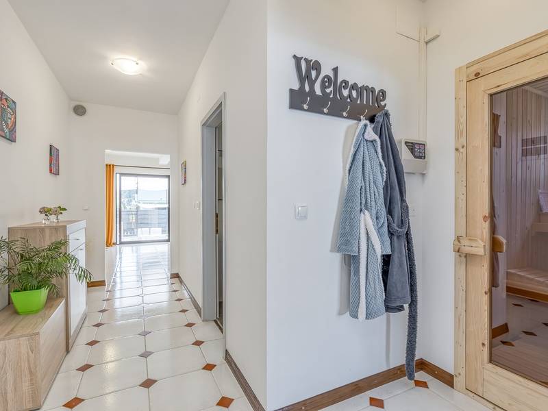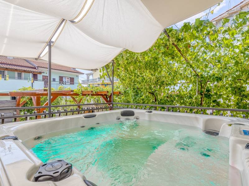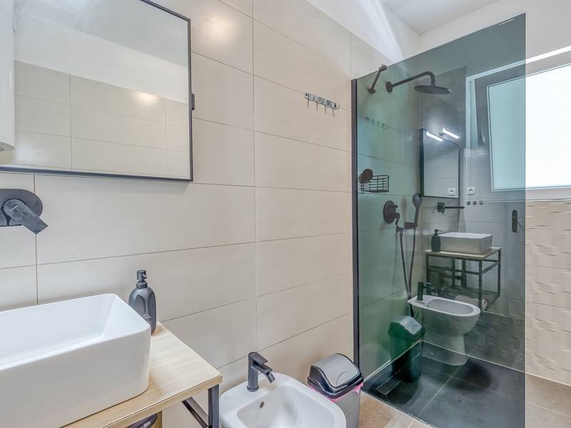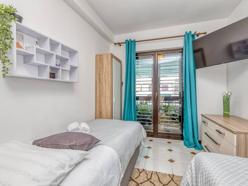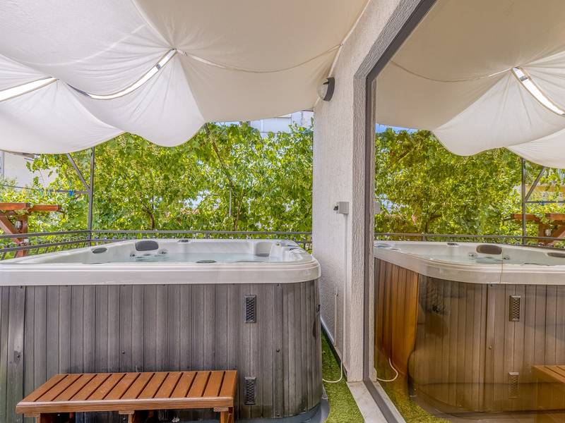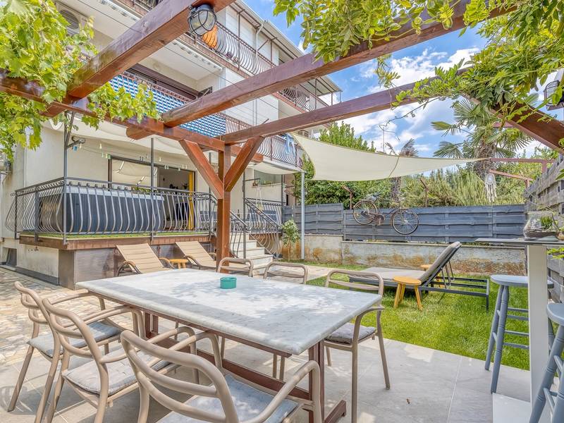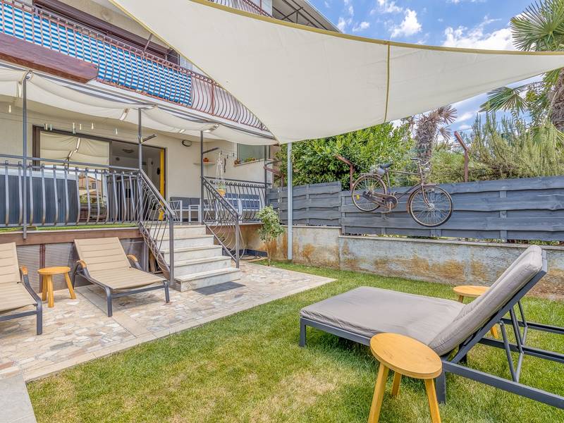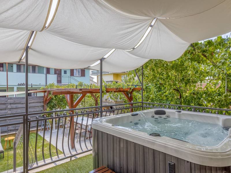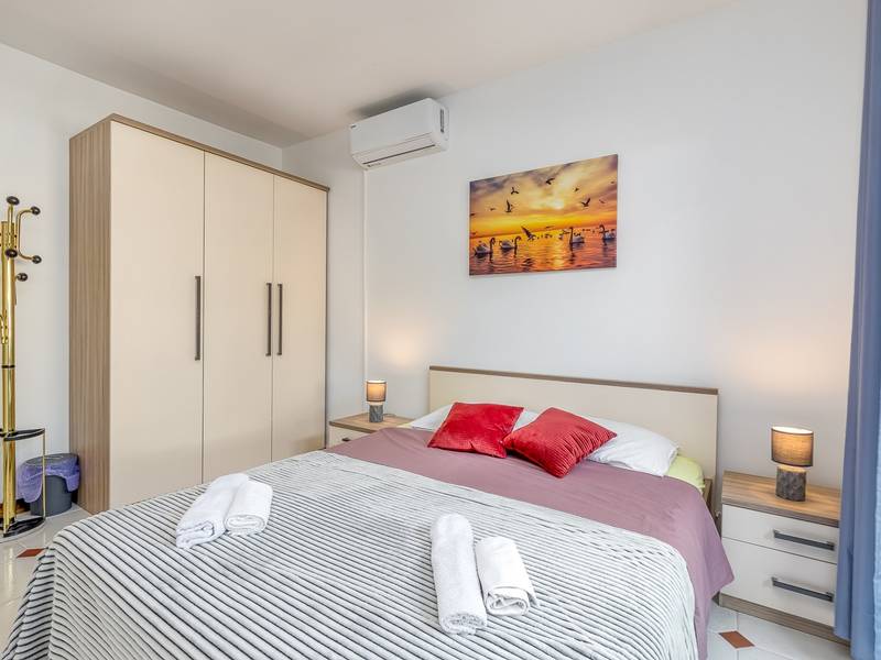 Diese schön eingerichtete klimatisierte Wohnung von 80m2 mit einem reichen Inhalt befindet sich in einer großartigen Lage in der Nähe des Stadtzentrums. Es ist nur 700m vom Meer entfernt. Die Wohnung besteht aus zwei Schlafzimmern, eines mit einem Doppelbett und eines mit zwei Einzelbetten, ein Badezimmer mit Dusche, eine ausgestattete Küche und ein geräumiges Wohnzimmer. Es gibt eine Sauna im zentralen Teil der Wohnung und einen Whirlpool auf der überdachten Terrasse, die Sie nach dem Schwimmen im Meer und dem Sonnenbaden an den schönen Stränden in der Nähe genießen können. An warmen Sommerabenden können Sie sich auf der Terrasse aufhalten, während Sie auf dem Grill etwas zubereiten. Die Wohnung verfügt über einen geräumigen Hof, in dem Sie sich auf Liegestühlen sonnen oder einfach in geselliger Runde entspannen können. In dieser Lage gibt es ausgezeichnete Restaurants, Weinhandlungen und Einkaufszentren in der Nähe. Sie können zu Fuß ins Stadtzentrum gehen und die vielen Einrichtungen, die diese schöne Stadt bietet, genießen.