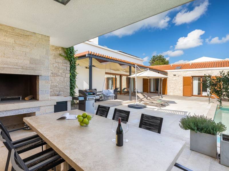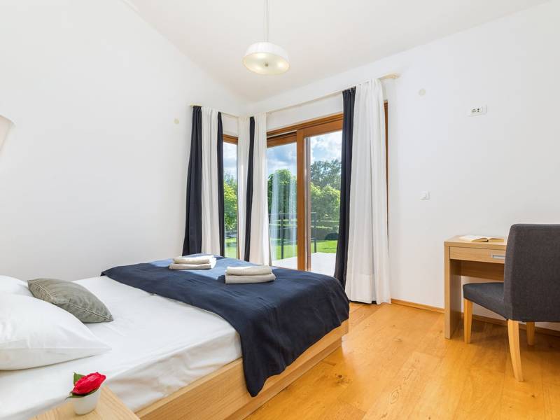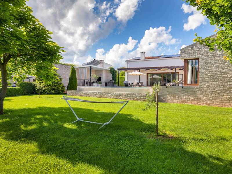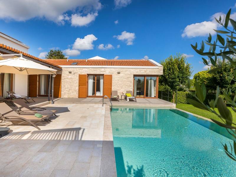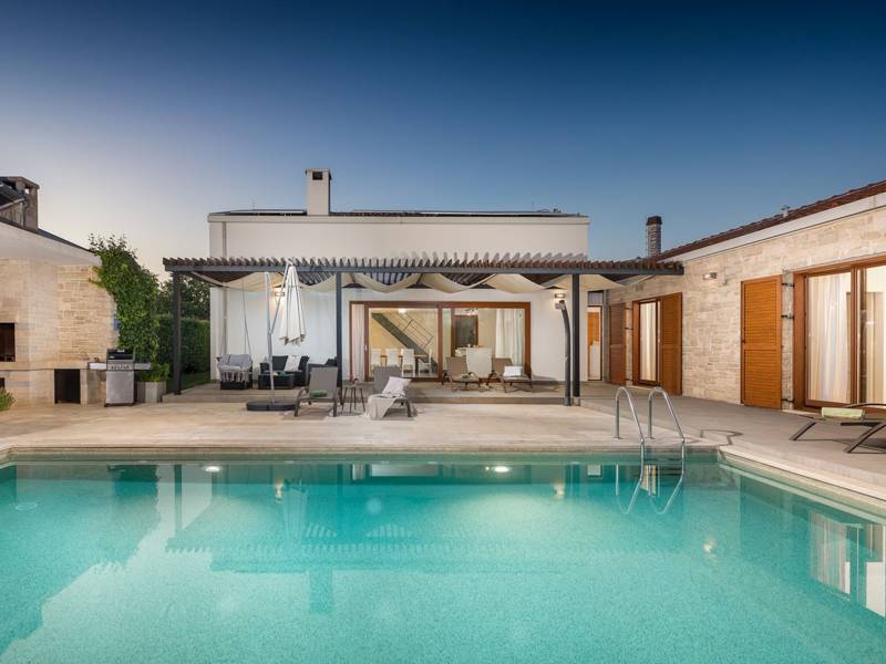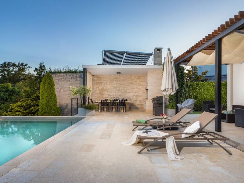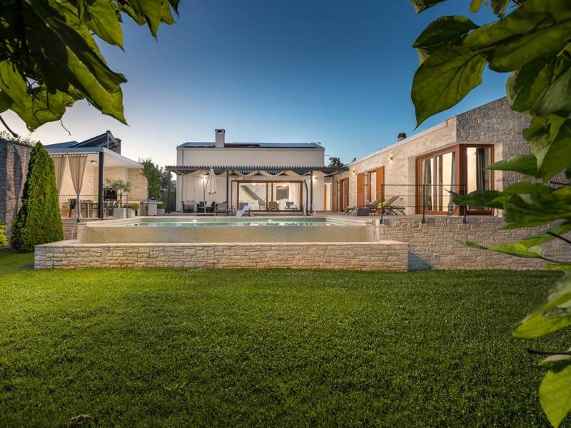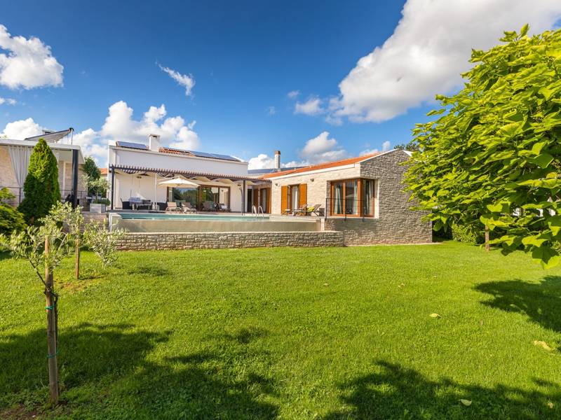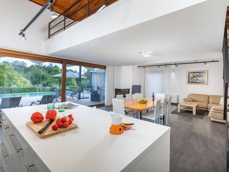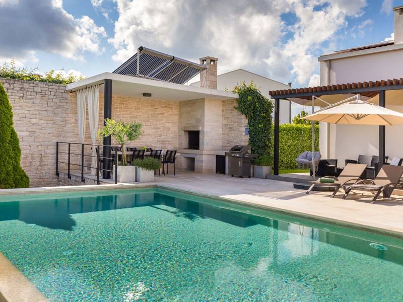 Entdecken Sie die perfekte Mischung aus Luxus und Komfort in der wunderschönen Villa Terra Nera, die sich in dem kleinen Dorf Sveti Petar u Šumi befindet, eingebettet in einen kleinen, exklusiven Komplex von fünf Villen. Dieses atemberaubende Anwesen verfügt über einen wunderschön angelegten Garten mit einem großen Infinity-Pool, der einen ruhigen Rückzugsort von der Hektik des Alltags bietet. Treten Sie hinaus auf die geräumige überdachte Terrasse, wo ein Grill und ein Esstisch auf Sie warten, perfekt für Mahlzeiten im Freien. Der Außenbereich ist zum Entspannen und geselligen Beisammensein gedacht, so dass Sie die Sonne genießen oder unter den Sternen speisen können. Im Inneren der Villa gibt es einen offenen Wohnbereich. Die voll ausgestattete Küche, das Esszimmer und das Wohnzimmer mit einem gemütlichen Kamin gehen nahtlos ineinander über und schaffen eine warme und einladende Atmosphäre. Die Villa bietet bequem Platz für bis zu 7 Personen, mit drei wunderschön eingerichteten Schlafzimmern im Erdgeschoss - jedes mit direktem Zugang zum Pool und eigenem Bad für ultimative Privatsphäre und Komfort. Ein Schlafsofa auf der Galerie des Wohnzimmers bietet zusätzlichen Platz zum Schlafen. Zu den weiteren Annehmlichkeiten gehören überdachte Parkplätze für zwei Autos. Die Villa ist nur 100 Meter vom nächsten Lebensmittelgeschäft und 1 km von einem lokalen Restaurant entfernt, so dass Sie die lokale Küche genießen können. Diese Villa ist die ideale Wahl für alle, die einen luxuriösen und ruhigen Rückzugsort im Herzen Istriens suchen, mit allem Komfort von zu Hause und der Eleganz einer hochwertigen Ferienresidenz. Ob Sie sich am Infinity-Pool entspannen oder den Komfort des schicken Wohnbereichs genießen, diese Villa verspricht einen unvergesslichen und entspannten Aufenthalt.