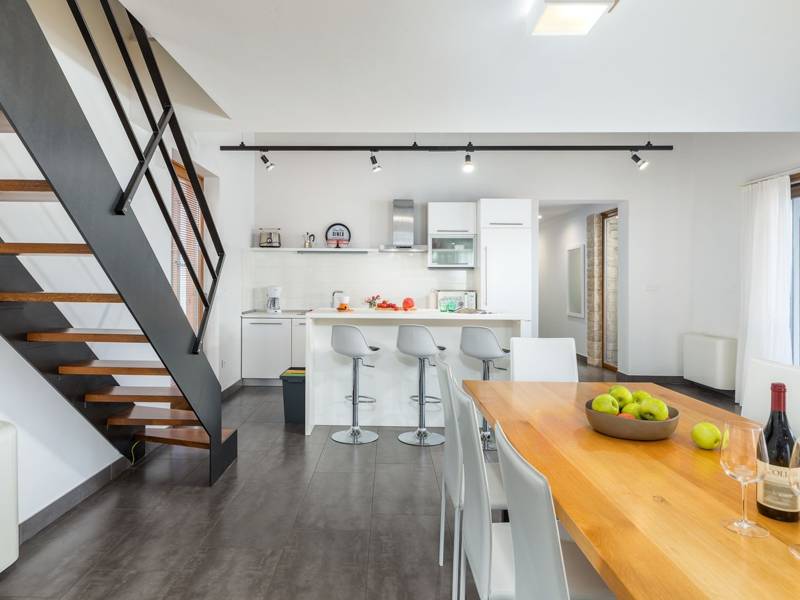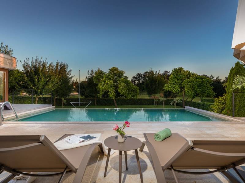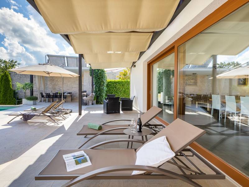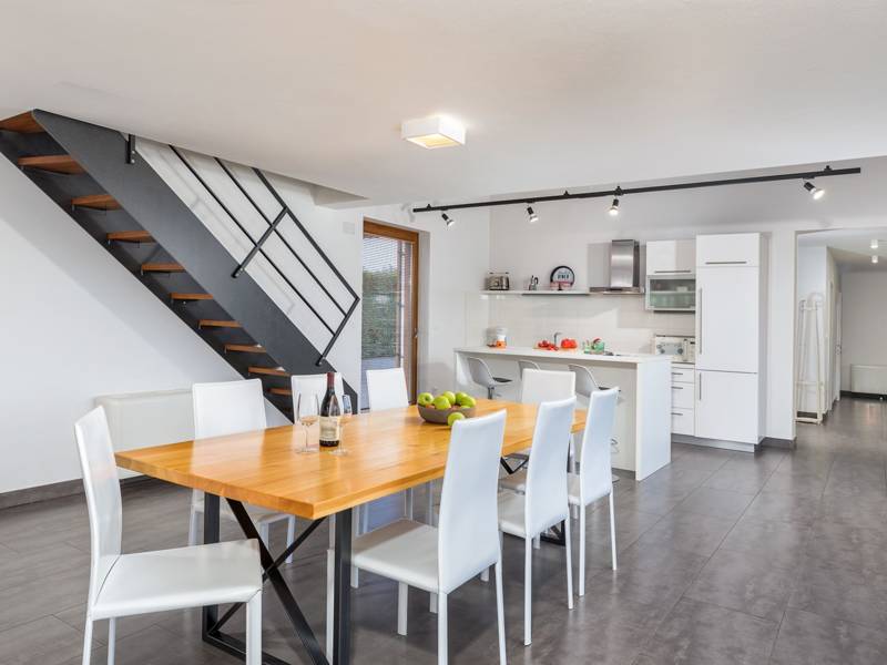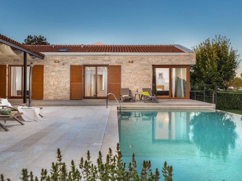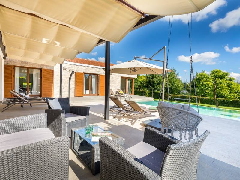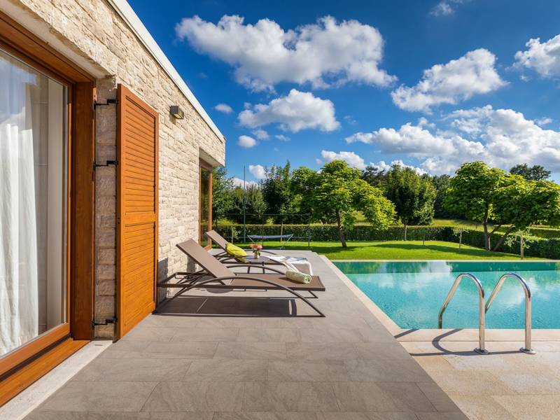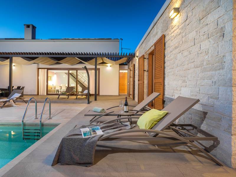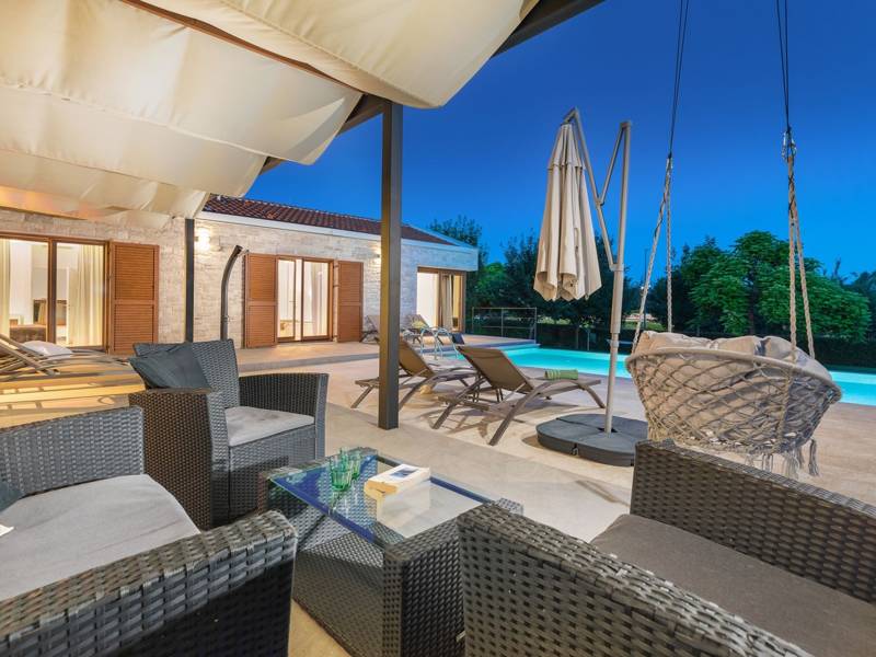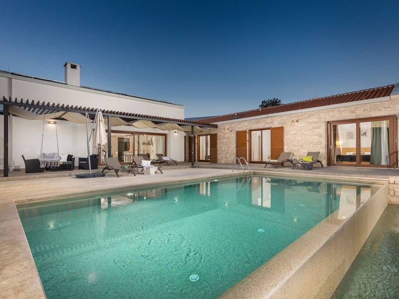 Entdecken Sie die perfekte Mischung aus Luxus und Komfort in der wunderschönen Villa Terra Nera, die sich in dem kleinen Dorf Sveti Petar u Šumi befindet, eingebettet in einen kleinen, exklusiven Komplex von fünf Villen. Dieses atemberaubende Anwesen verfügt über einen wunderschön angelegten Garten mit einem großen Infinity-Pool, der einen ruhigen Rückzugsort von der Hektik des Alltags bietet. Treten Sie hinaus auf die geräumige überdachte Terrasse, wo ein Grill und ein Esstisch auf Sie warten, perfekt für Mahlzeiten im Freien. Der Außenbereich ist zum Entspannen und geselligen Beisammensein gedacht, so dass Sie die Sonne genießen oder unter den Sternen speisen können. Im Inneren der Villa gibt es einen offenen Wohnbereich. Die voll ausgestattete Küche, das Esszimmer und das Wohnzimmer mit einem gemütlichen Kamin gehen nahtlos ineinander über und schaffen eine warme und einladende Atmosphäre. Die Villa bietet bequem Platz für bis zu 7 Personen, mit drei wunderschön eingerichteten Schlafzimmern im Erdgeschoss - jedes mit direktem Zugang zum Pool und eigenem Bad für ultimative Privatsphäre und Komfort. Ein Schlafsofa auf der Galerie des Wohnzimmers bietet zusätzlichen Platz zum Schlafen. Zu den weiteren Annehmlichkeiten gehören überdachte Parkplätze für zwei Autos. Die Villa ist nur 100 Meter vom nächsten Lebensmittelgeschäft und 1 km von einem lokalen Restaurant entfernt, so dass Sie die lokale Küche genießen können. Diese Villa ist die ideale Wahl für alle, die einen luxuriösen und ruhigen Rückzugsort im Herzen Istriens suchen, mit allem Komfort von zu Hause und der Eleganz einer hochwertigen Ferienresidenz. Ob Sie sich am Infinity-Pool entspannen oder den Komfort des schicken Wohnbereichs genießen, diese Villa verspricht einen unvergesslichen und entspannten Aufenthalt.
