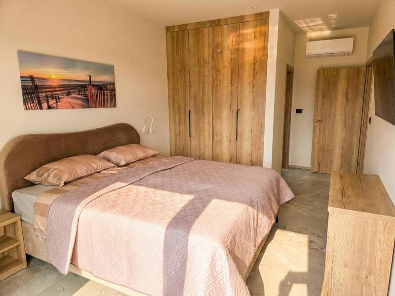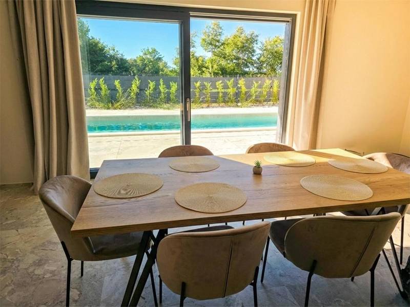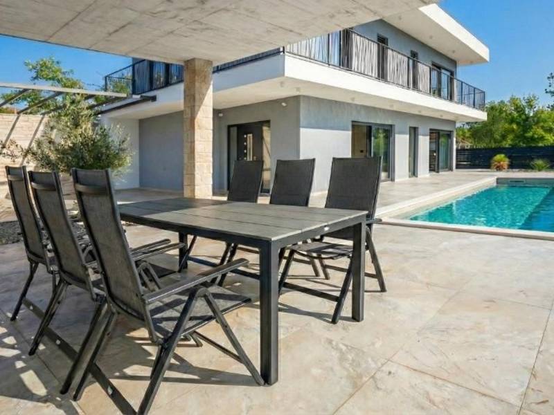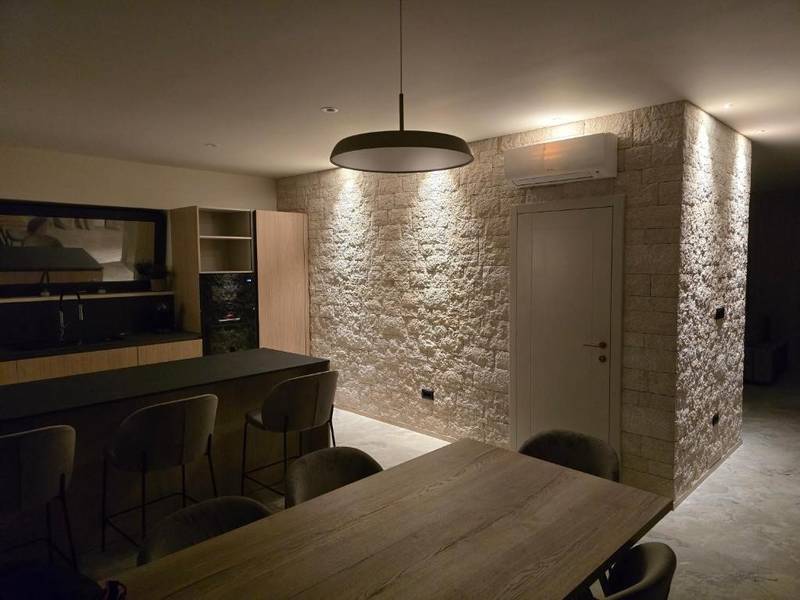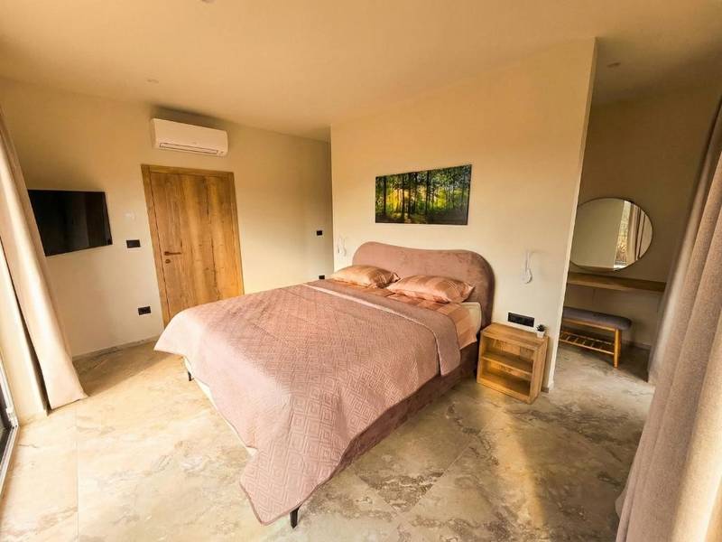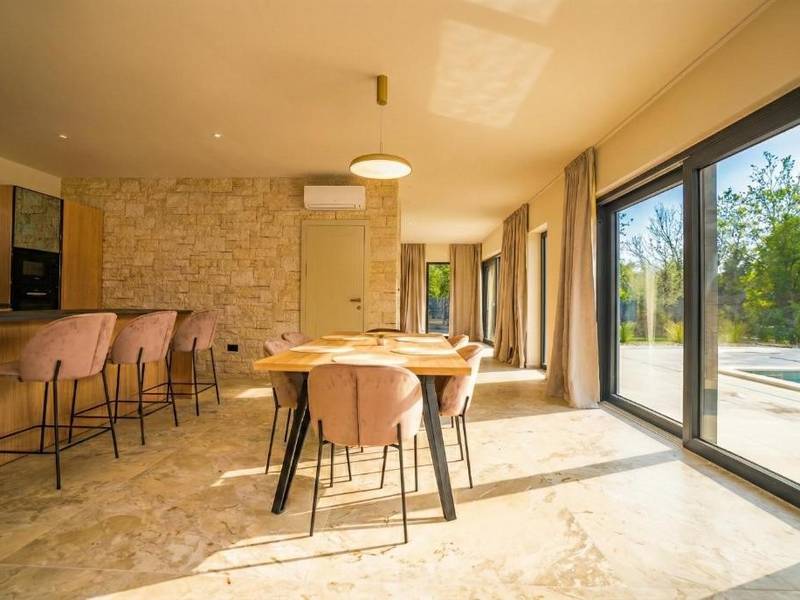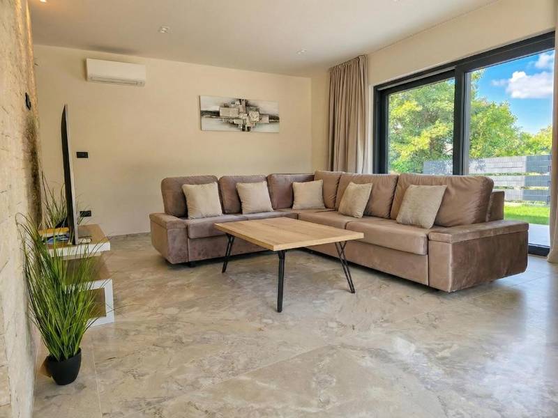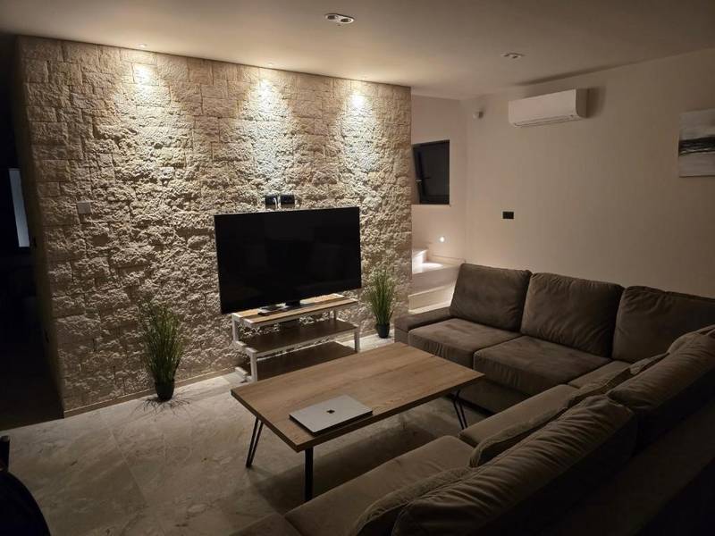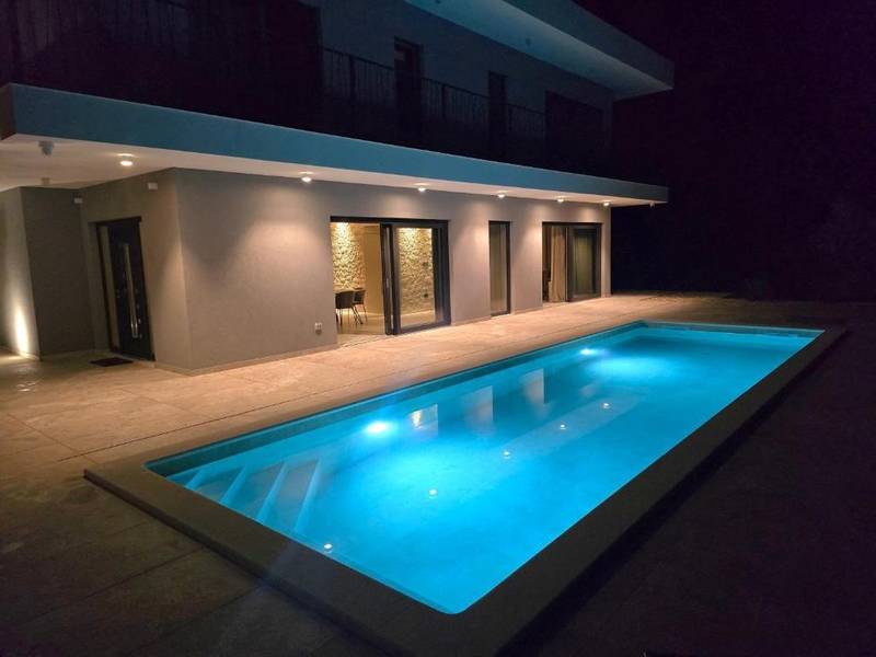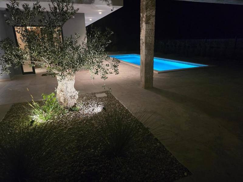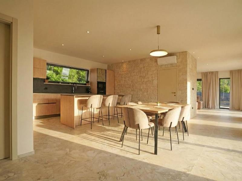 Die Kombination von modernem Design mit warmen Steinwänden und Holzdetails schafft ein Gefühl von Gemütlichkeit und Luxus. Im Erdgeschoss gibt es ein geräumiges, offenes Wohnzimmer mit einem großen, bequemen Sofa und Smart-TV, eine voll ausgestattete Küche, während eine große Insel mit Barhockern ein wunderbarer Ort für Ihren Morgenkaffee ist. In der ersten Etage befinden sich 3 moderne Schlafzimmer, die alle mit bequemen Betten und Klimaanlage ausgestattet sind. Die Gäste haben Zugang zu drei modernen Badezimmern mit Duschen sowie zu einer zusätzlichen Gästetoilette, die für zusätzlichen Komfort sorgt. Das Zentrum des Außenbereichs ist ein langer privater Swimmingpool, der von wunderschönen Olivenbäumen umgeben ist, die nachts beleuchtet werden und eine magische mediterrane Atmosphäre schaffen. Ein überdachter Essbereich im Freien ermöglicht es Ihnen, das Frühstück an der frischen Luft oder das Abendessen unter dem Sternenhimmel zu genießen. Auf dem Grundstück gibt es einen sicheren Parkplatz, und Sie haben exklusiven Zugang zum gesamten Haus und zum Pool, so dass Sie während Ihres Aufenthalts vollkommene Privatsphäre genießen können.