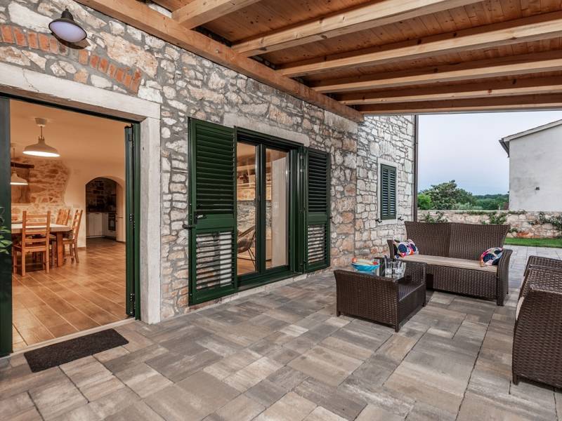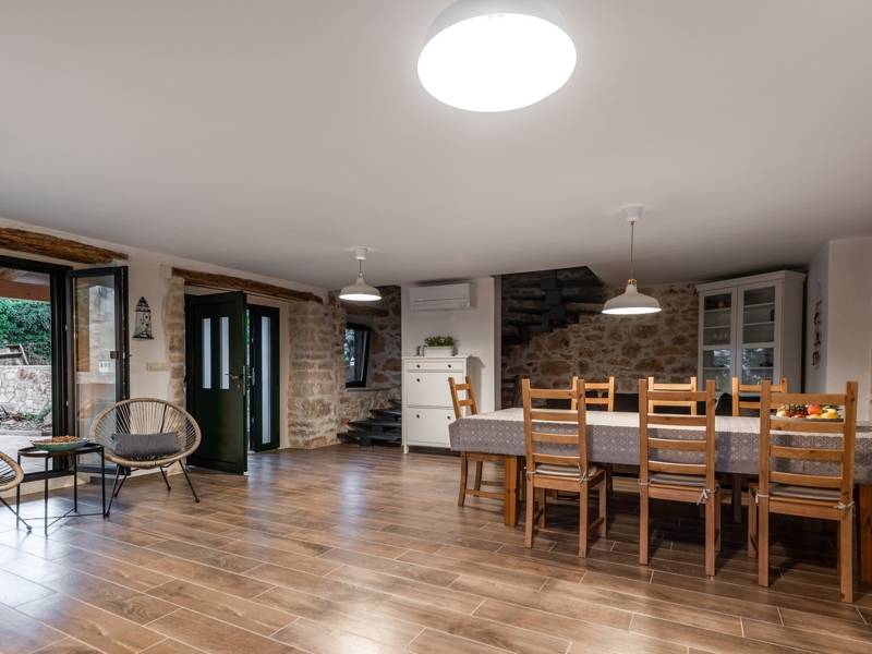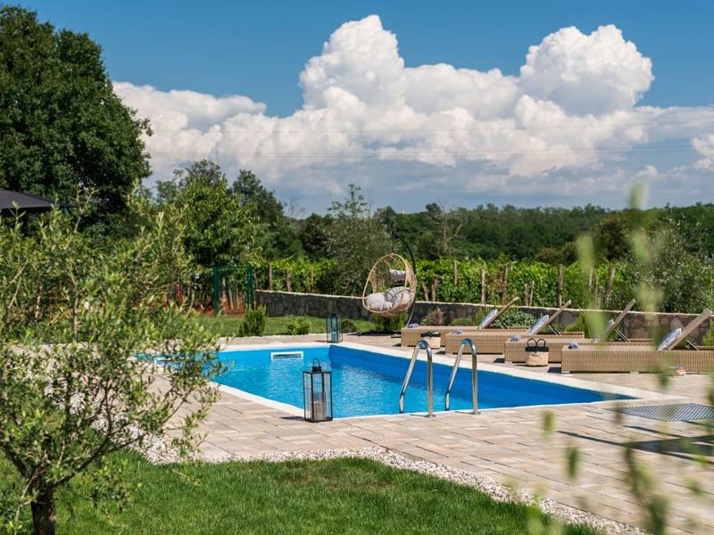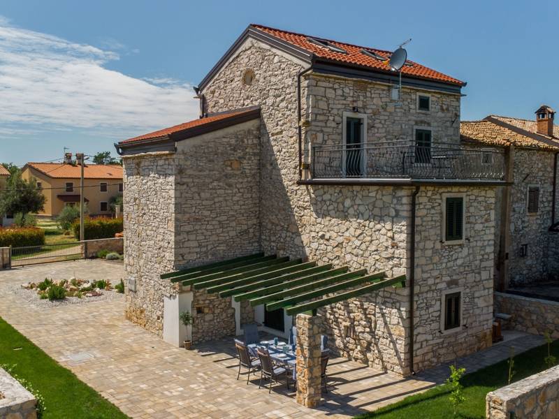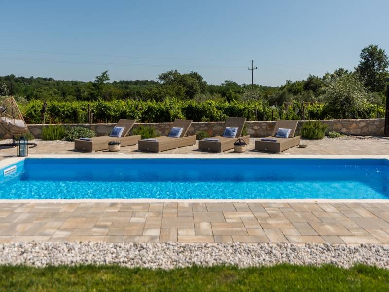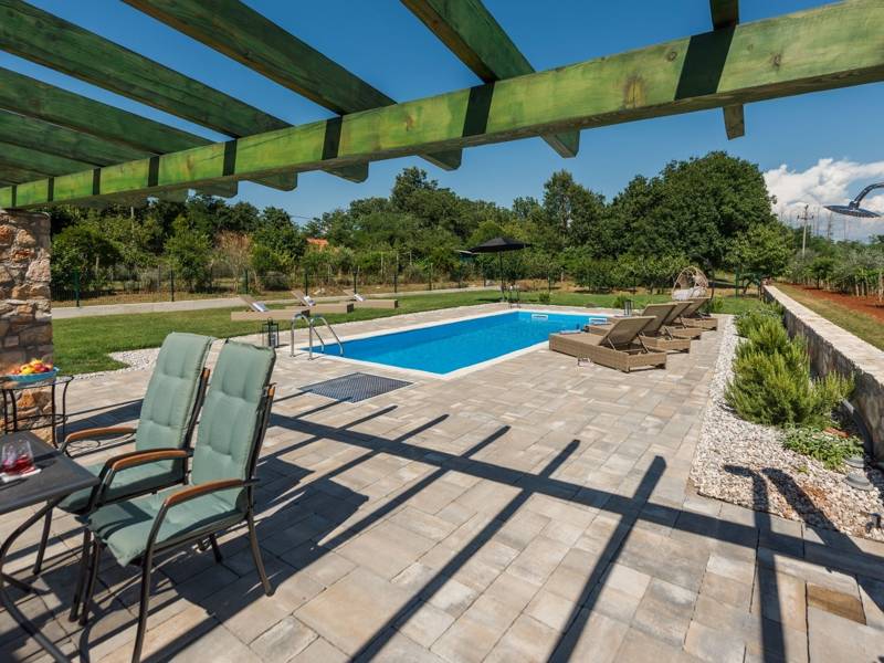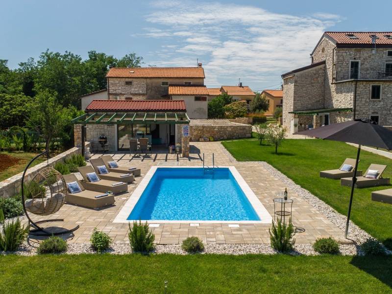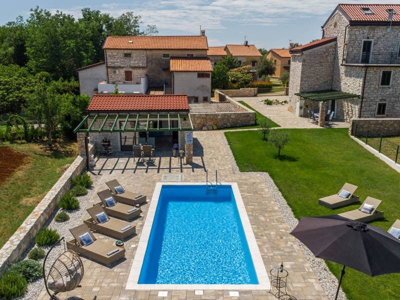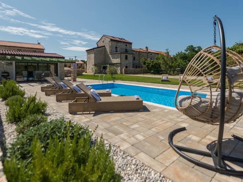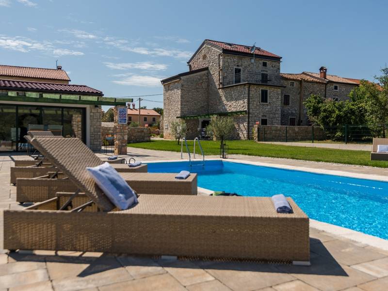 Entspannen und erholen Sie sich in der schönen Villa Francesca, die in der ruhigen Natur des Nordens von Istrien, nicht weit von Umag, liegt. Diese rustikale Villa kann bis zu 8 Personen beherbergen und ist somit die perfekte Wahl für ein Familientreffen oder eine größere Gruppe von Freunden. Die vollklimatisierte Steinvilla bietet alles, was Sie für einen unvergesslichen Urlaub brauchen könnten. Es stehen Ihnen vier charmante Schlafzimmer zur Verfügung, zwei mit Doppelbetten und zwei mit Einzelbetten, jeweils mit eigenem Bad. Im geräumigen Erdgeschoss befindet sich eine voll ausgestattete, rustikale Küche, in der Sie köstliche Mahlzeiten zubereiten können, die Sie am Esstisch im Wohnzimmer servieren können. Das geräumige Wohnzimmer verfügt über große Glastüren, die einen direkten Zugang zur überdachten Terrasse mit Sitzecke und zum Hof ermöglichen. Im geräumigen Garten befindet sich ein wunderschöner Swimmingpool mit dazugehörigen Liegestühlen, um den ganzen Tag in der mediterranen Sonne zu genießen. Neben dem Pool gibt es ein Poolhaus, in dem Sie eine Sauna, ein Fitnessgerät und einen Heimtrainer finden. Außerdem gibt es einen Esstisch im Freien, an dem Sie die auf dem Holzgrill zubereiteten Mahlzeiten servieren können.