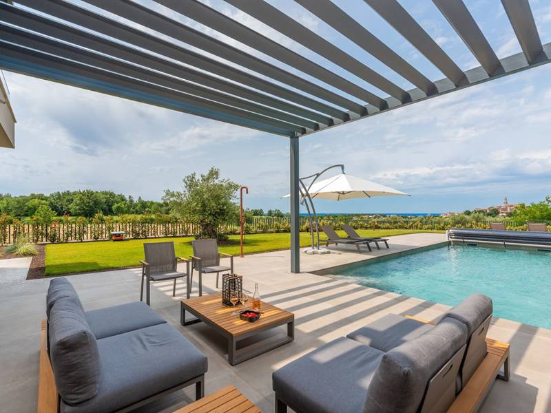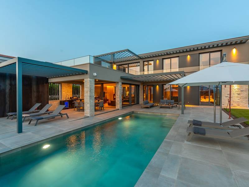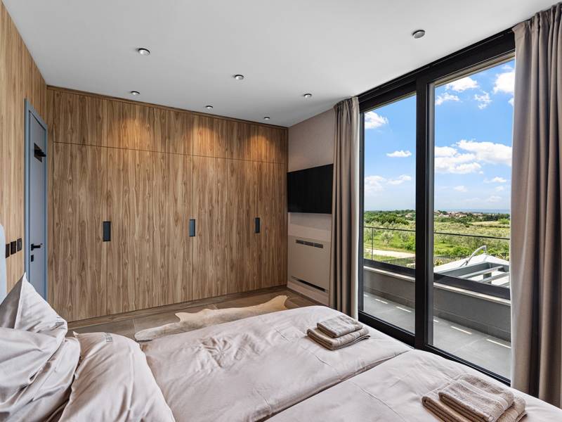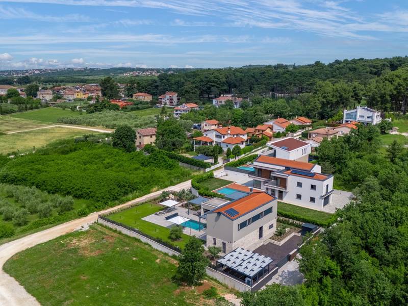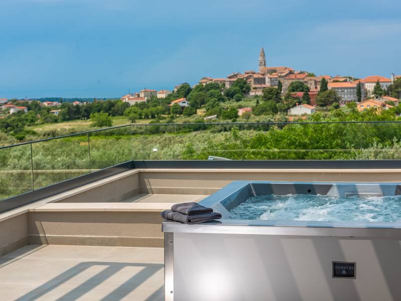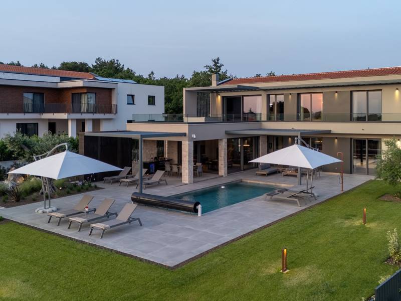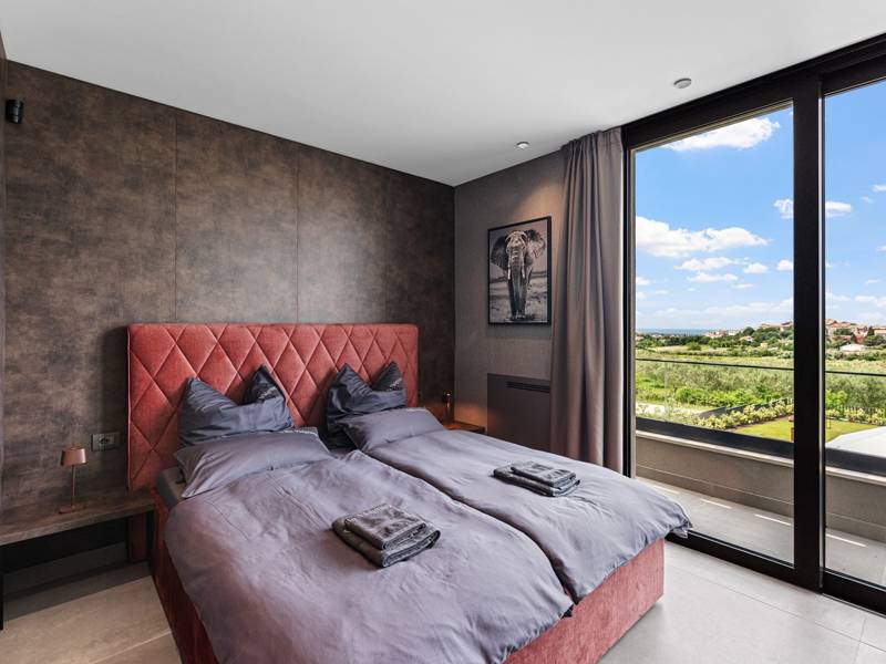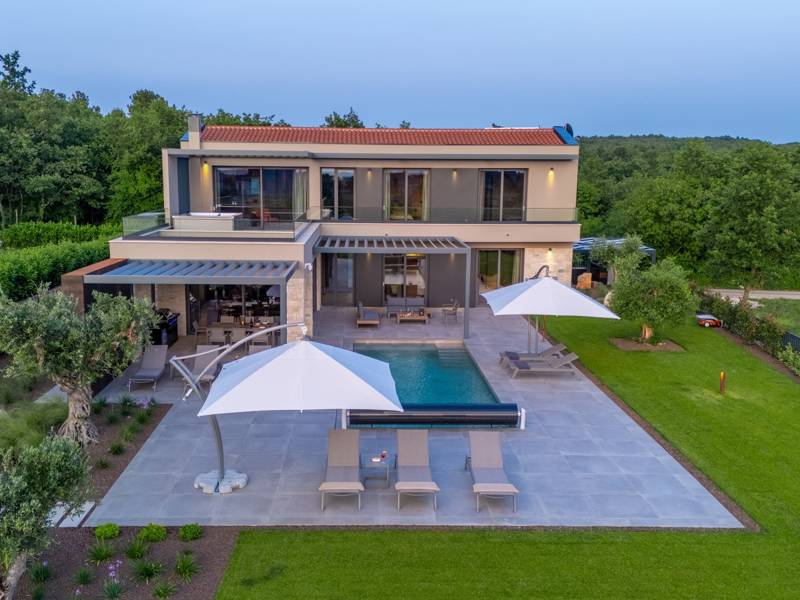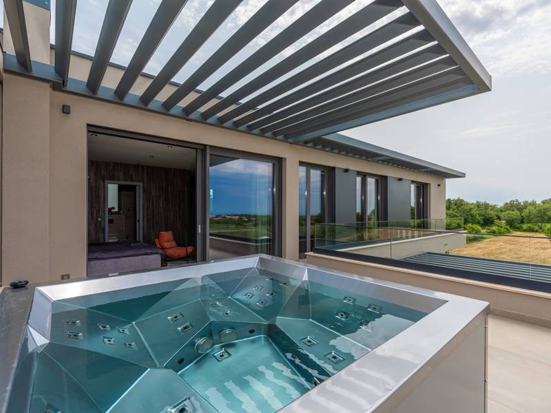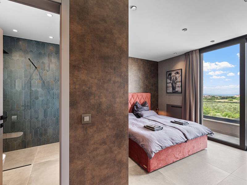 In der ruhigen Stadt Višnjan im Herzen von Istrien gelegen, bietet die Villa Visignano die perfekte Mischung aus Luxus, Komfort und moderner Eleganz. Diese geräumige Villa mit 230 m2 bietet Platz für bis zu 8 Personen und befindet sich auf einem vollständig umzäunten Grundstück von 1.144 m2, ideal für einen ruhigen und sicheren Aufenthalt. Im Erdgeschoss befindet sich ein elegantes, offenes Wohnzimmer mit Kamin, eine voll ausgestattete moderne Küche und ein Essbereich mit Zugang zur überdachten Sommerküche und einer großen Sonnenterrasse mit beheiztem Privatpool (49 m2). Auf dieser Etage befinden sich auch eine Sauna und ein Schlafzimmer mit eigenem Bad. In der ersten Etage befinden sich drei stilvoll eingerichtete Schlafzimmer, jedes mit eigenem Bad und Zugang zu einer Terrasse. Das Hauptschlafzimmer zeichnet sich durch eine geräumige Terrasse mit Jacuzzi und atemberaubendem Blick auf das Meer und die Landschaft aus. Die Villa ist voll klimatisiert und mit Fußbodenheizung, Waschmaschine, Trockner, Smart TV in jedem Zimmer und kostenlosem Wi-Fi ausgestattet. Die Gäste haben Zugang zu drei privaten Parkplätzen, einem Gasgrill, Sonnenliegen und Sonnenschirmen. Haustiere sind nicht erlaubt, und die Villa ist nicht für Jugendgruppen, sondern nur für Familien mit Kindern geeignet. Dank ihrer Lage ist die Villa Visignano die perfekte Wahl für Gäste, die die Schönheit Istriens erkunden möchten - das Meer ist nur 13 km entfernt, und Restaurants, Geschäfte und das Stadtzentrum sind nur 500 m entfernt.