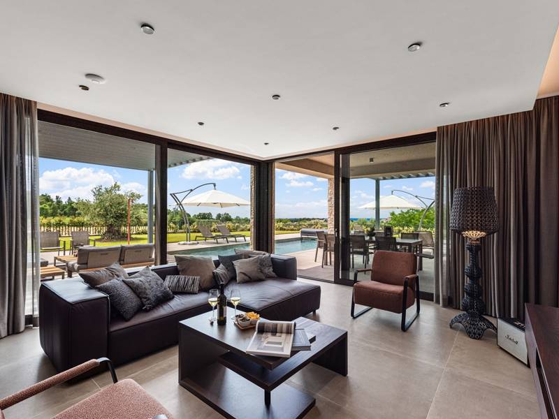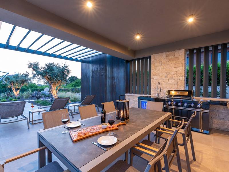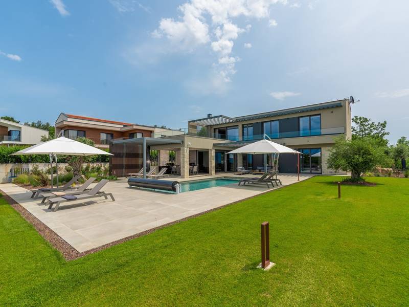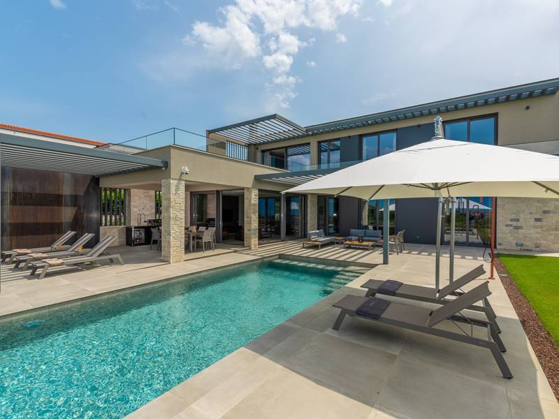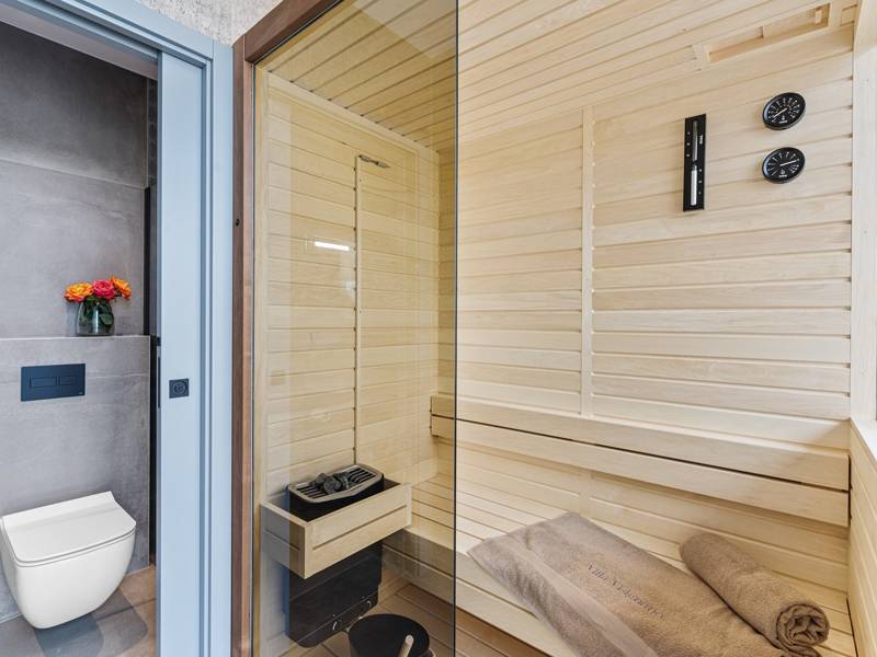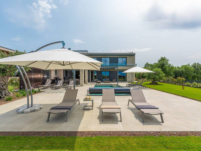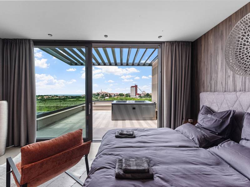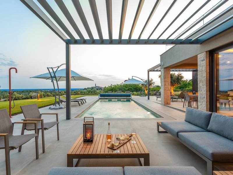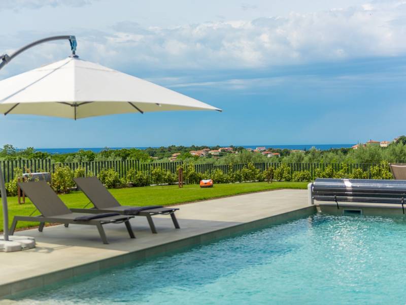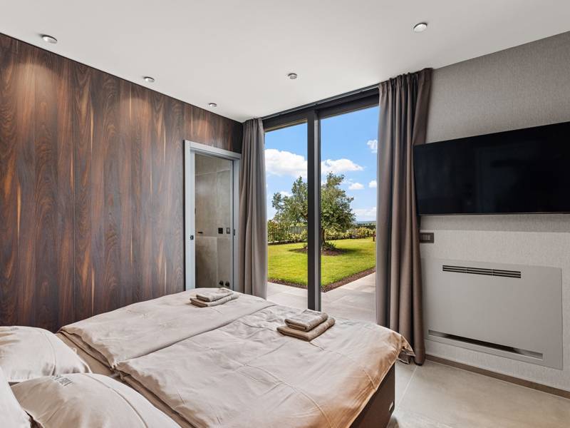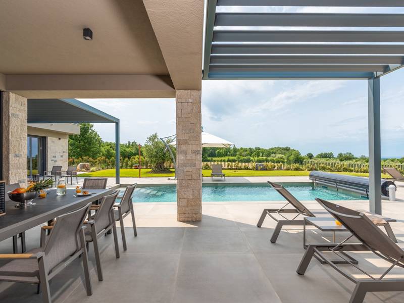 In der ruhigen Stadt Višnjan im Herzen von Istrien gelegen, bietet die Villa Visignano die perfekte Mischung aus Luxus, Komfort und moderner Eleganz. Diese geräumige Villa mit 230 m2 bietet Platz für bis zu 8 Personen und befindet sich auf einem vollständig umzäunten Grundstück von 1.144 m2, ideal für einen ruhigen und sicheren Aufenthalt. Im Erdgeschoss befindet sich ein elegantes, offenes Wohnzimmer mit Kamin, eine voll ausgestattete moderne Küche und ein Essbereich mit Zugang zur überdachten Sommerküche und einer großen Sonnenterrasse mit beheiztem Privatpool (49 m2). Auf dieser Etage befinden sich auch eine Sauna und ein Schlafzimmer mit eigenem Bad. In der ersten Etage befinden sich drei stilvoll eingerichtete Schlafzimmer, jedes mit eigenem Bad und Zugang zu einer Terrasse. Das Hauptschlafzimmer zeichnet sich durch eine geräumige Terrasse mit Jacuzzi und atemberaubendem Blick auf das Meer und die Landschaft aus. Die Villa ist voll klimatisiert und mit Fußbodenheizung, Waschmaschine, Trockner, Smart TV in jedem Zimmer und kostenlosem Wi-Fi ausgestattet. Die Gäste haben Zugang zu drei privaten Parkplätzen, einem Gasgrill, Sonnenliegen und Sonnenschirmen. Haustiere sind nicht erlaubt, und die Villa ist nicht für Jugendgruppen, sondern nur für Familien mit Kindern geeignet. Dank ihrer Lage ist die Villa Visignano die perfekte Wahl für Gäste, die die Schönheit Istriens erkunden möchten - das Meer ist nur 13 km entfernt, und Restaurants, Geschäfte und das Stadtzentrum sind nur 500 m entfernt.